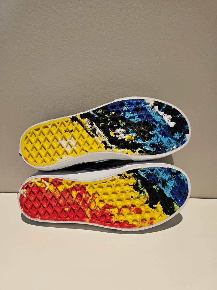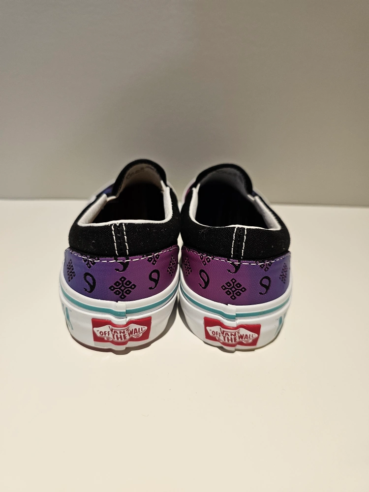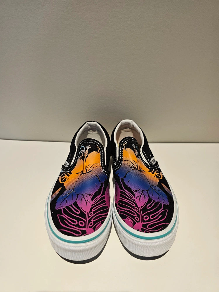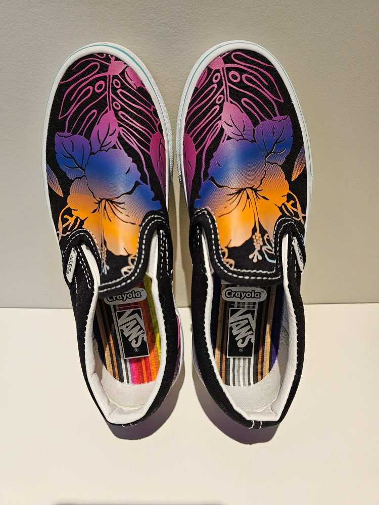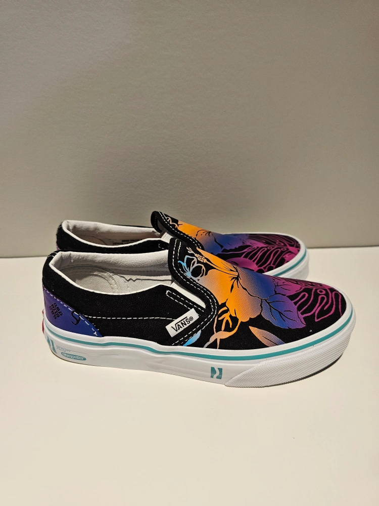 SIZE 2 These Vans slip-ons are a collaboration with Crayola and feature a really cool, colourful design! The uppers have a black base with vibrant floral and leaf patterns in pink, orange, and blue. The soles have a unique paint-splatter look, with yellow on one and red on the other. They're in great shape and ready for a new home!