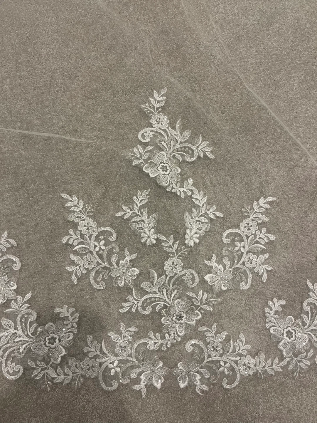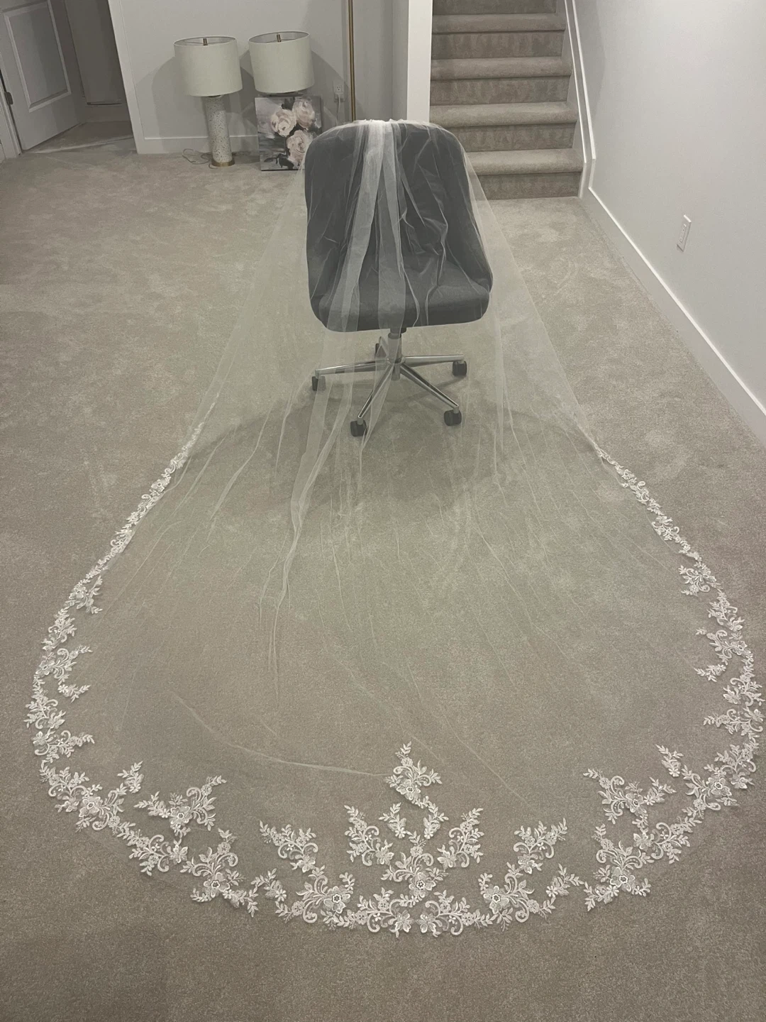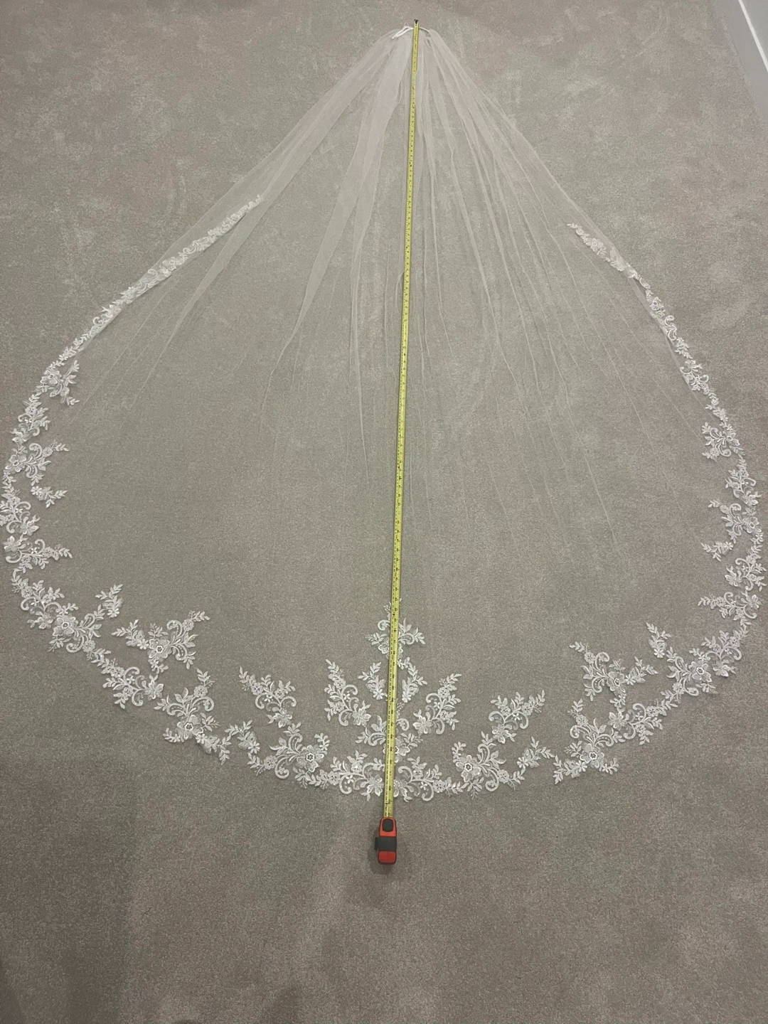 60Brand new, never worn Beautiful very long wedding veil with delicate floral lace trim. The lace detailing is really lovely and adds a touch of elegance. Approximately 2.79m