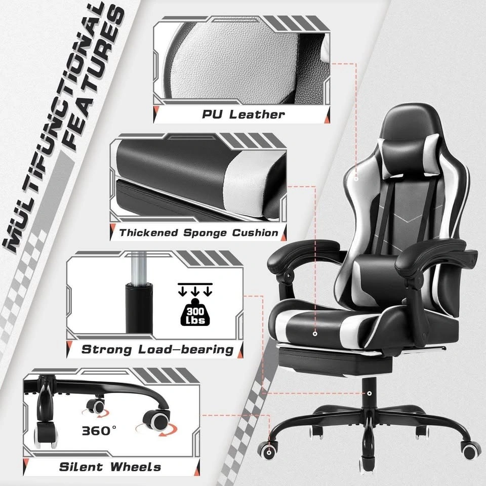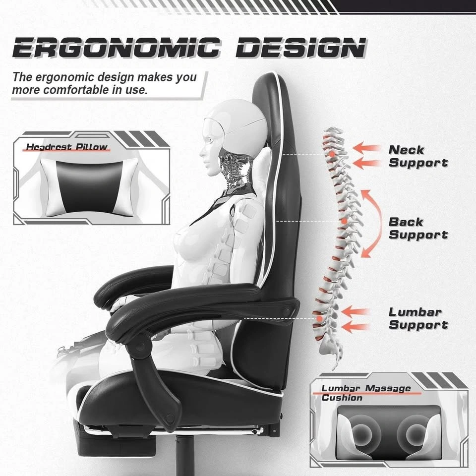 94Brand new Furmax high back white PU leather massage gaming chair with footrest, model CR30710. Designed for long gaming or work sessions with thick sponge padding and smooth PU leather upholstery. Built-in vibration massage helps relieve lower back fatigue. Adjust the backrest from 90° to 165°. Extend the retractable footrest to stretch out. Features padded armrests, removable headrest, and height-adjustable seat (17.3”–20.5”). Supported by a heavy-duty steel frame and 5-star base with 360° swivel casters. Easy assembly with all tools and instructions included. Dimensions: 30.5”L × 24.5”W × 50.5”H. Seat Height Range: 17.3” – 20.5”. Recline Angle: 90° – 165°. Material: PU Leather, Steel Frame. Color: White. Weight Capacity: 300 lbs. Pickup at Hurontario & Sandalwood, Brampton. Perfect for gamers or professionals!