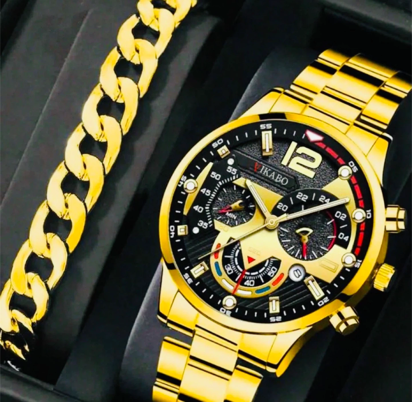 10Selling a stylish IKABO men's wristwatch in gold. It features a detailed chronograph design with a black and gold face. matching the watch face perfectly. It's in great brand new condition and ready for a new owner!