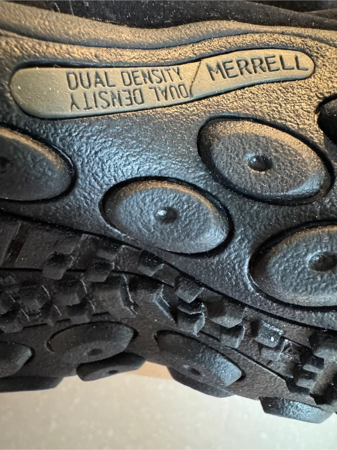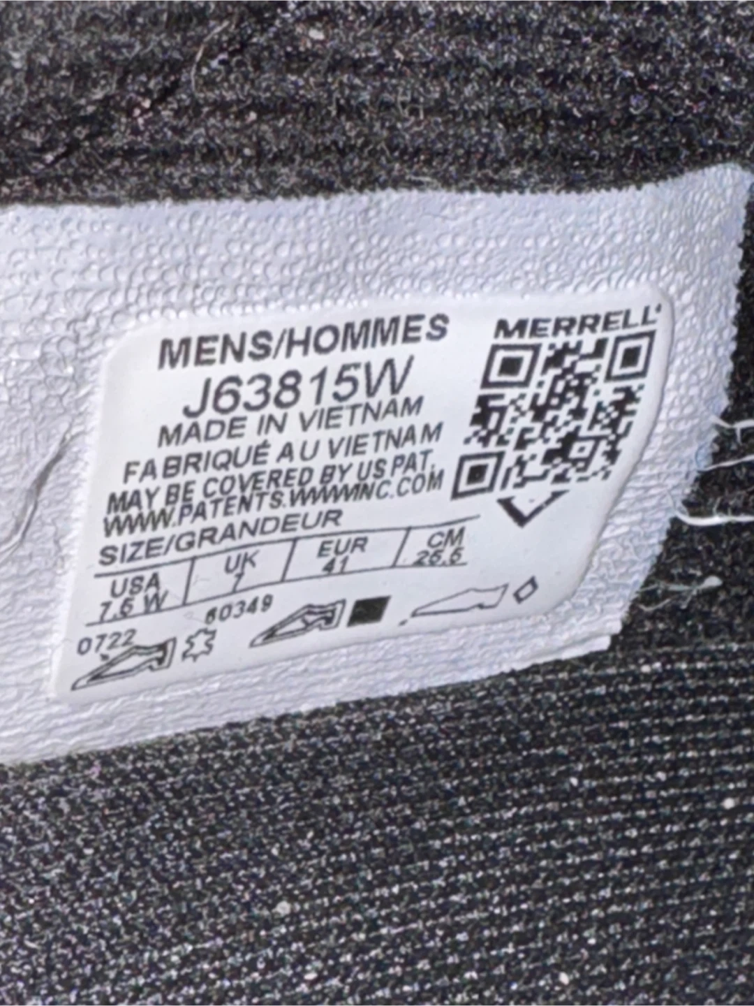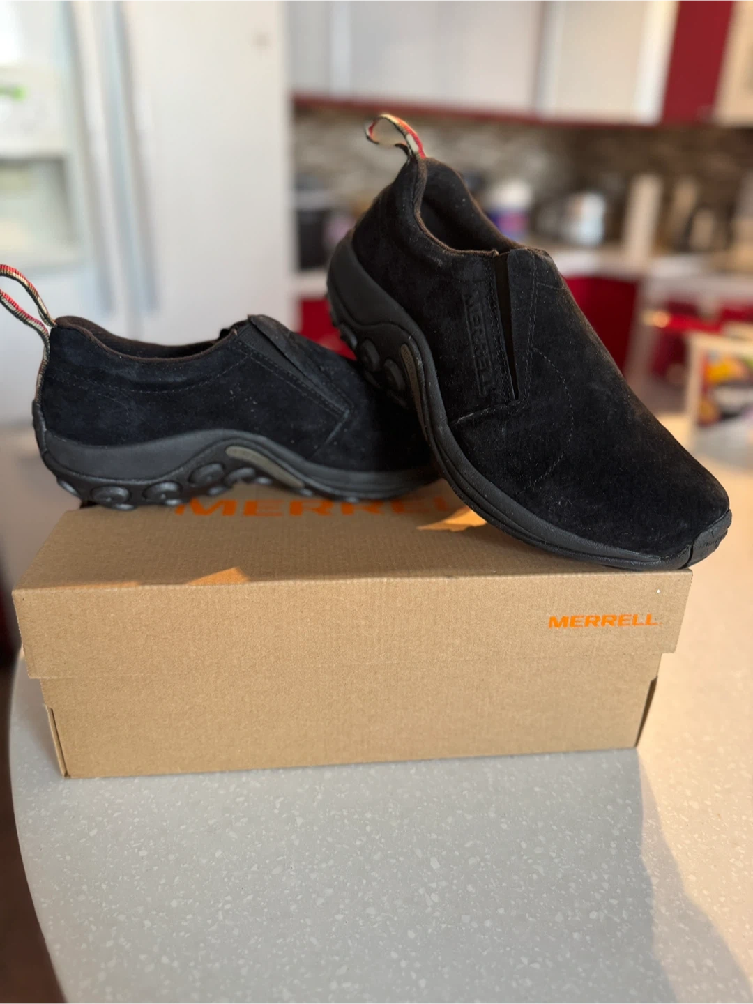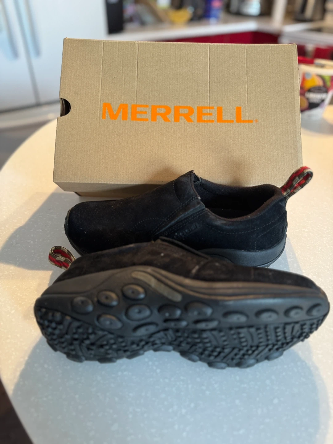 Selling a pair of Merrell slip-on shoes in black. These are a men's size 7.5W (US). The model number is J63815W. They come with the original box too!