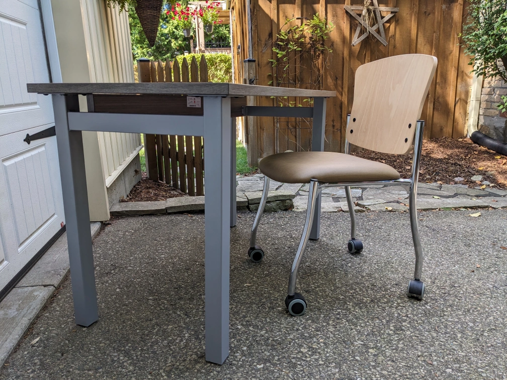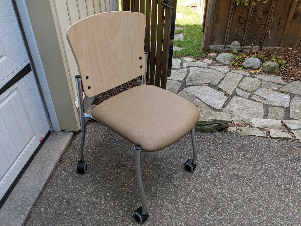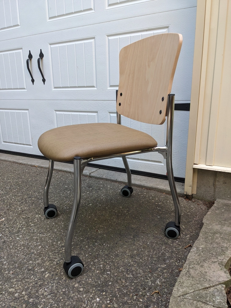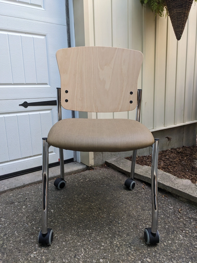This is a brand new modern Naiki office chair and features a light coloured wooden backrest, a beige upholstered seat and a chrome-plated frame with smooth rolling casters for mobility. The light and neutral colours will pair nicely in a modern space. This retails with Staples Business Advantage for $210 + tax. Please see our other ad for a modern table desk that could pair nicely with this chair. Measures: Seat height - 19.5" x 18" W Overall chair width - 19.5 " W Curbside delivery is available for an additional fee, depending on location. The delivery fee must be prepaid; the remaining balance is due upon delivery.