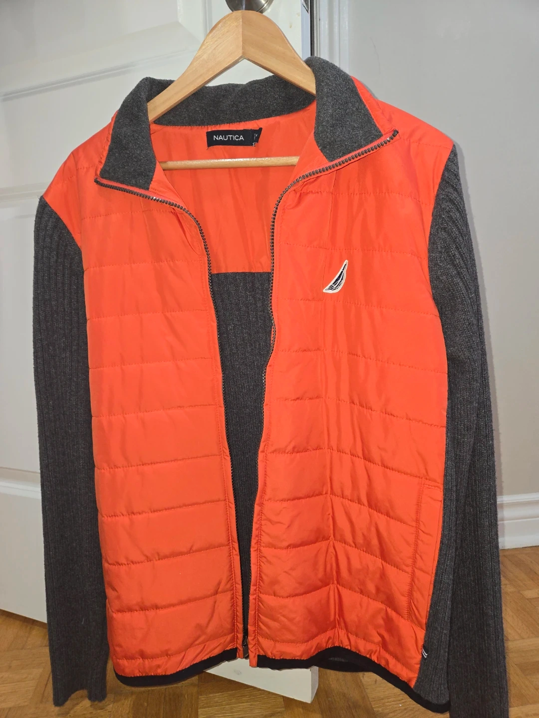 10Selling a stylish Nautica vest! It features a vibrant orange quilted body and cozy grey knit sleeves. It's a size M and, ready to add a colour to your wardrobe.