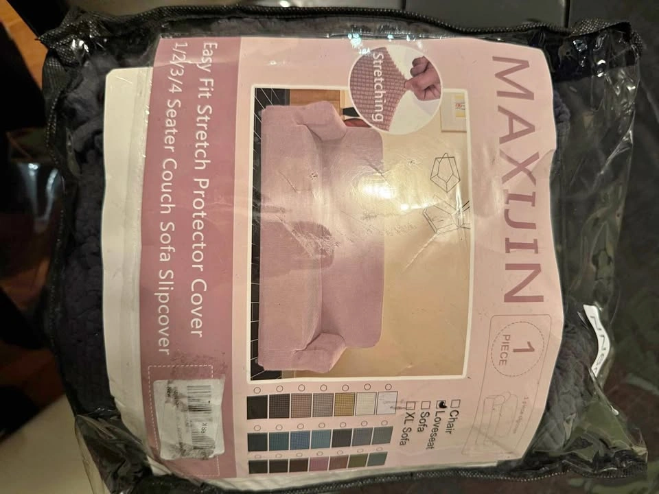 10New couch cover usually goes for around 40$ on Amazon  reason for selling is we ordered the wrong one/colour. See in pictures for colour and fit Info-MAXIJIN Super Stretch Couch Cover for 2 Cushion Couch, 1-Piece Universal Love Seat Covers Jacquard Spandex Sofa Protector Dogs Pet Friendly Fitted Loveseat Slipcover (Loveseat, Gray)