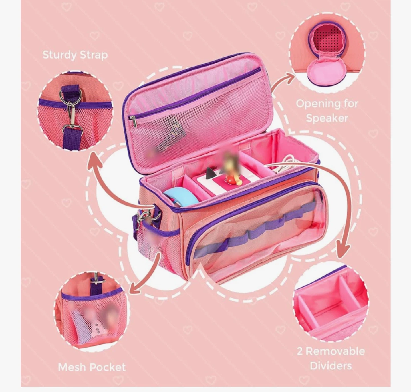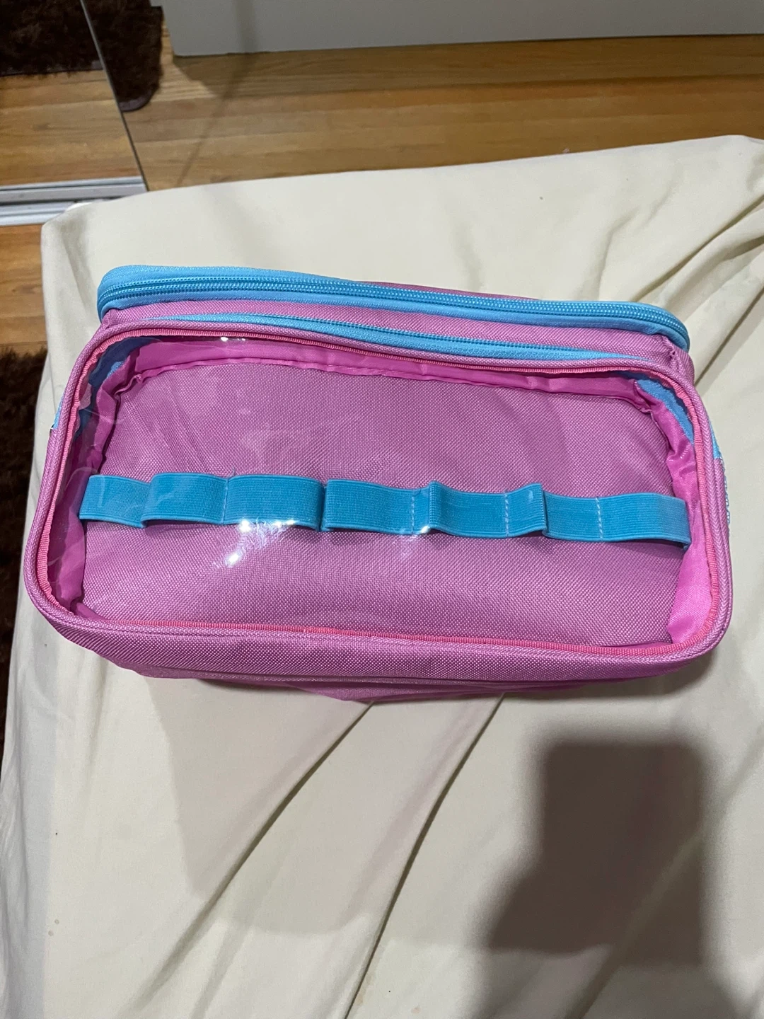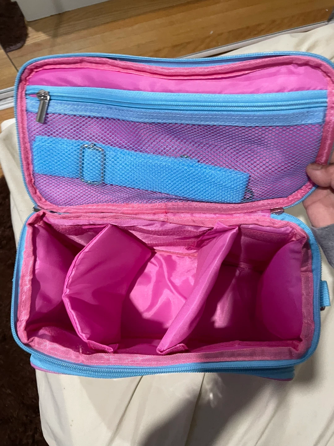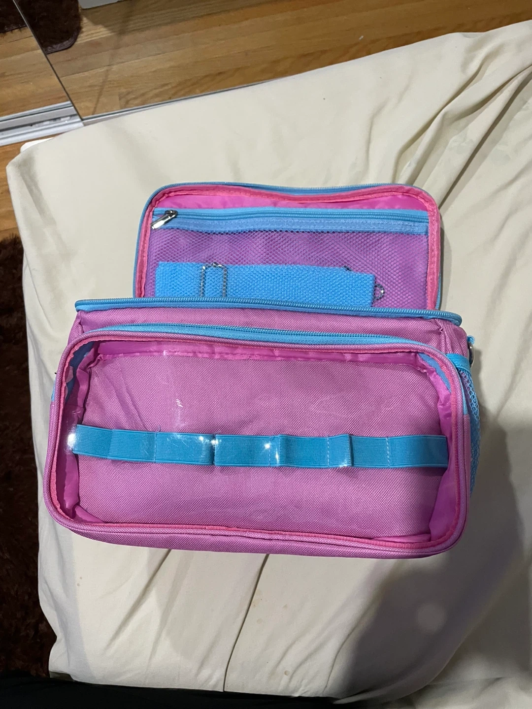70This cute pink and blue organizer bag is perfect for keeping your essentials tidy! It features a sturdy strap, a mesh pocket, and two removable dividers. The interior is spacious and has an opening for a speaker. Great for travel or everyday use!