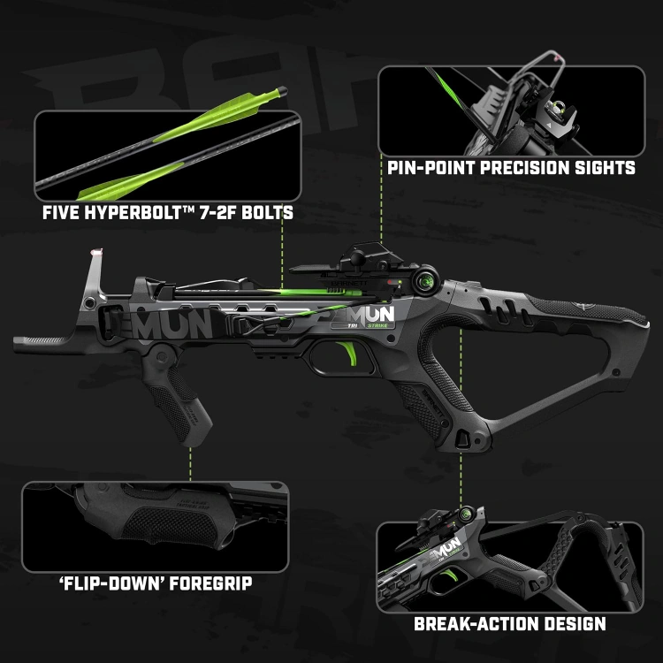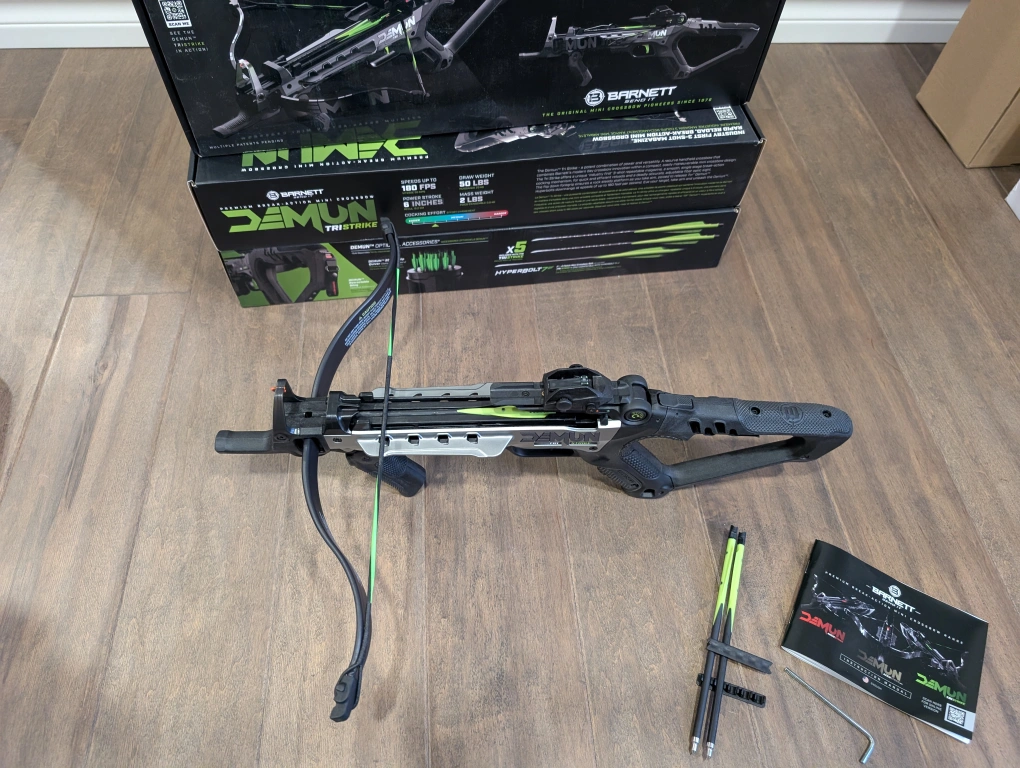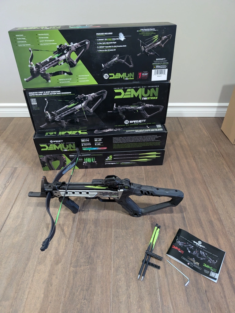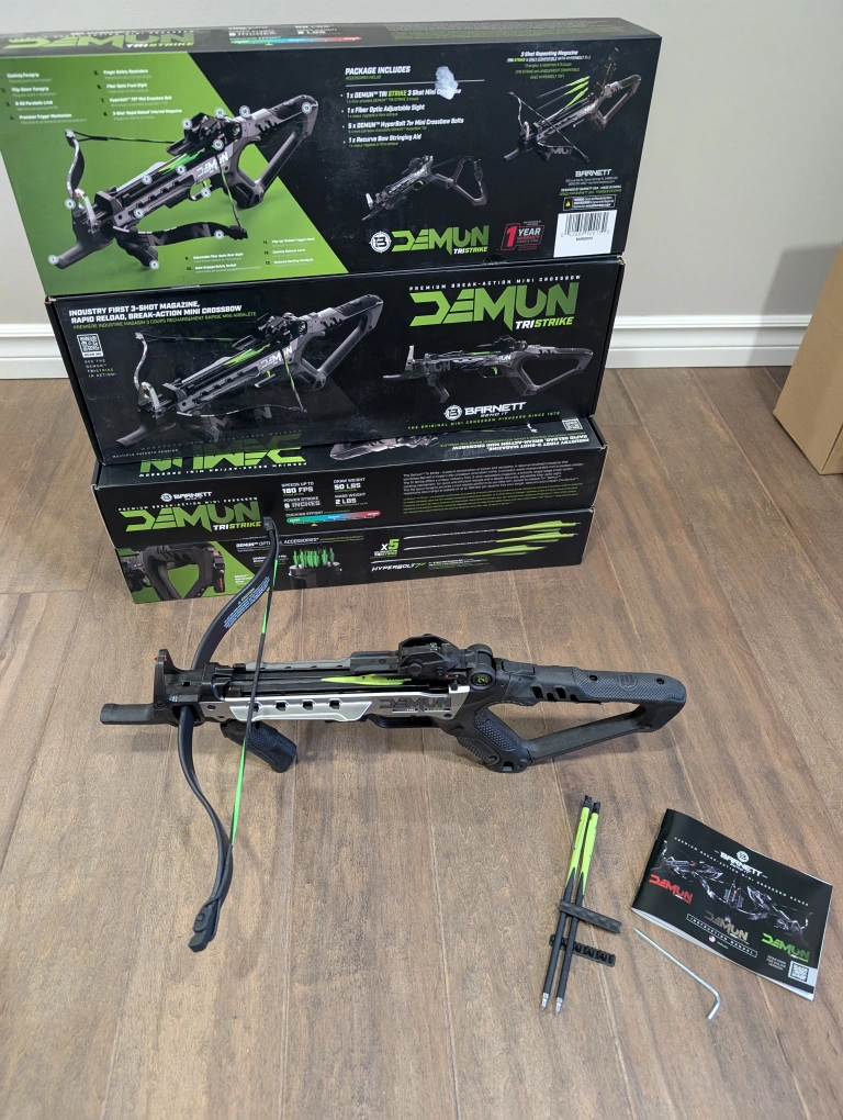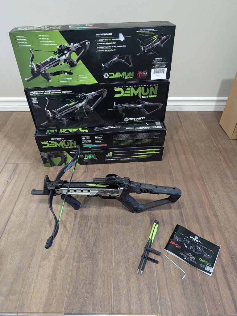 231Brand new, sealed Barnett Demun Tri Strike crossbows for sale. Compact break action pistol crossbow, 3 shot magazine, manual cocking, flip down foregrip, precision sights, 180fps, 7” inch bolts, ambidextrous, 5 bolts included, $110 FIRM each.