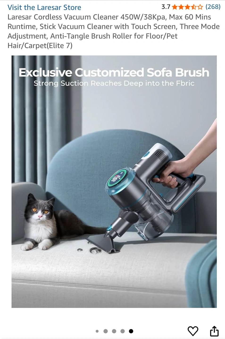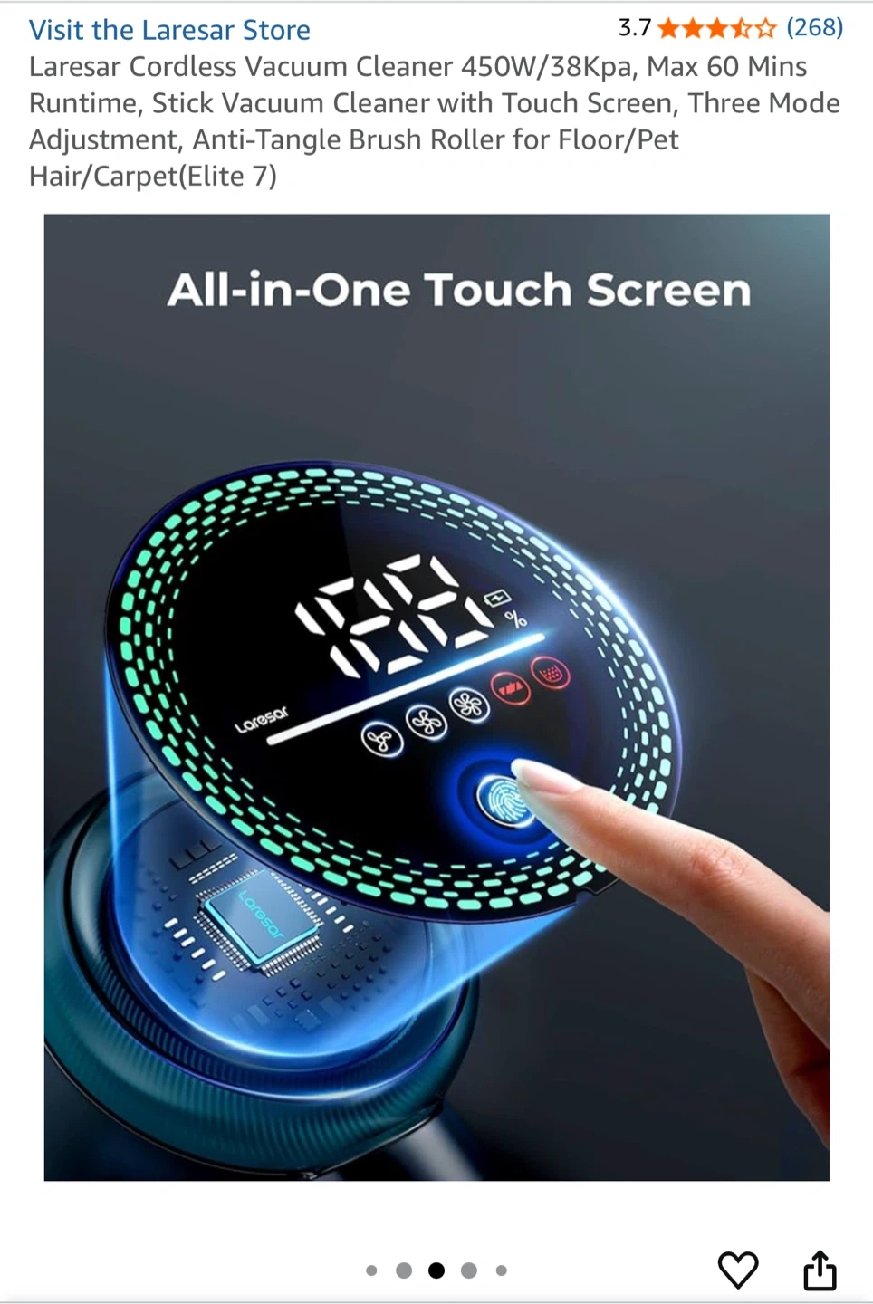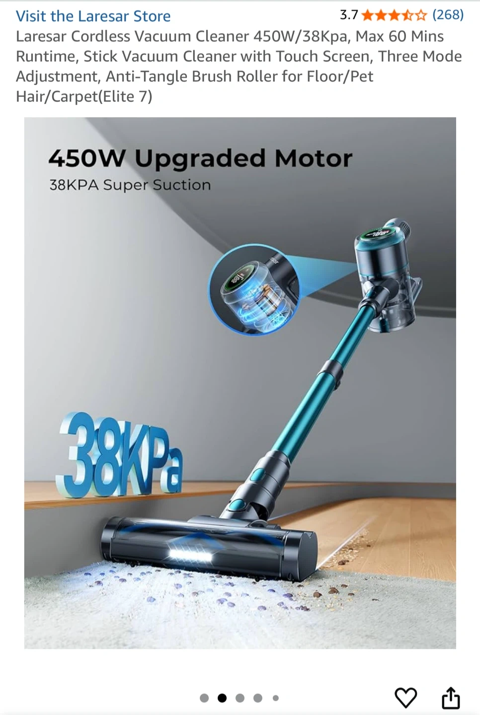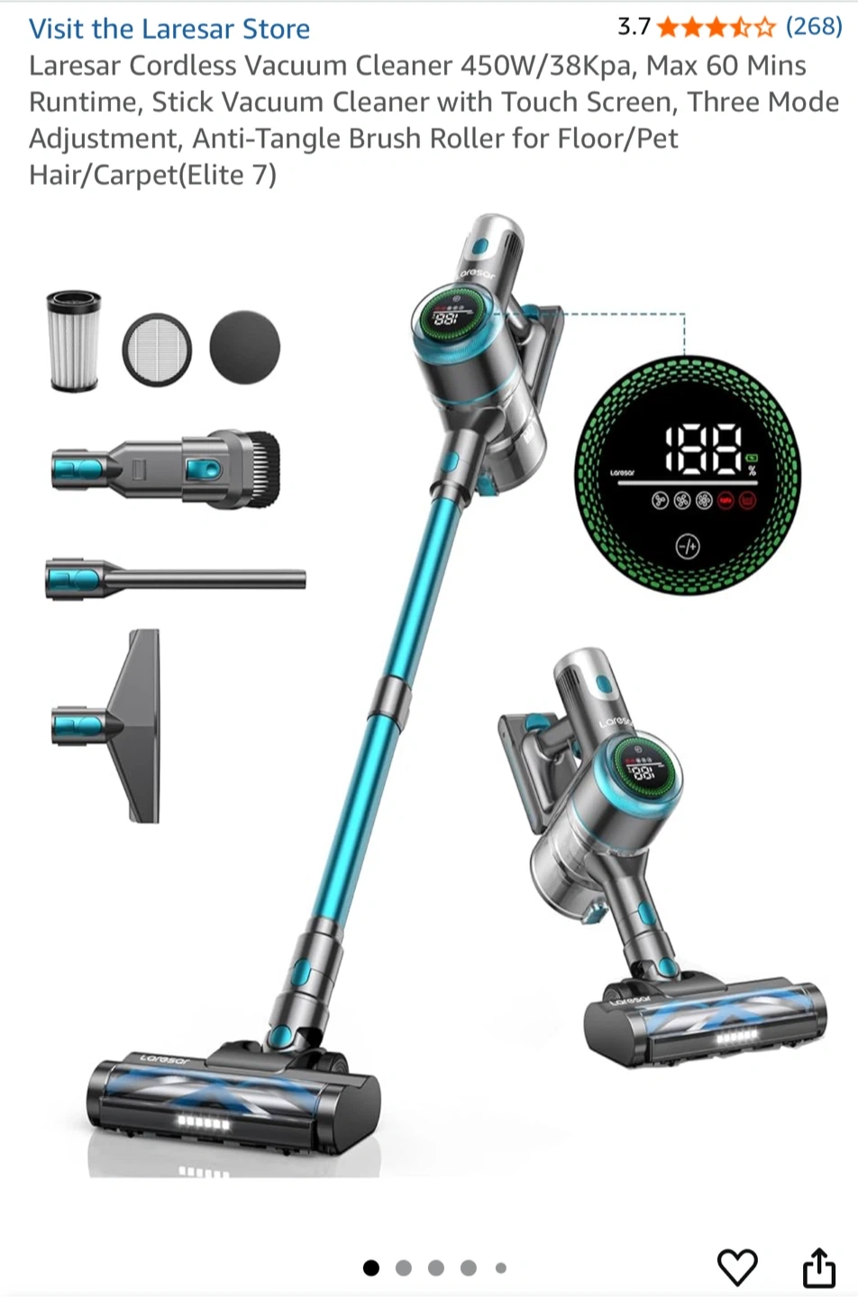 Selling a brand new sealed Laresar cordless vacuum cleaner! It has a powerful 450W motor with 38KPa super suction. It's a stick vacuum cleaner with a touchscreen and three mode adjustments. The anti-tangle brush roller is perfect for floors and pet hair. It can run for a maximum of 60 minutes.