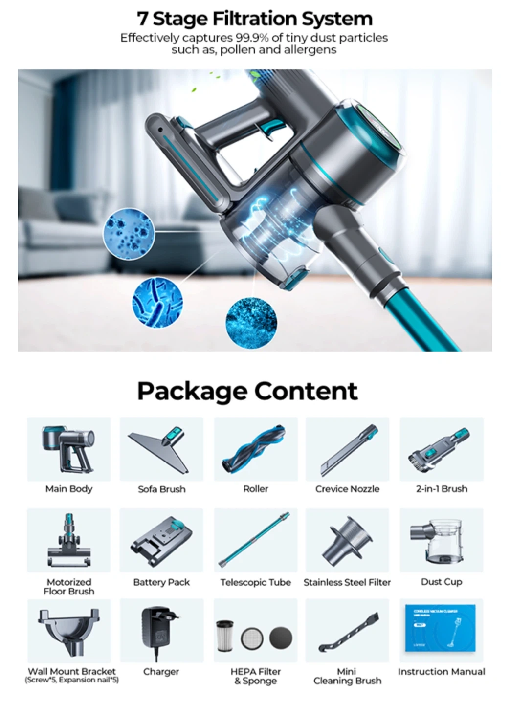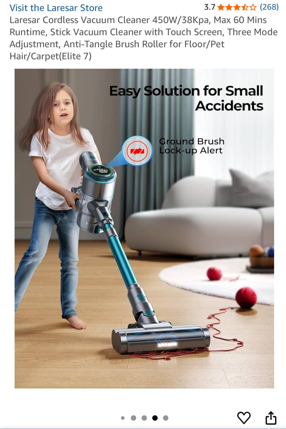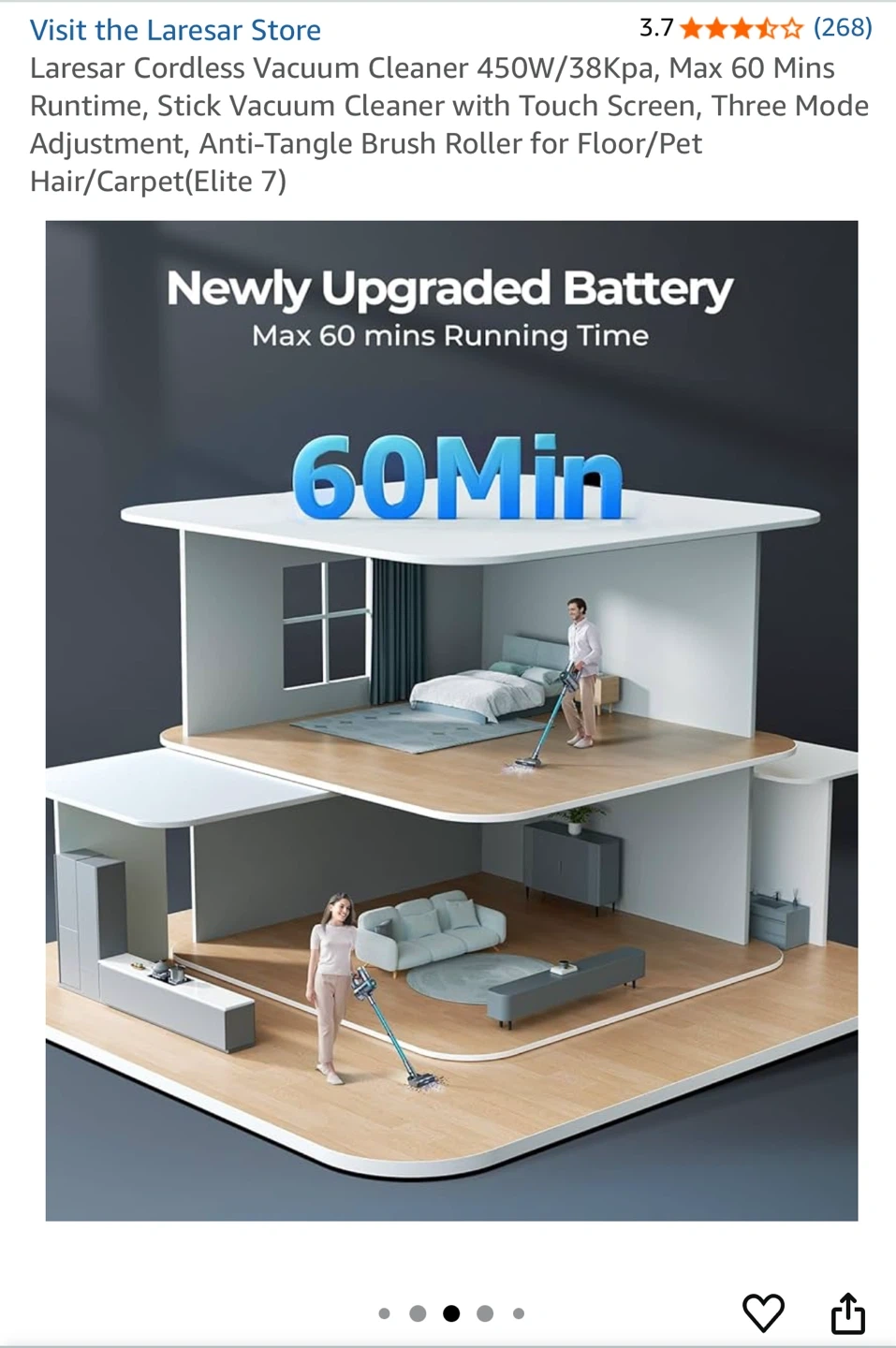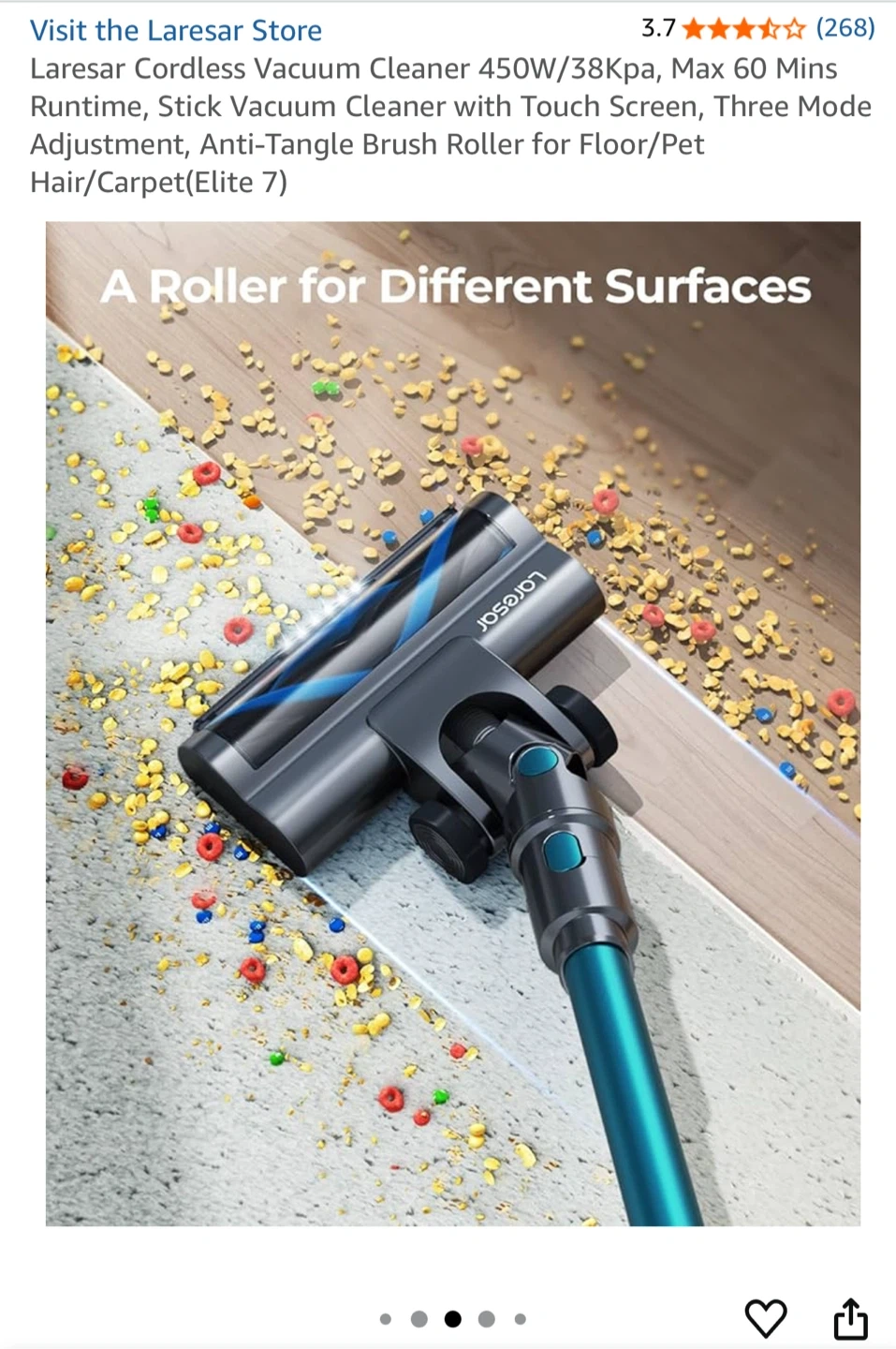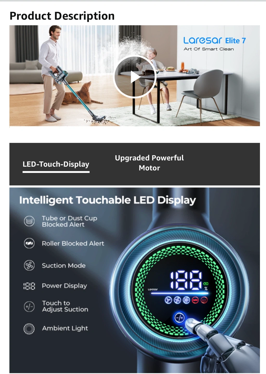 Selling a brand new sealed Laresar cordless vacuum cleaner! It has a powerful 450W motor with 38KPa super suction. It's a stick vacuum cleaner with a touchscreen and three mode adjustments. The anti-tangle brush roller is perfect for floors and pet hair. It can run for a maximum of 60 minutes.
