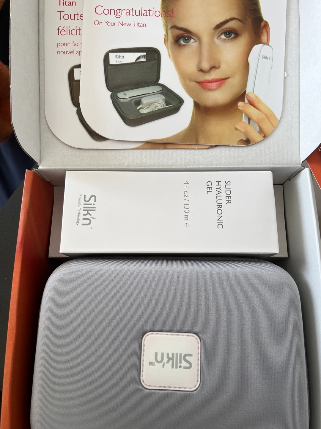 Silk'n Titan device for skin tightening and lifting. It reverses the effects of gravity and aging. The device combines 3 sources of energy (Bi-Polar RF + Red LED Light + IR Heat) to activate the body's natural restoration process. Comes with the box, charger, and Slider Hyaluronic Gel (4.4 oz / 130 ml exp 1/2026)