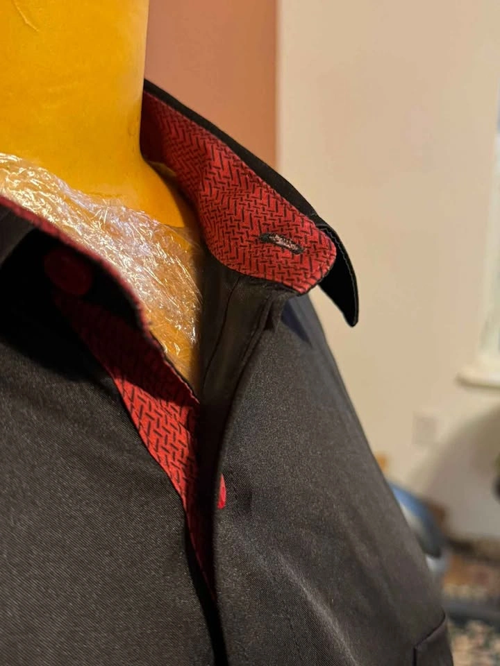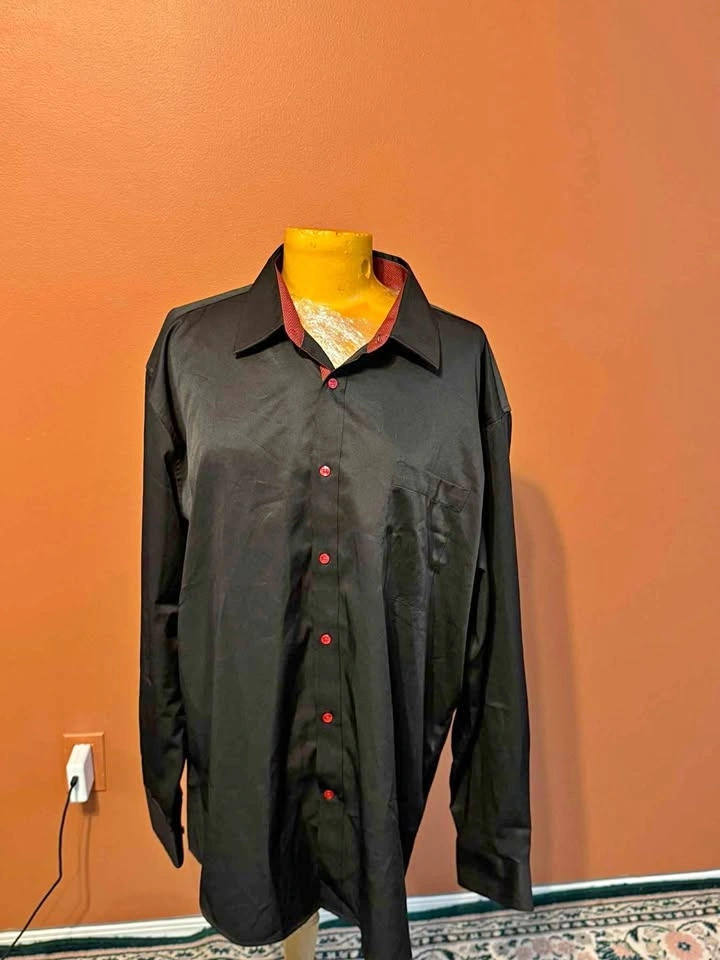 144Pick-up in Mission Only $10 Retail price $35–$40 This brand new men’s dress shirt (Size 2XL) features: ✔️ Sleek black fabric ✔️ Stylish red buttons ✔️ Red patterned inner collar (gives a sharp contrast look) ✔️ Long sleeves