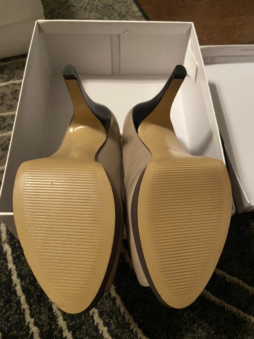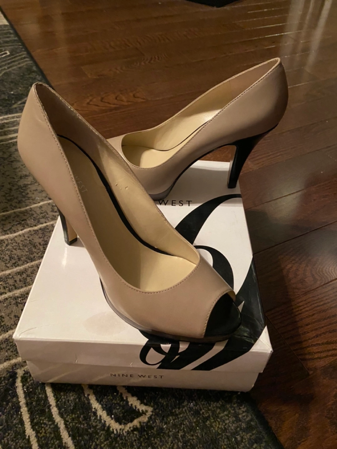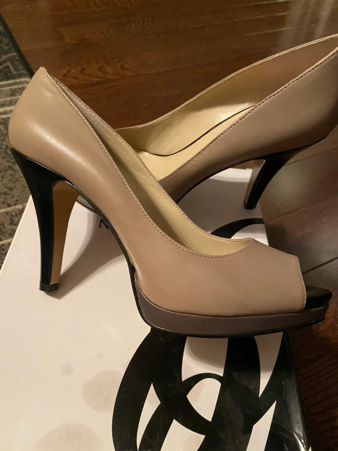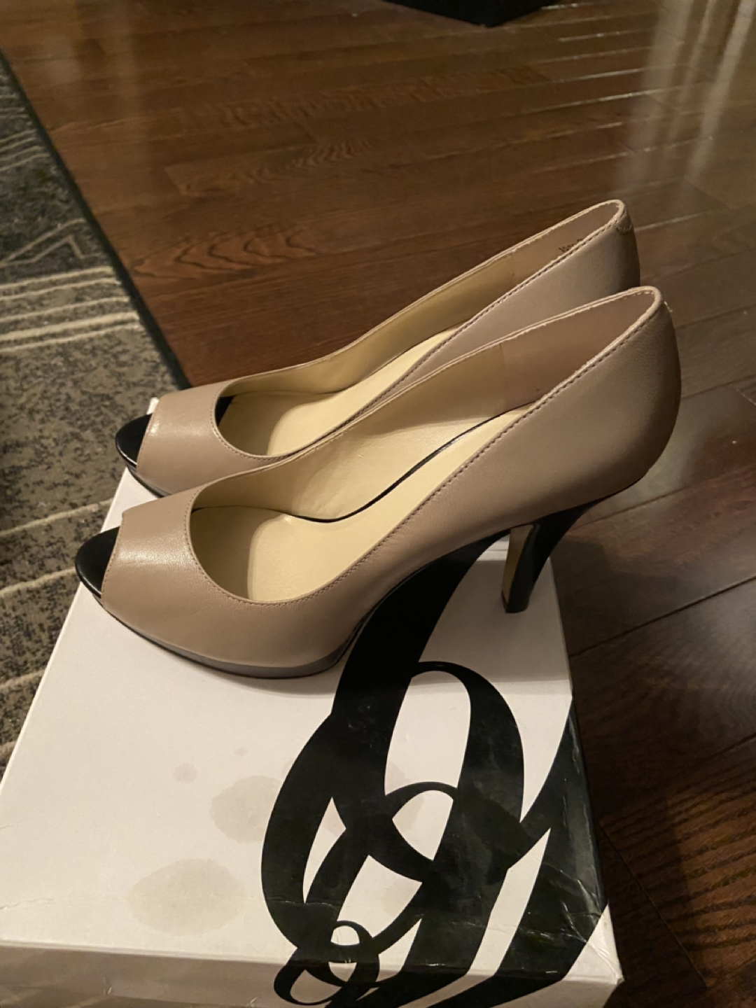 Brand new never used Nine West peeptoe heels in beige with black and grey