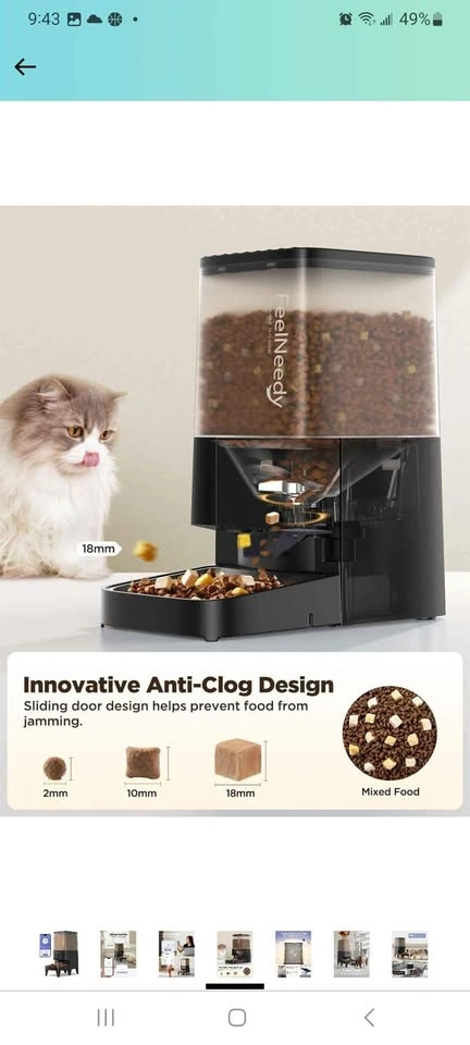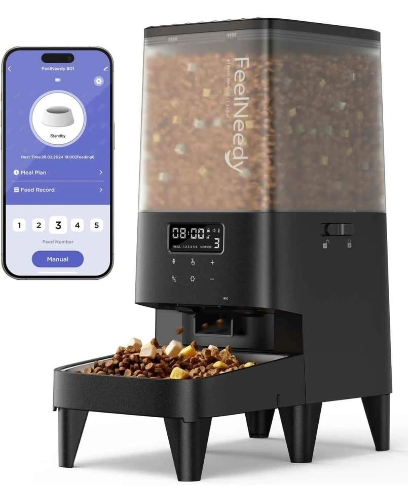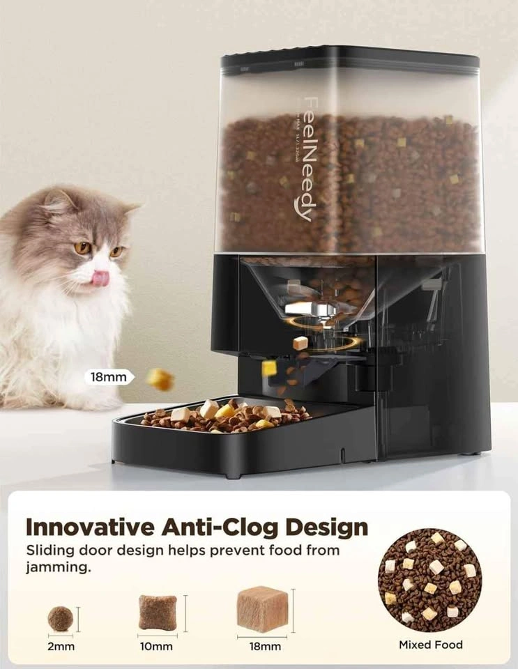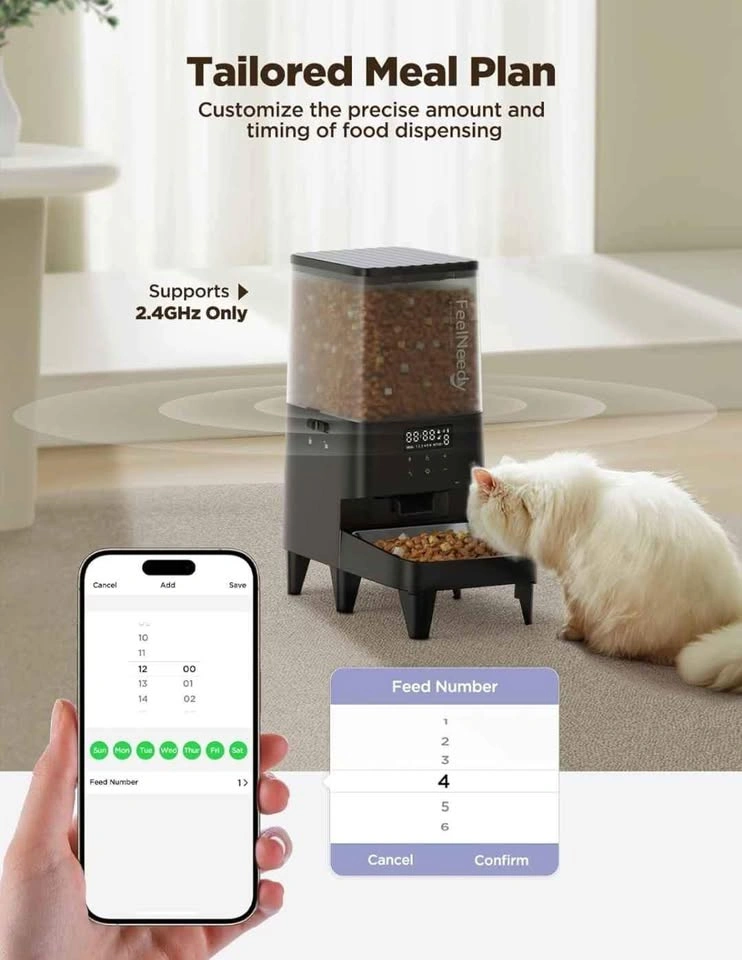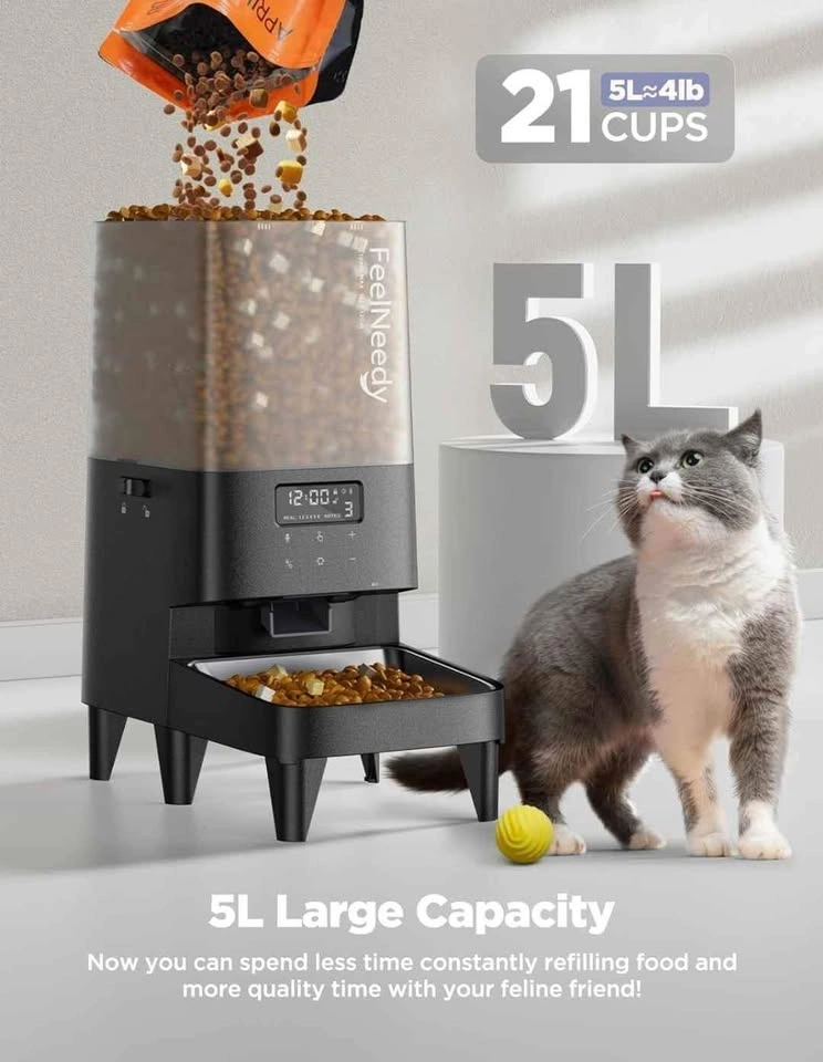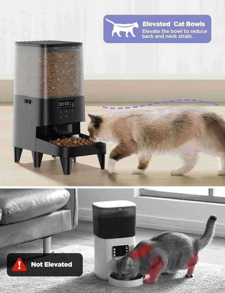 The automatic cat feeder connects to the 2.4GHz network quickly. Setting up a feeding schedule takes just 30 seconds, which is much easier than using push-button mode. You can feed your pet anytime, anywhere and view the feeding to ensure the automatic cat feeder is working as planned. Our automatic cat feeder adopts the latest type of push food design, which greatly reduces the situation of food jam, no longer need to worry about your pet starving! Our pet feeder allows 1-10 meals per day and up to 60 portions per meal, With a flexible, healthy and sensible feeding schedule, your pets can develop good eating habits and also stay away from obesity and other diseases. 5L automatic pet feeder Suitable for multi-pet families, equipped with desiccant box and sealing strip, can ensure the freshness and nutritional value of food. Our pet feeder is powered by a power adapter and 3 D-size batteries (not included), ensuring your pets are fed even during a power outage. It is recommended to use the battery and adapter at the same time in case the power is cut off(with setting memory to prevent sudden power loss). Cat food dispenser not only suitable for kittens as well as short-footed cats, but also suitable for protecting the cervical vertebrae of adult cats.