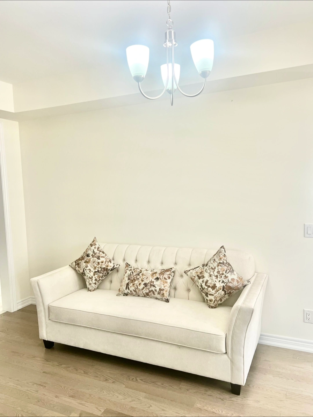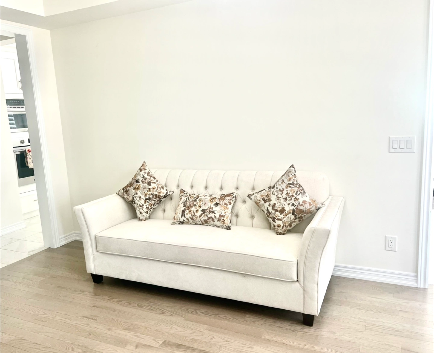 Brand new tufted sofa. Bought less than a month ago for our formal living room. Hardly anyone sat on it. Does not suits our room decor. Firm seated cushions. Comes with three new floral cushions. $1300 or the best offer. Cash only please.