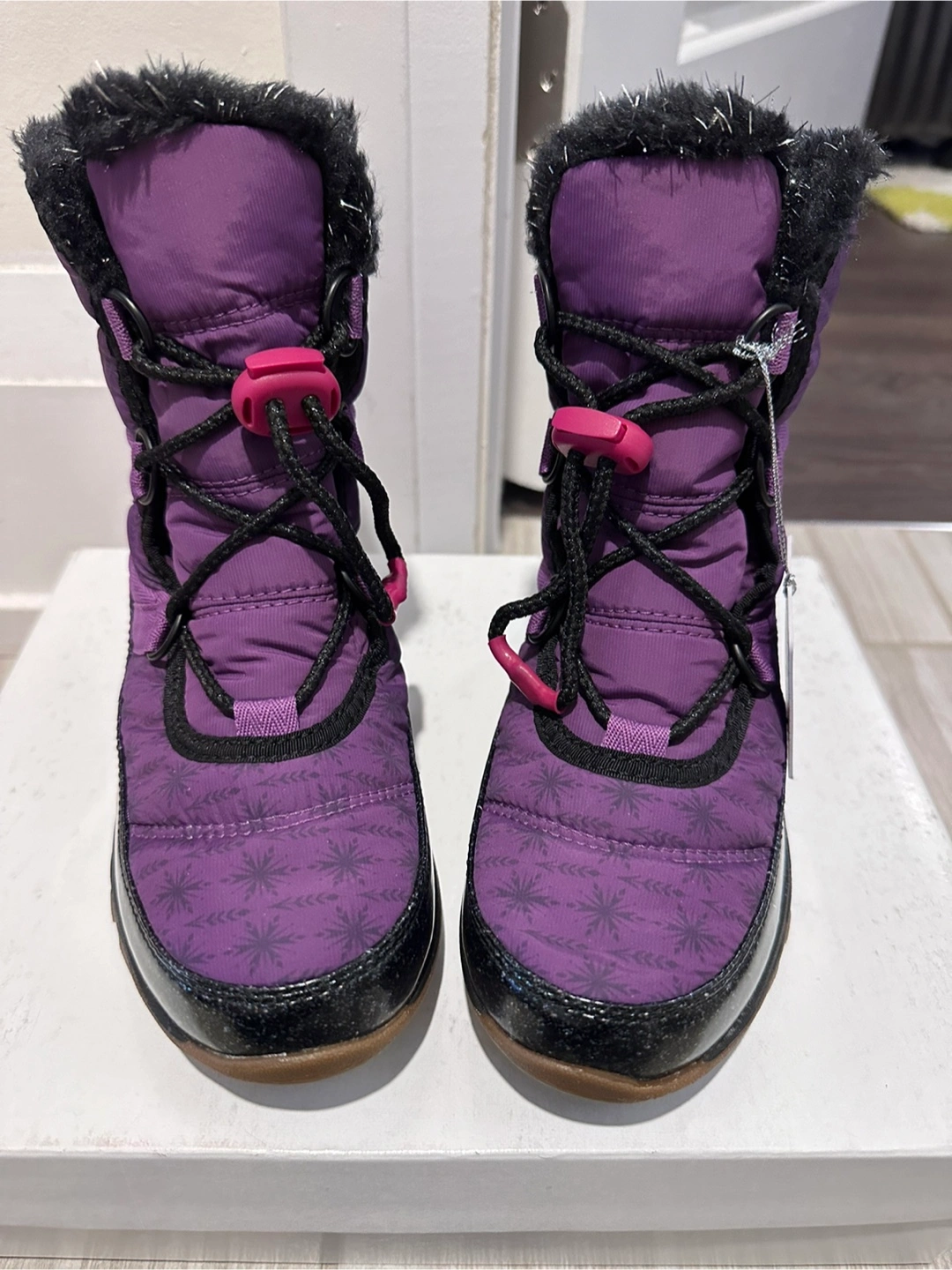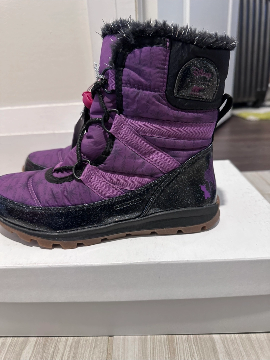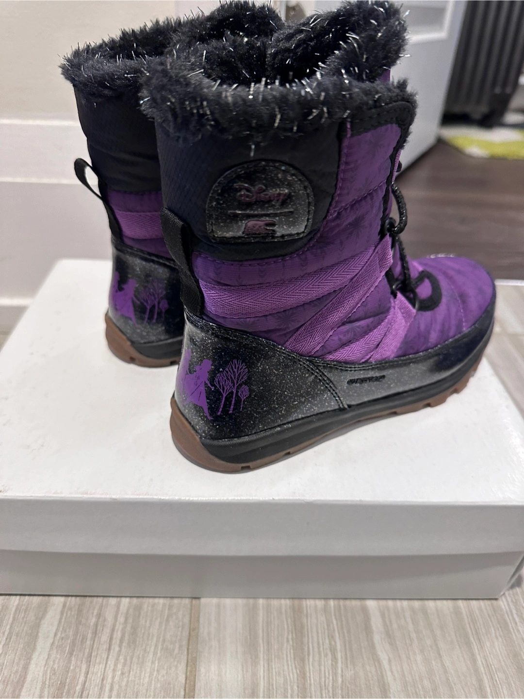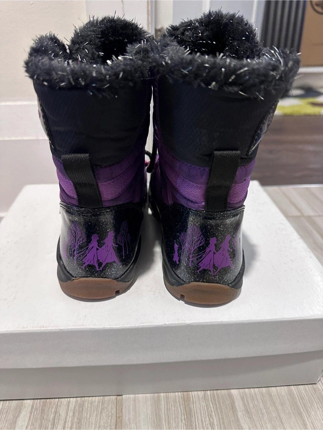 These adorable Sorel purple winter boots feature a Frozen II design! They're perfect for keeping little feet warm and dry during the cold Canadian winters. The boots have a black trim and a faux fur lining for extra comfort. Size 2.