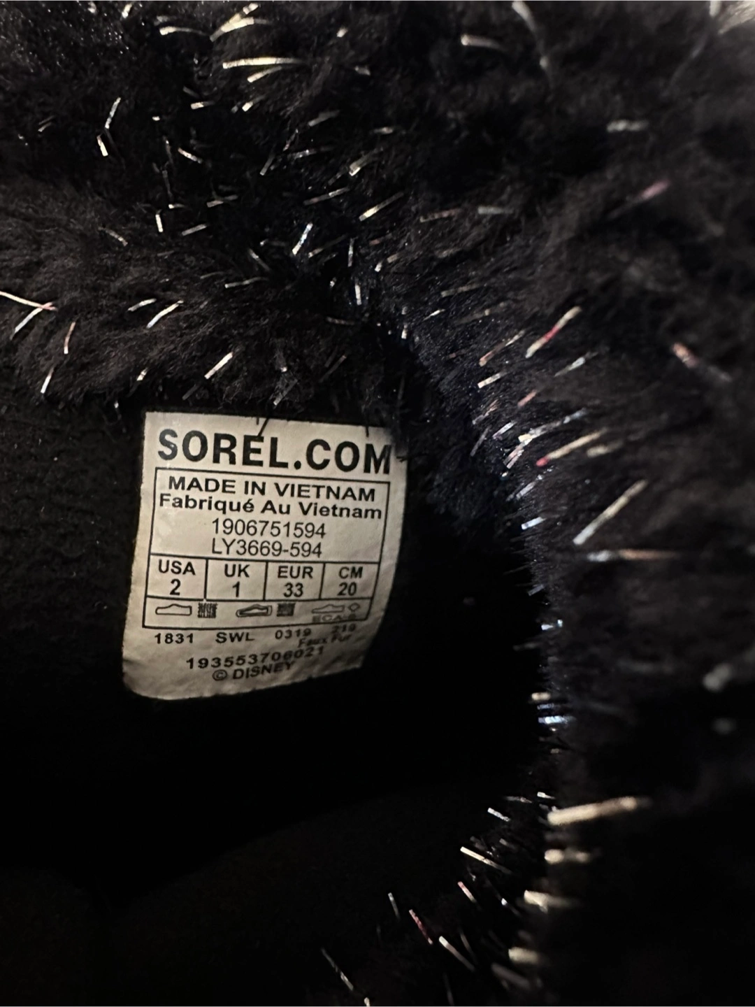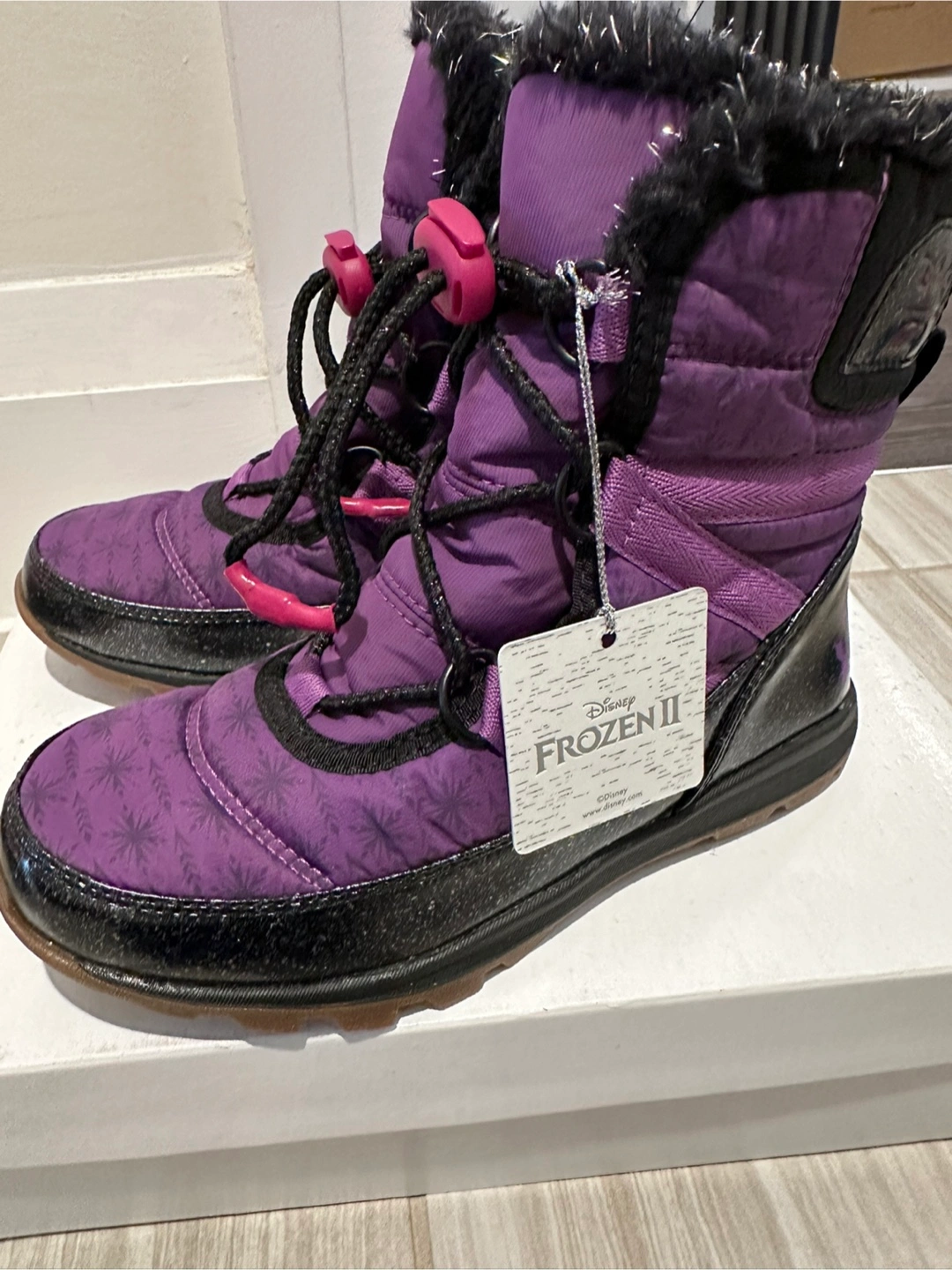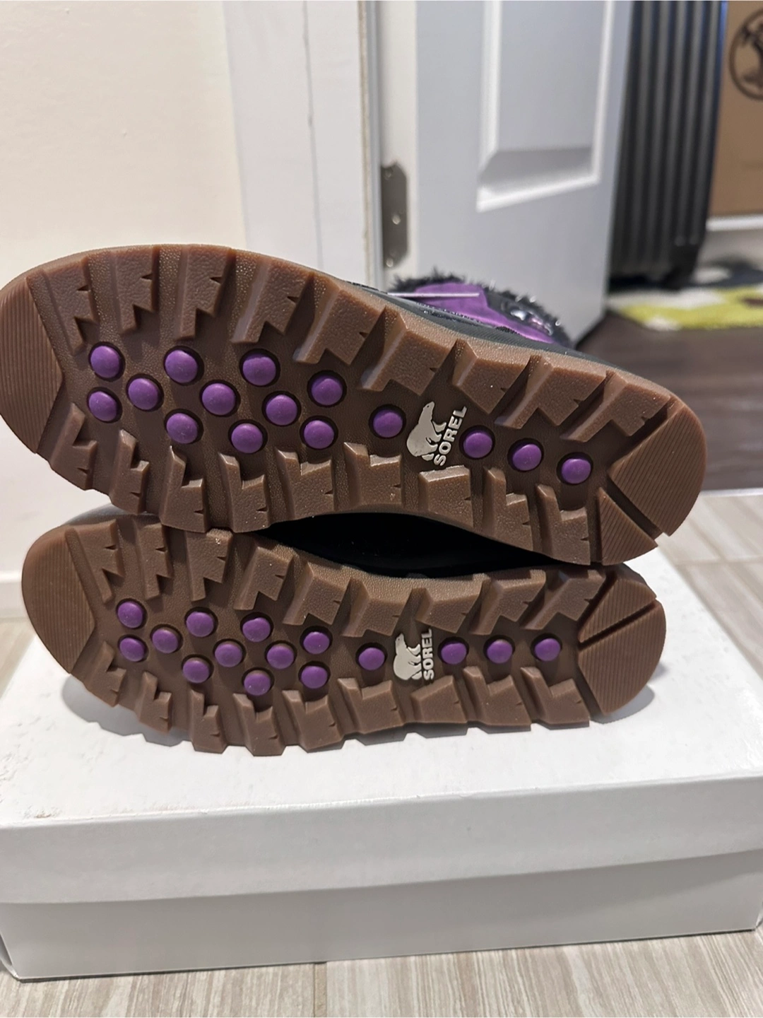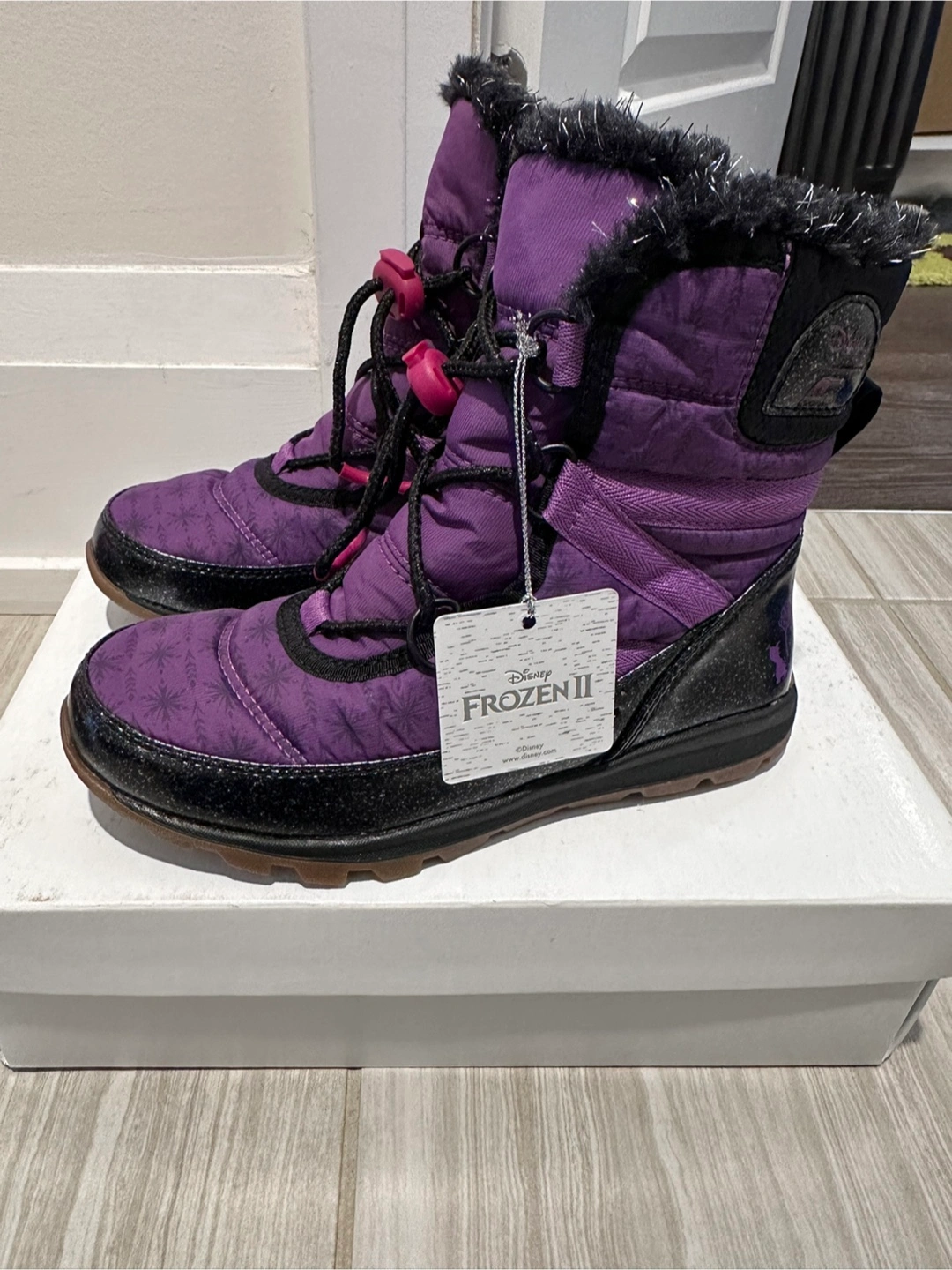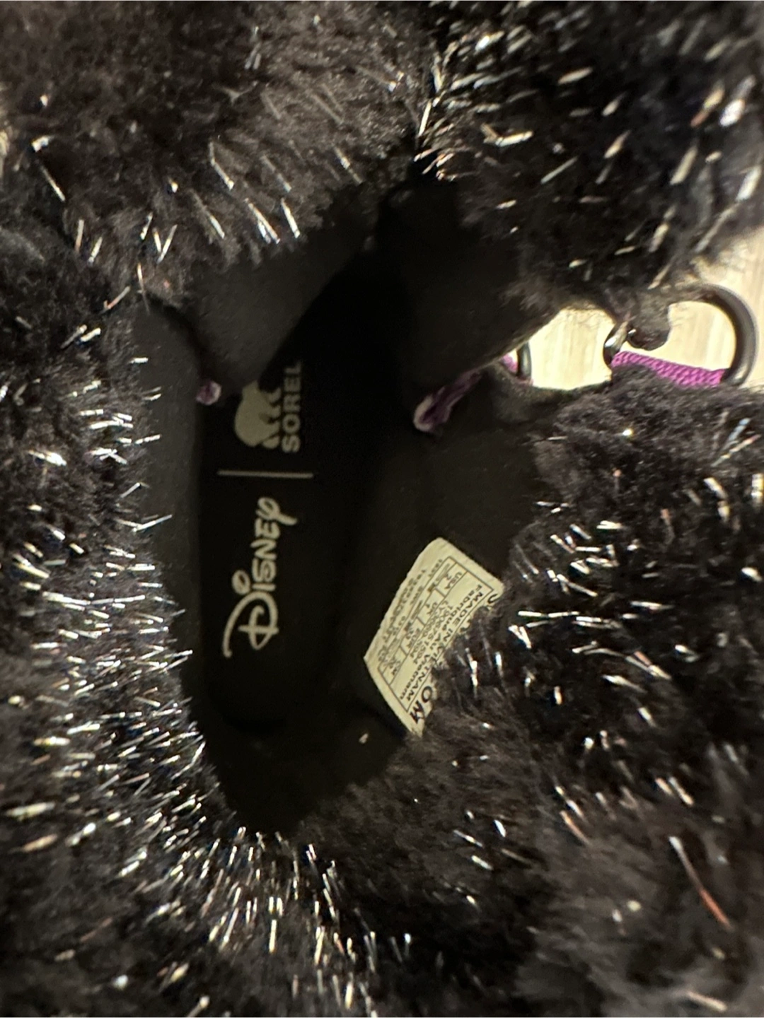 These adorable Sorel purple winter boots feature a Frozen II design! They're perfect for keeping little feet warm and dry during the cold Canadian winters. The boots have a black trim and a faux fur lining for extra comfort. Size 2.
