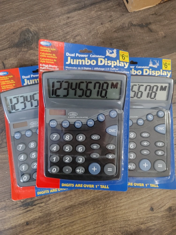🧡THREE LARGE SOLAR CALCULATORS. 🧡BRAND NEW IN PACKAGE. 🧡GREAT FOR THE ELDERLY WHO PREFER LARGE DISPLAYS AND EASE OF USE. 🧡I AM LOCATED IN THE YONGE AND STEELES AREA FOR PICKUP.