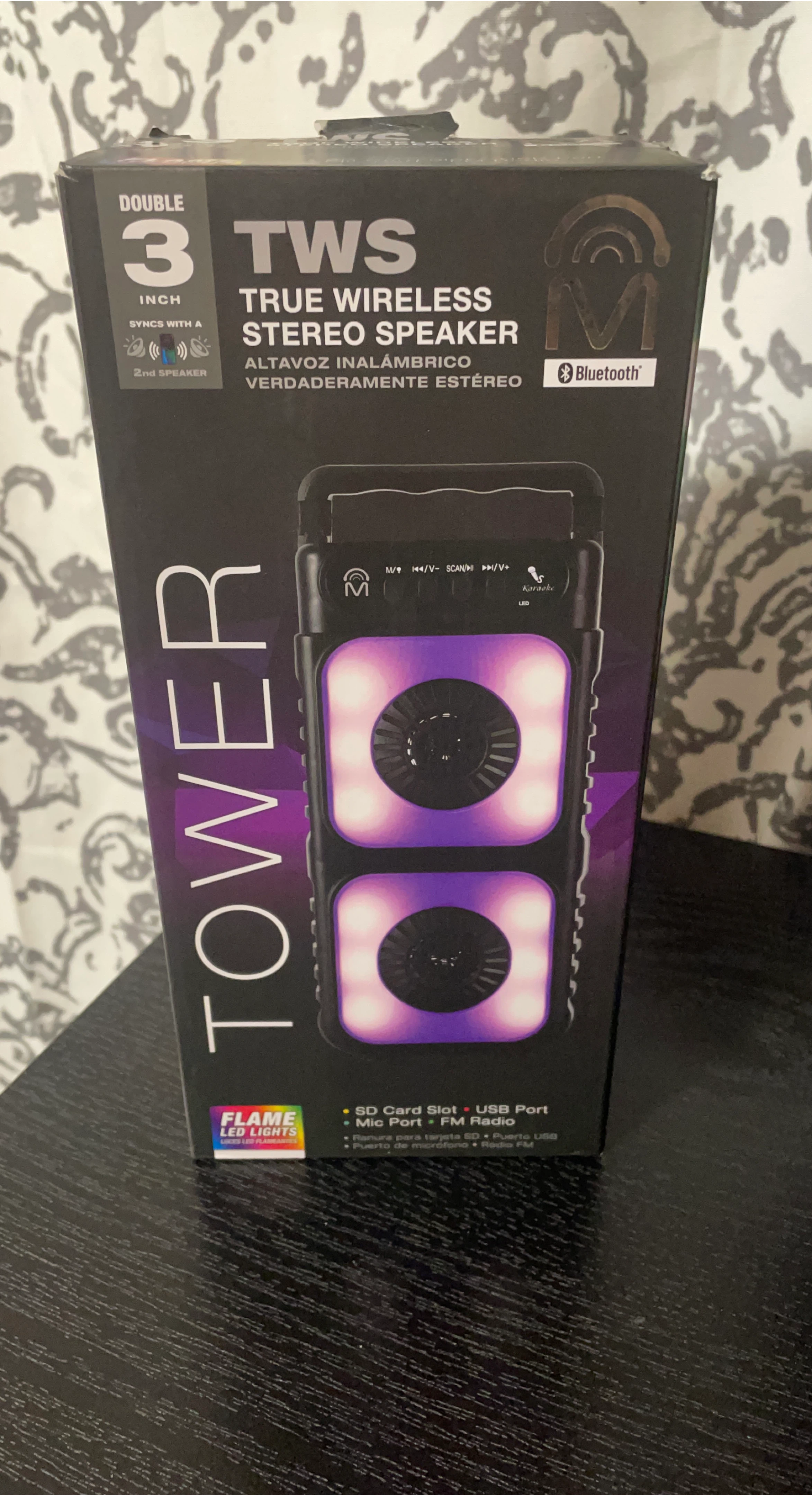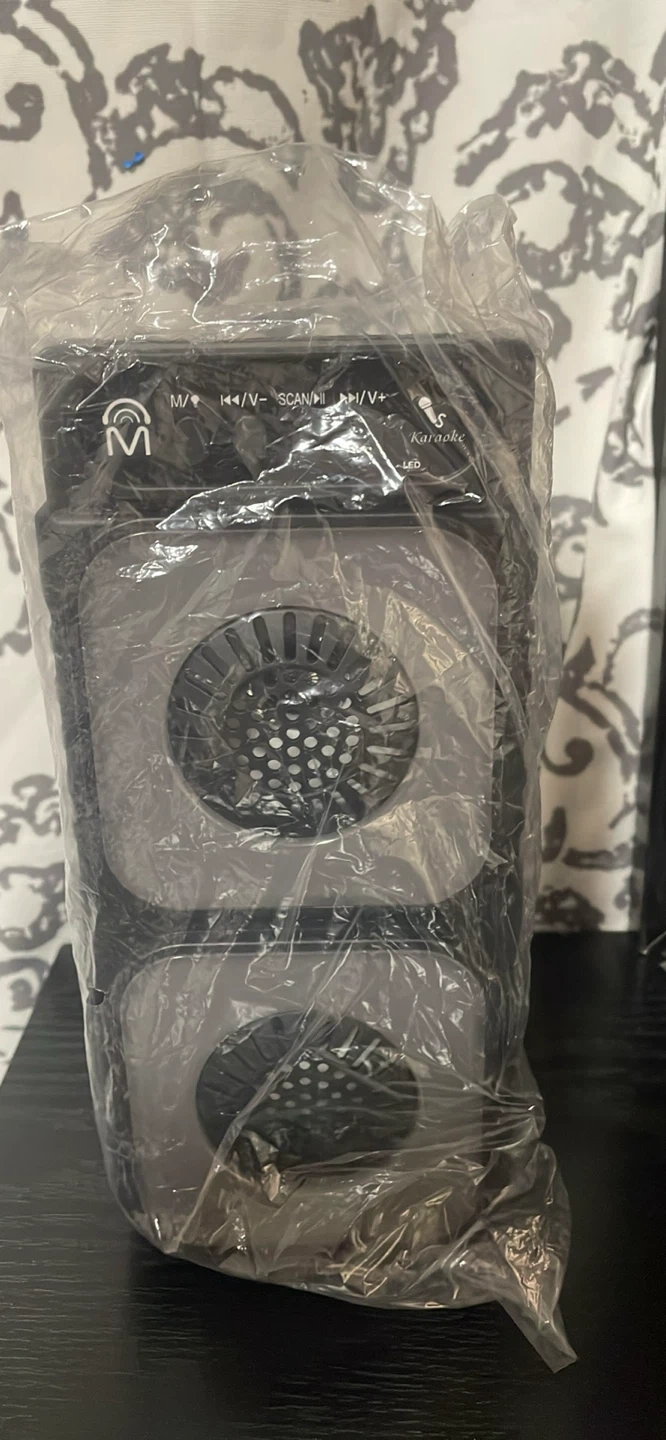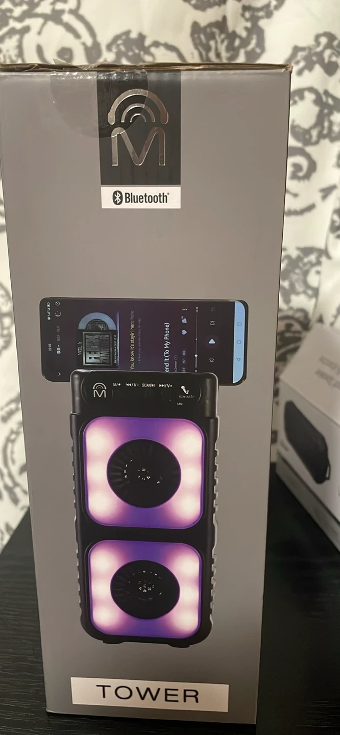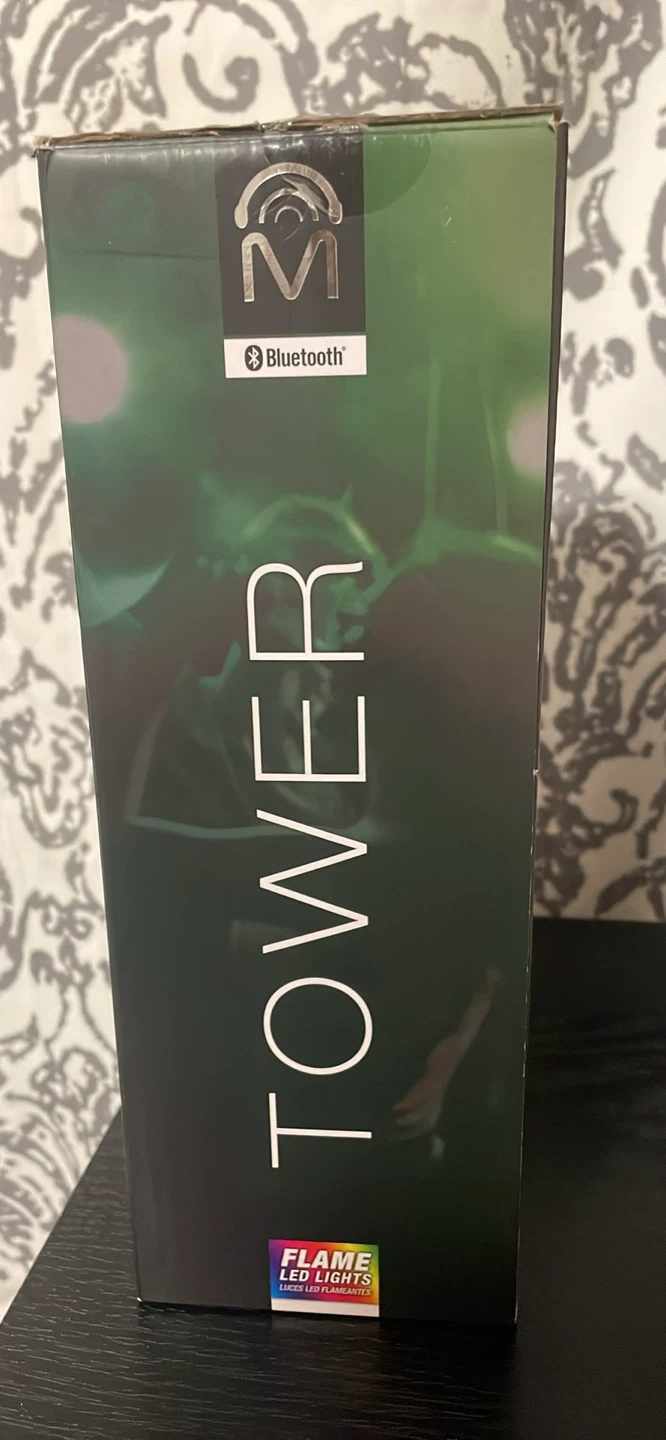 25Selling a Tower TWS True Wireless Stereo Speaker! It features double 3-inch speakers and Bluetooth connectivity. The speaker also has flame LED lights for a cool visual effect. Key features include: - SD card slot - USB port - Mic port - FM radio It also comes with a micro USB charging cable and user manual. Dimensions are 115x92x276mm