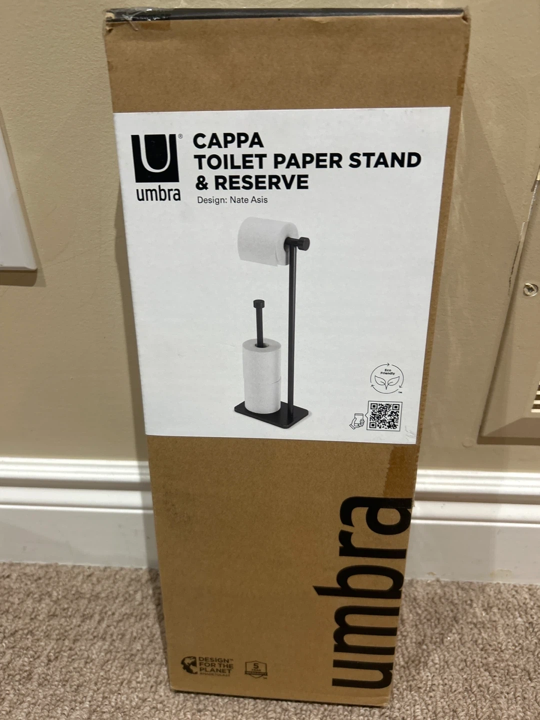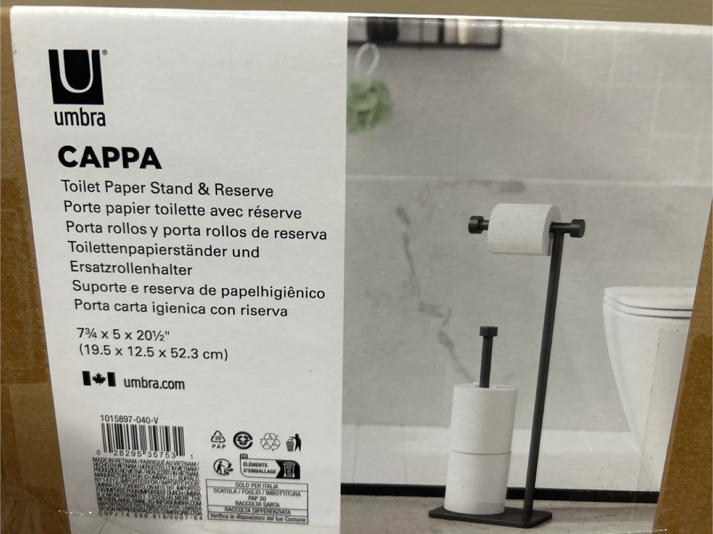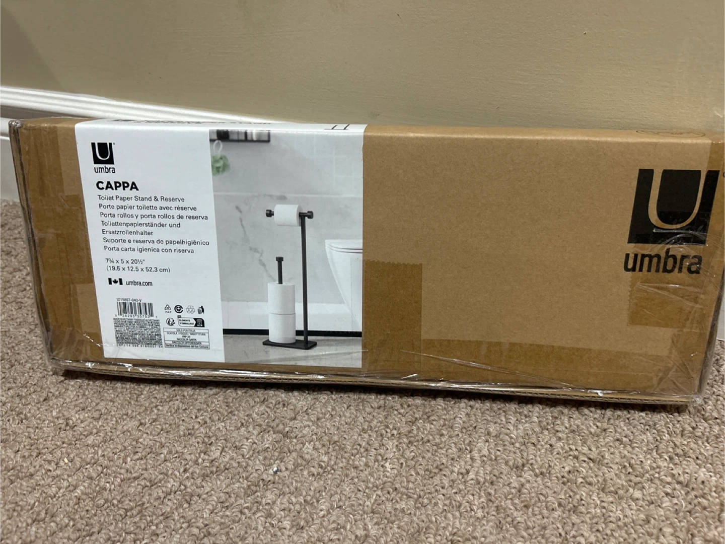 Selling a brand new Umbra Cappa Toilet Paper Stand & Reserve, still in its original packaging! This stylish stand is perfect for keeping your toilet paper organized and easily accessible. It measures 7 3/4 x 5 x 20 1/2" (19.5 x 12.5 x 52.3 cm).
