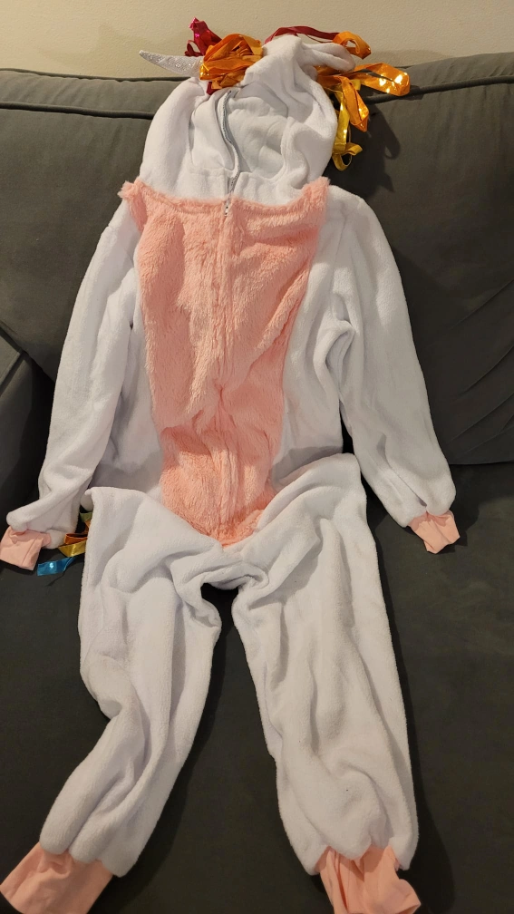 Super cute unicorn brand new onesie costume! It's a size 4-6, 6-8 and in great condition. Perfect for dress-up, your children can wear the same design