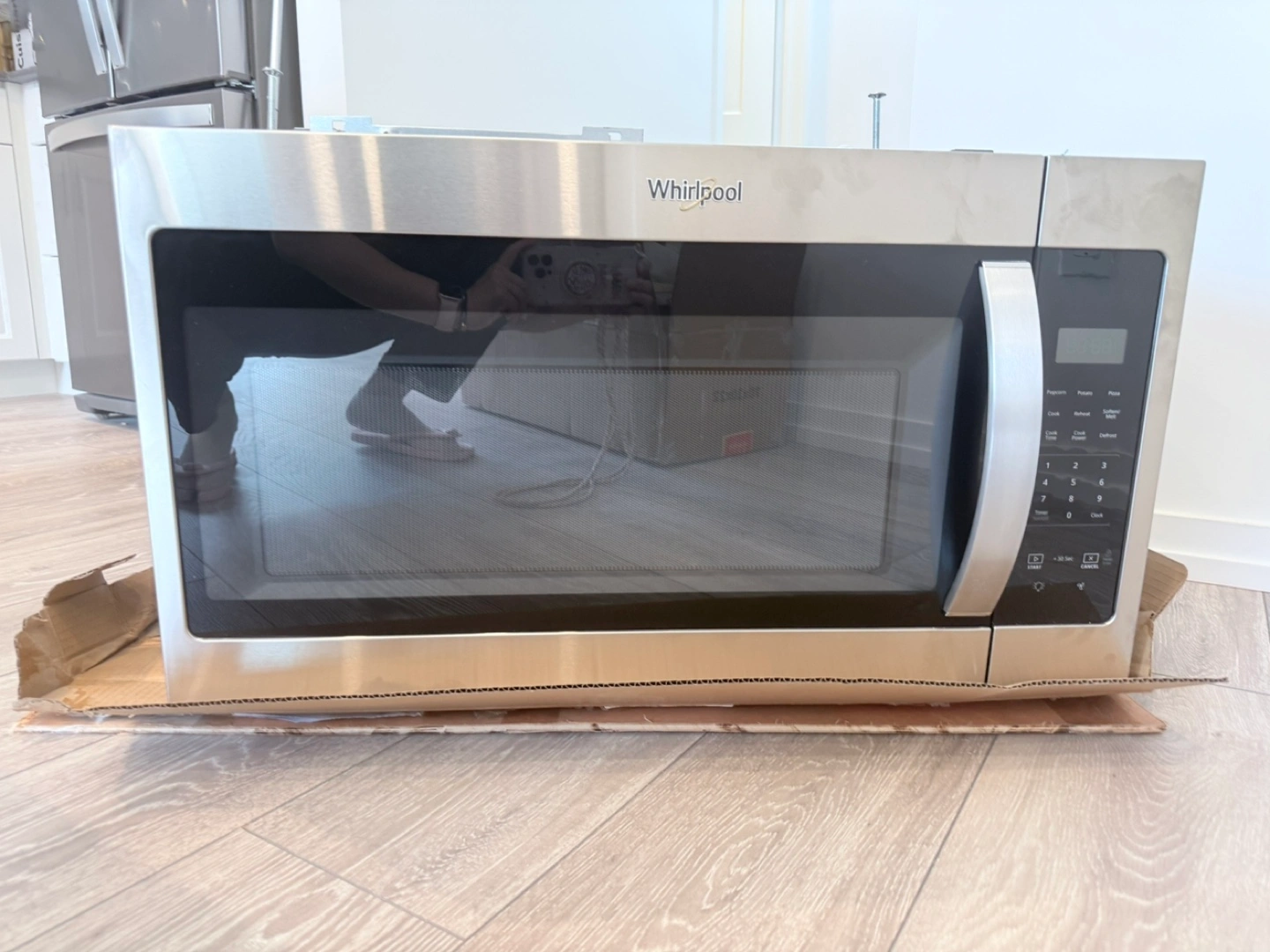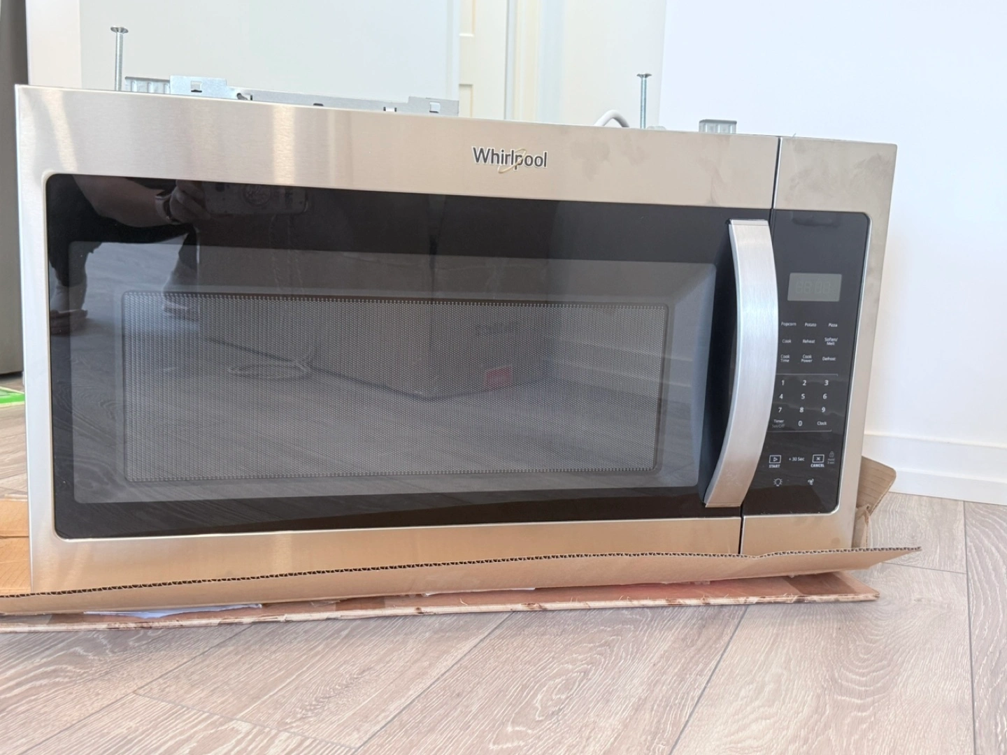 Selling a Whirlpool over-the-range microwave in stainless steel. It's BRAND NEW and ready to heat up your meals! Perfect for saving counter space in your kitchen