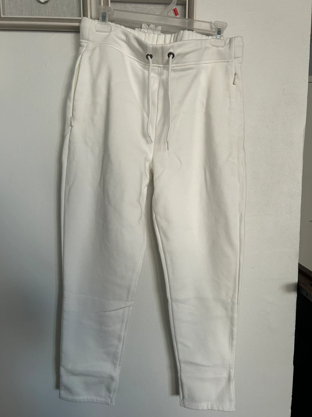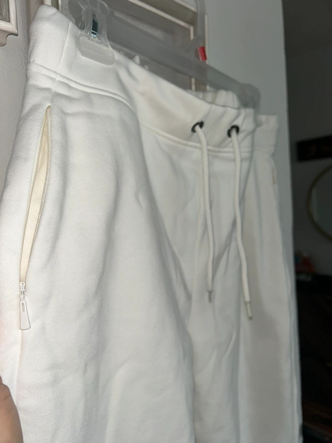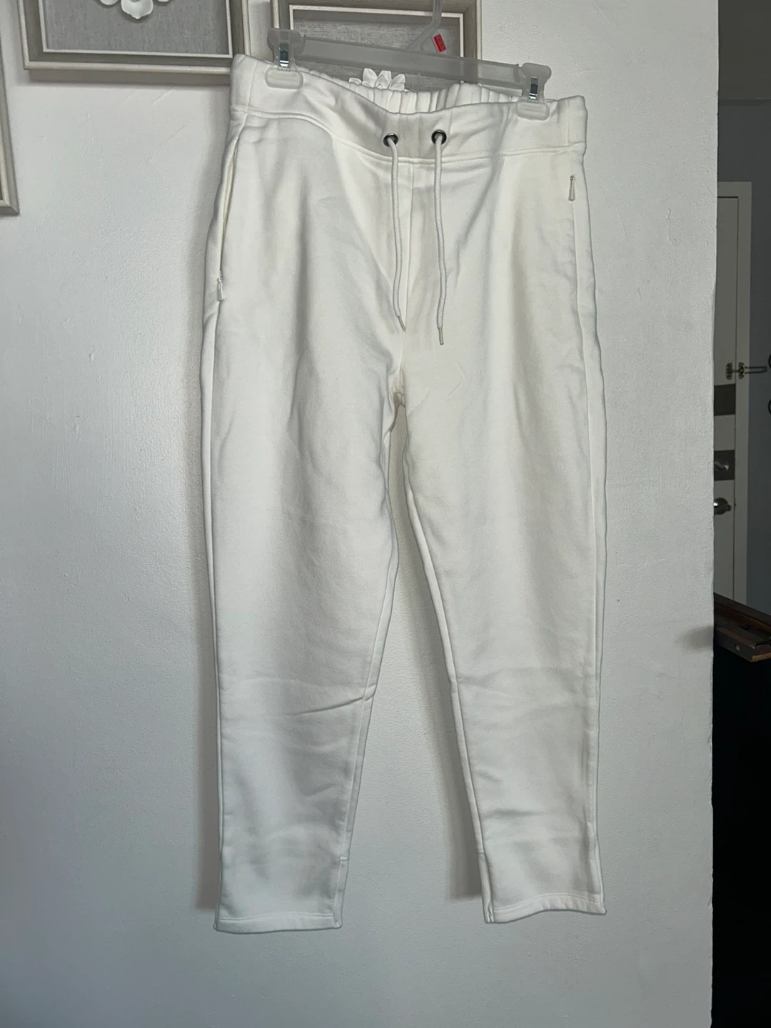 75Selling a pair of white jogger pants. They have a drawstring and zipper pockets size M brand new