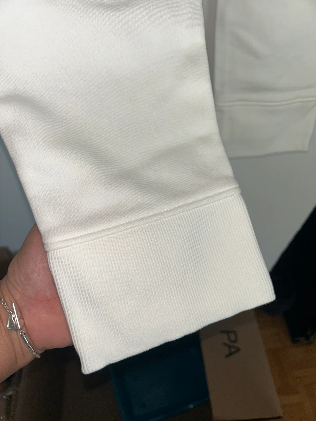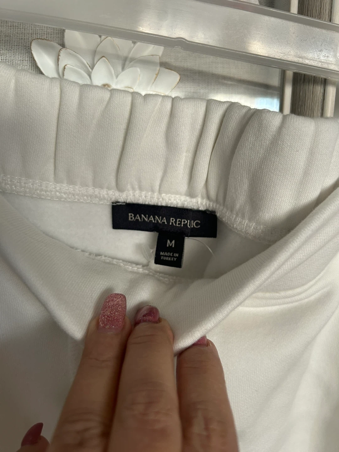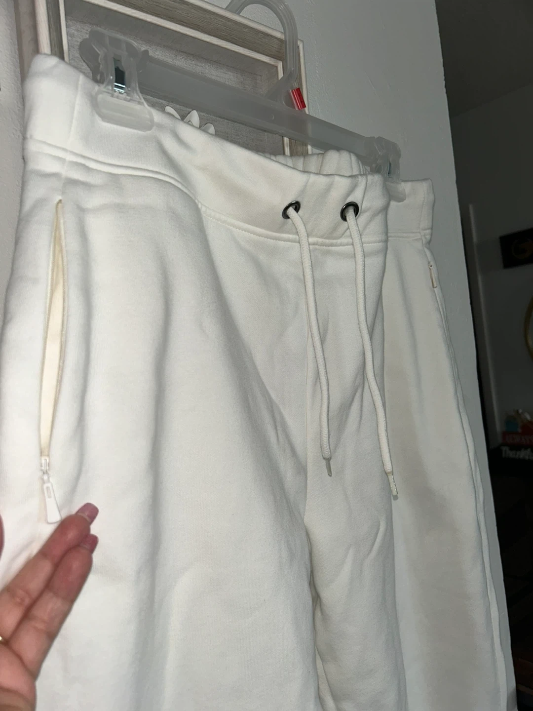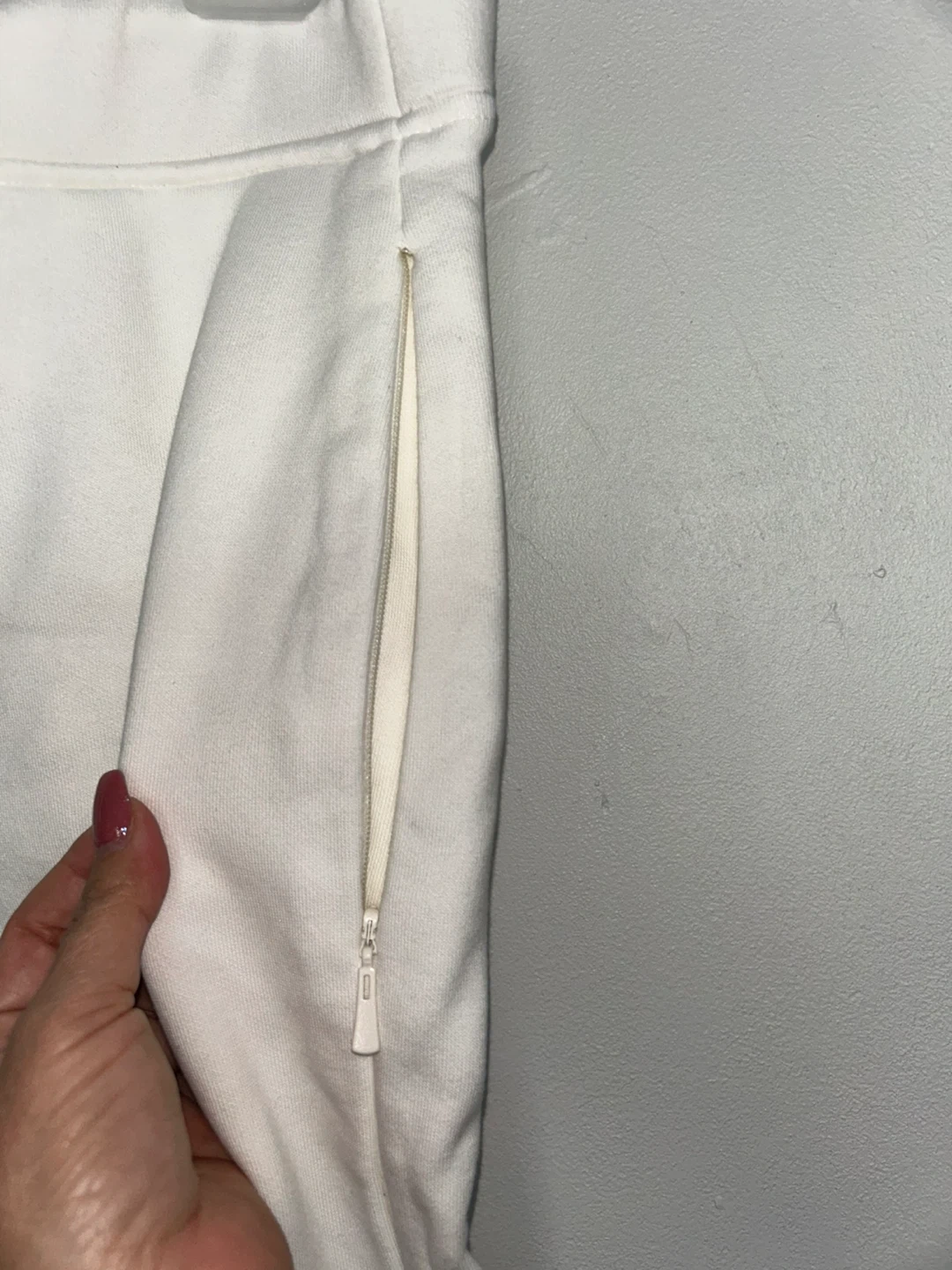 75Selling a pair of white jogger pants. They have a drawstring and zipper pockets size M brand new