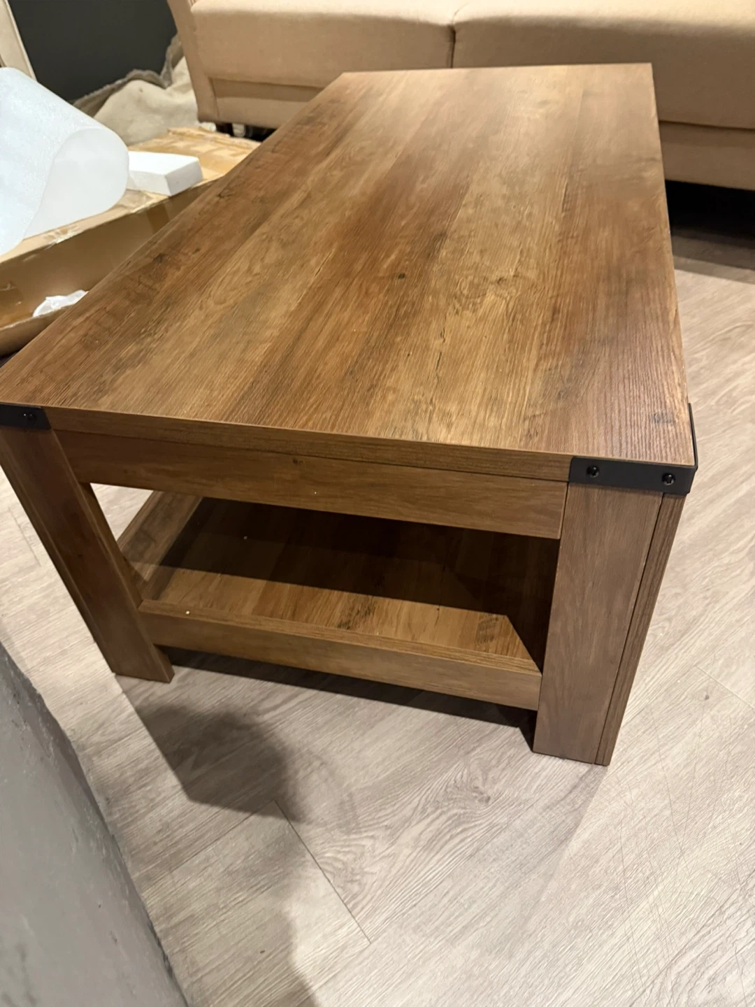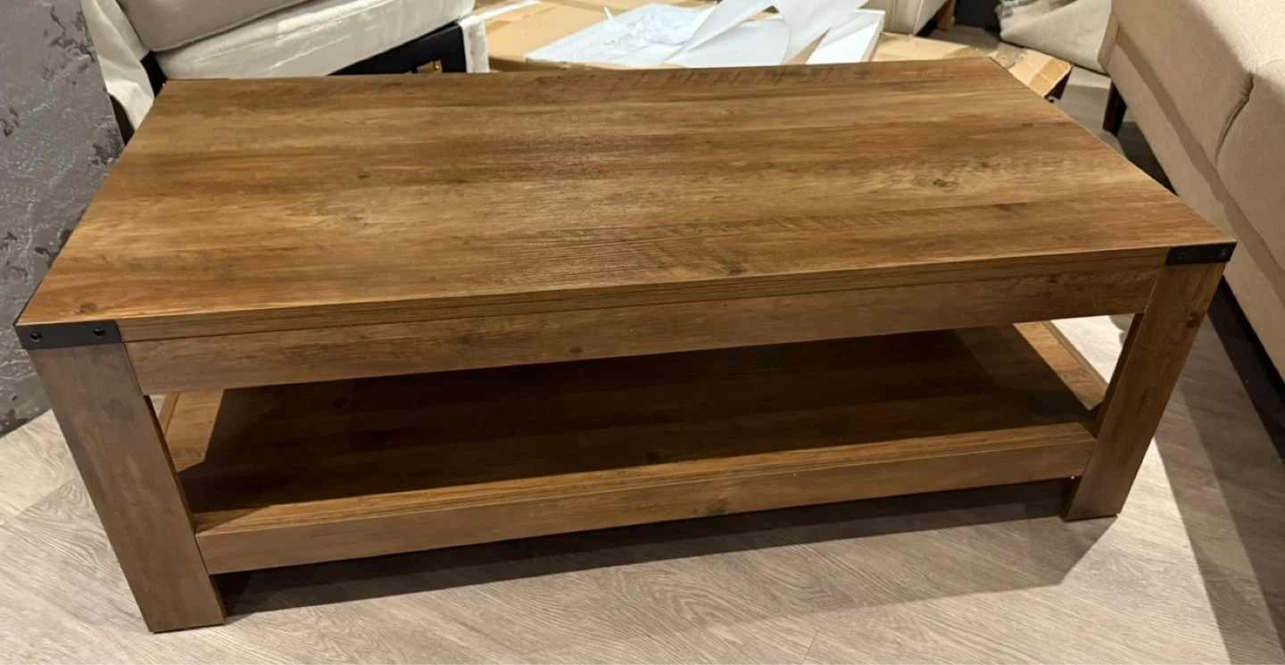 136Here's a lovely wood coffee table with a shelf underneath! It's perfect for adding a touch of rustic charm to your living room. The shelf provides extra storage for books, magazines, or remotes. It's in great condition and ready for a new home!
