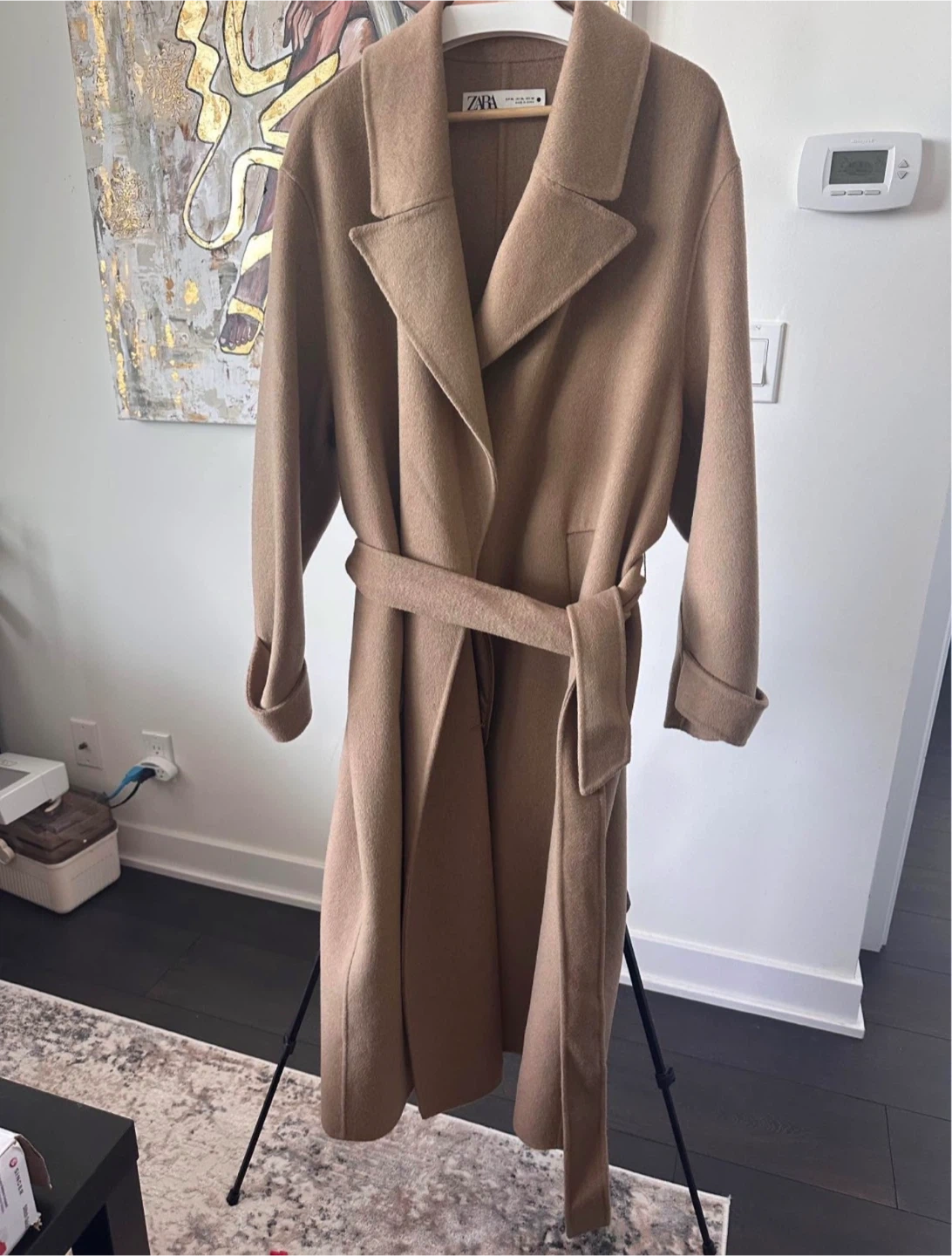 Cozy Zara coat in size XL! This beige coat is made from a wool blend, perfect for staying warm and stylish during cooler weather. It features a tie belt for a flattering fit. Great for layering