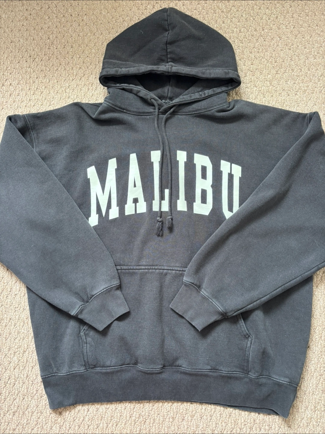 Selling a Brandy Melville hoodie with "Malibu" printed on the front. It's a comfy and casual piece, perfect for everyday wear!