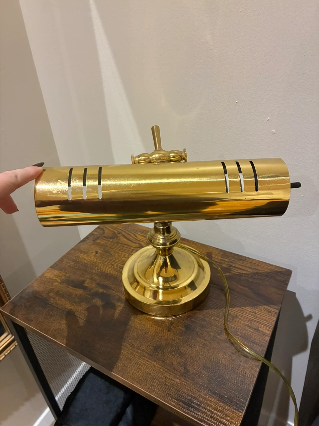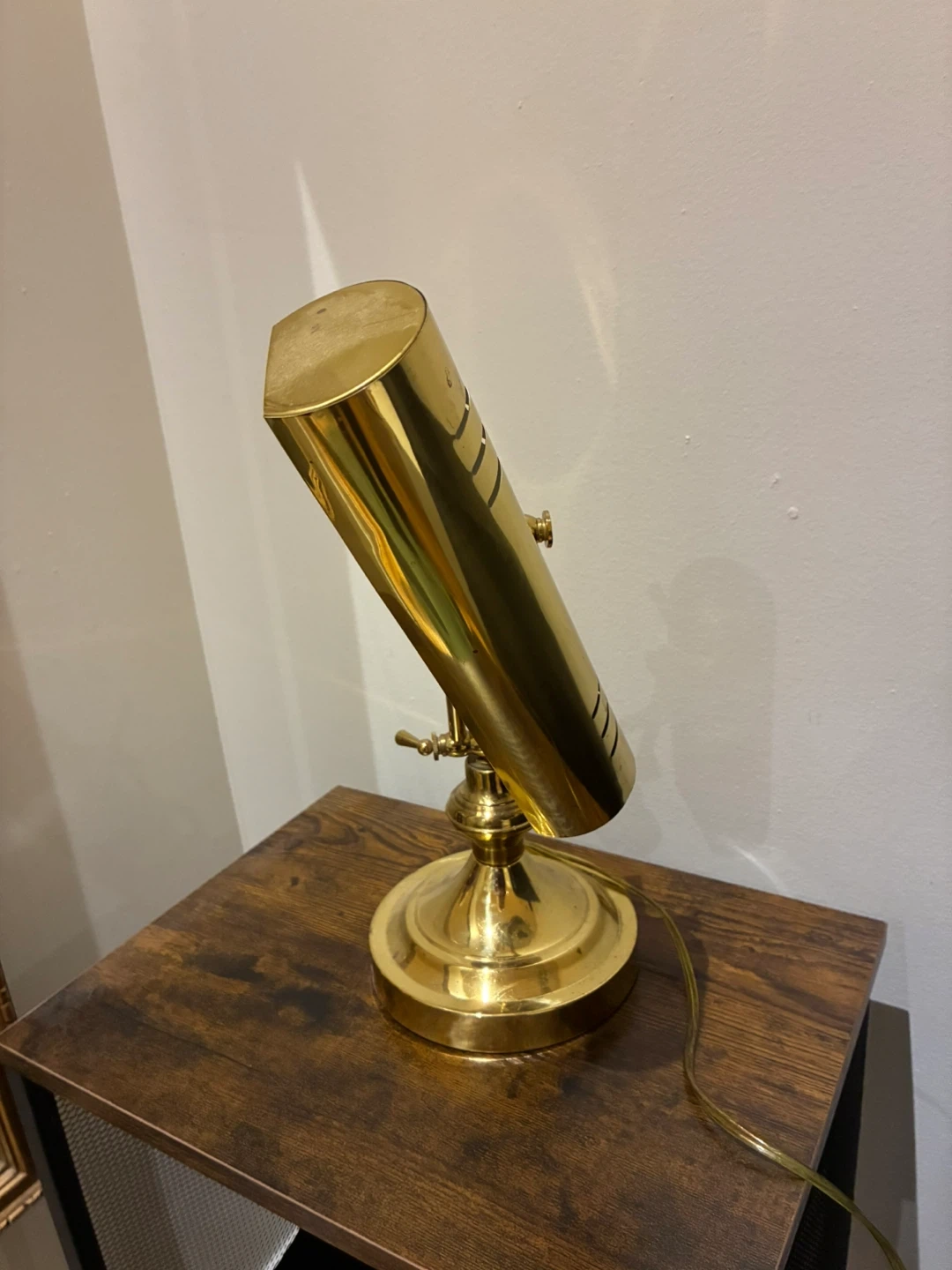 104Here's a lovely brass banker's desk lamp! It measures approximately 9.5 inches in length and 11 inches in height. Perfect for adding a touch of vintage charm to your desk or workspace Needs to be tightened at base to avoid tilting Pickup at Bay and Dundas