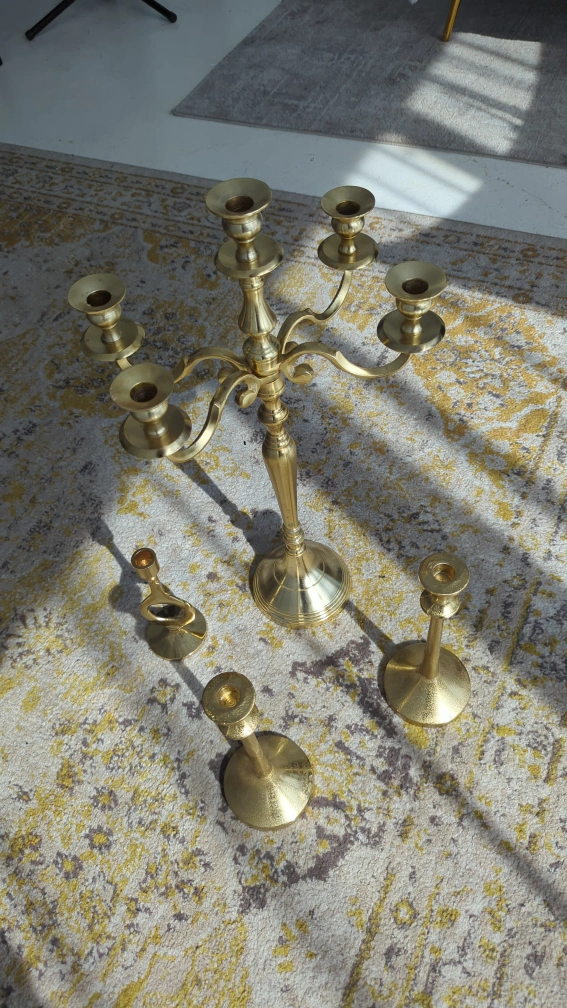 Selling a set of brass candle holders! They add a touch of elegance to any room. Perfect for creating a cozy atmosphere or for special occasions