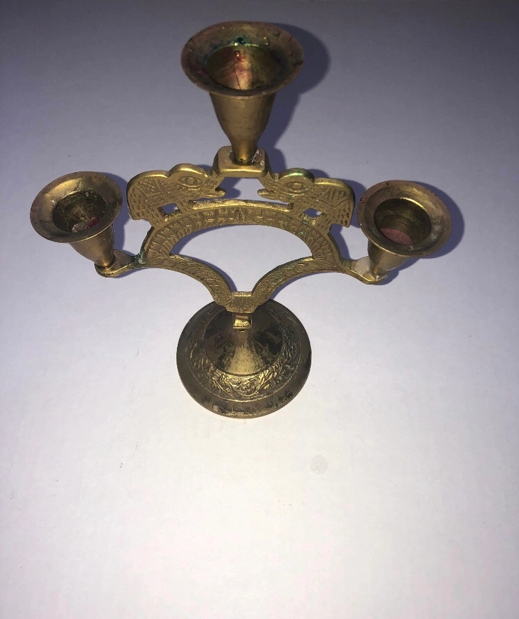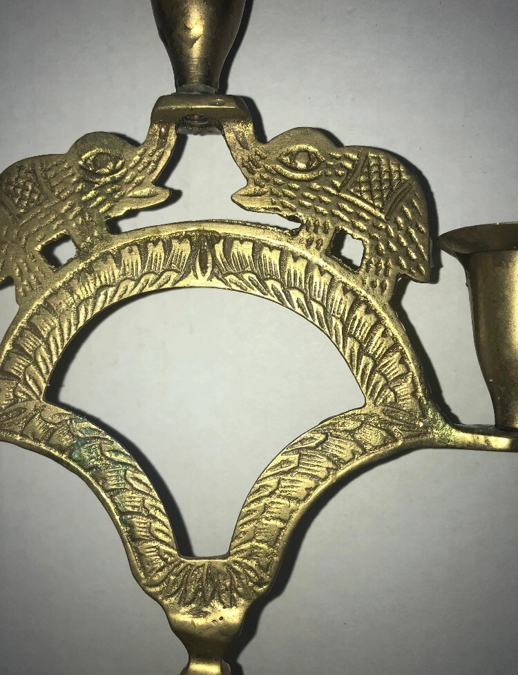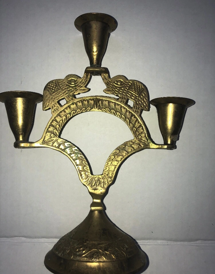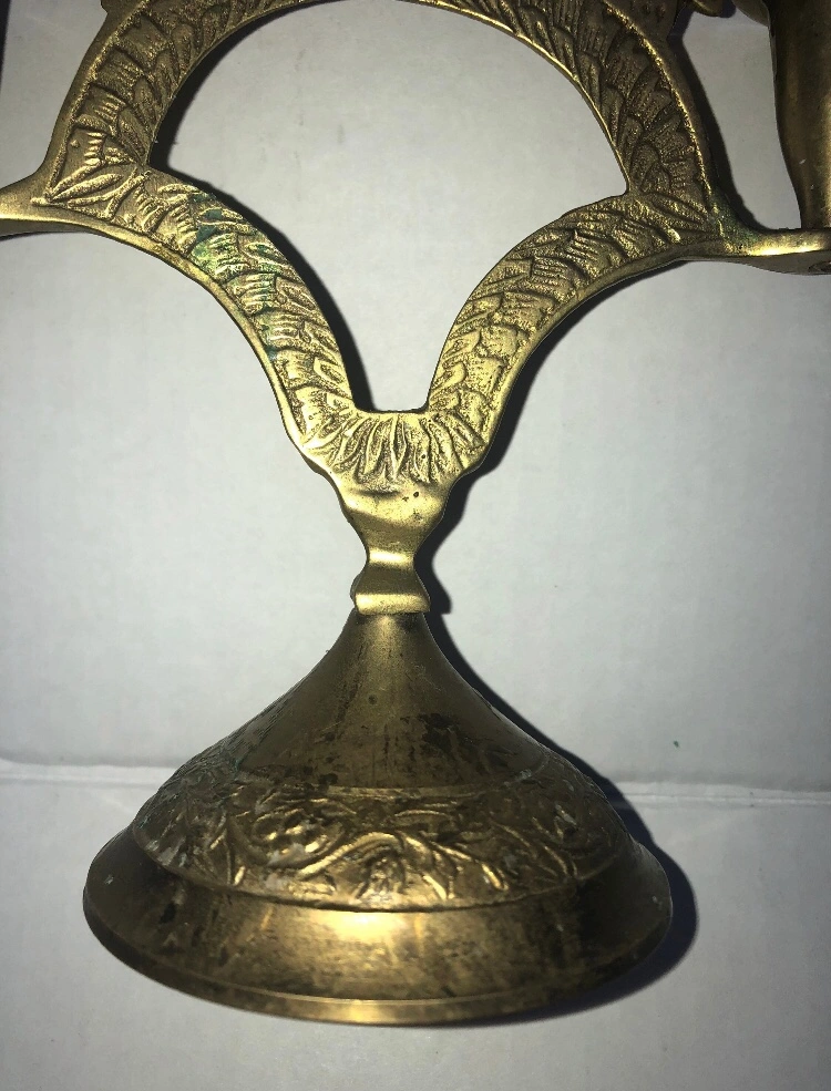 A vintage brass candle holder featuring two elephants. The candle holder has three candle cups.