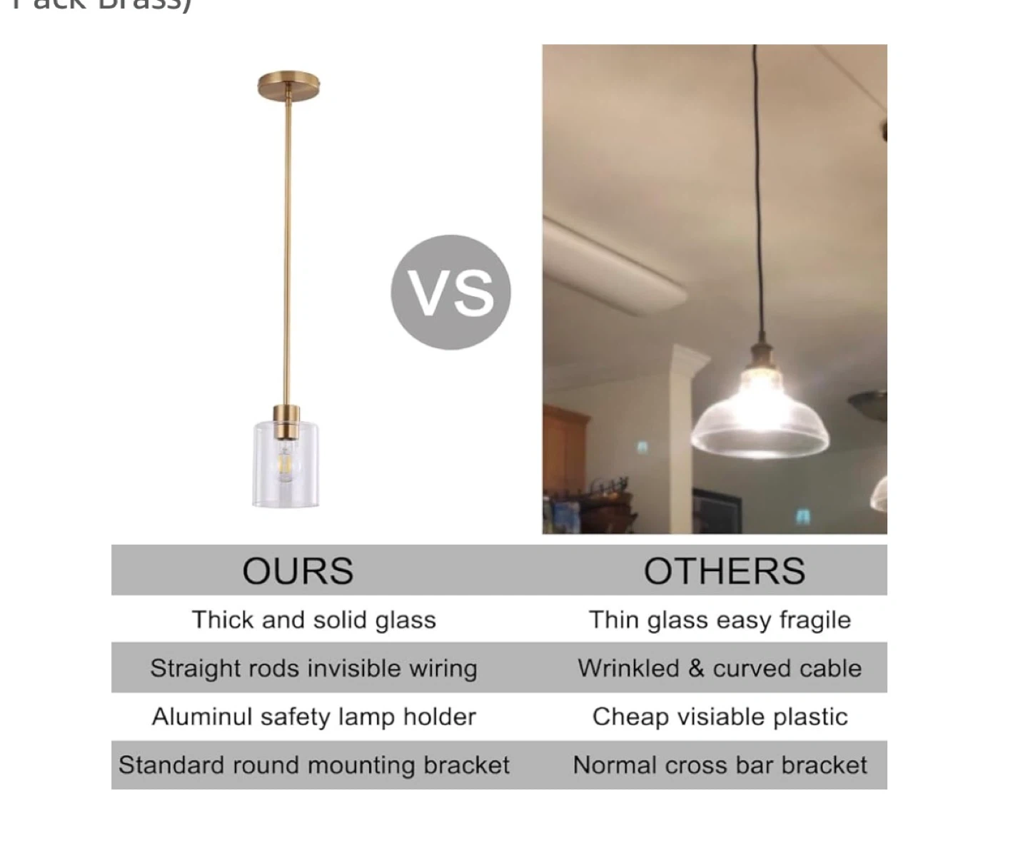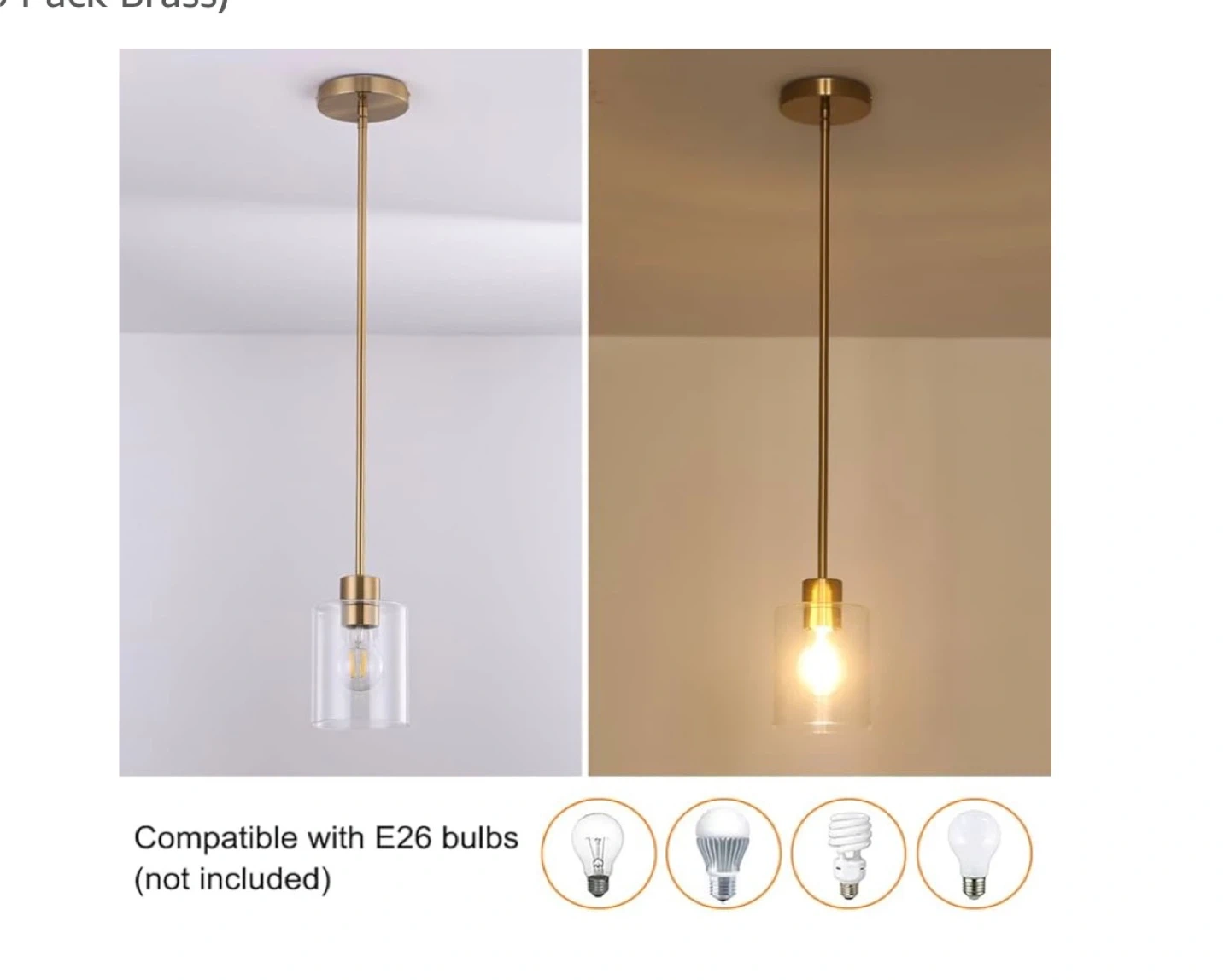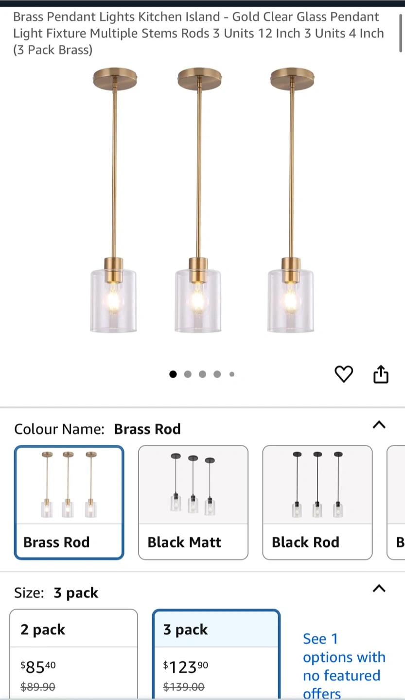 3 pack Selling a set of pendant lights with a brass finish and clear glass. These lights feature: - Thick and solid glass - Straight rods with invisible wiring - Aluminum safety lamp holder - Standard round mounting bracket They're in great condition and would look lovely in any kitchen or dining area