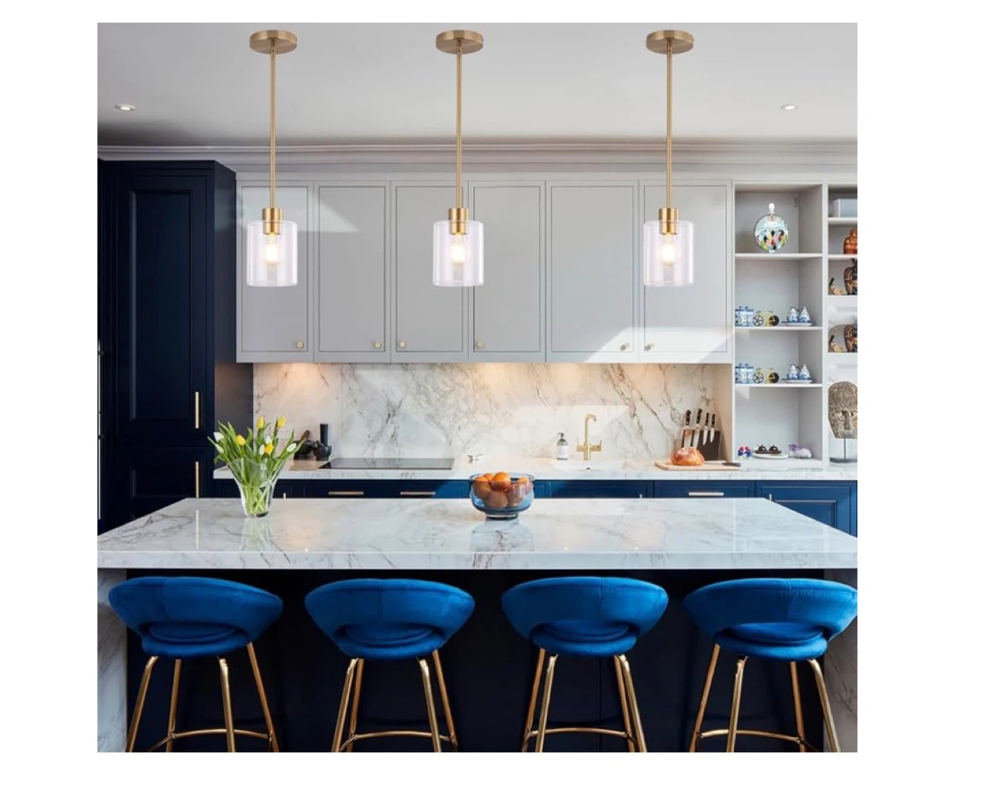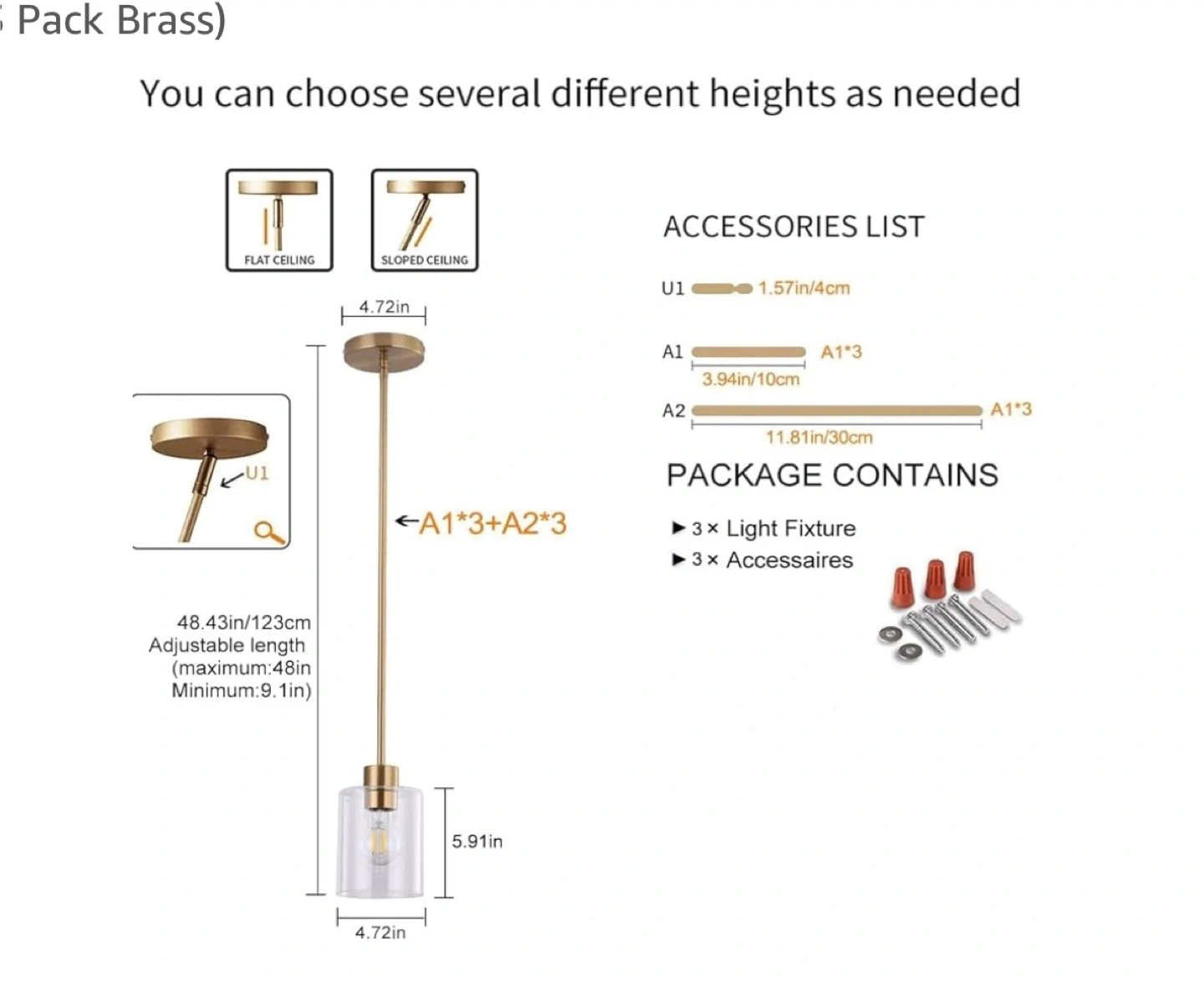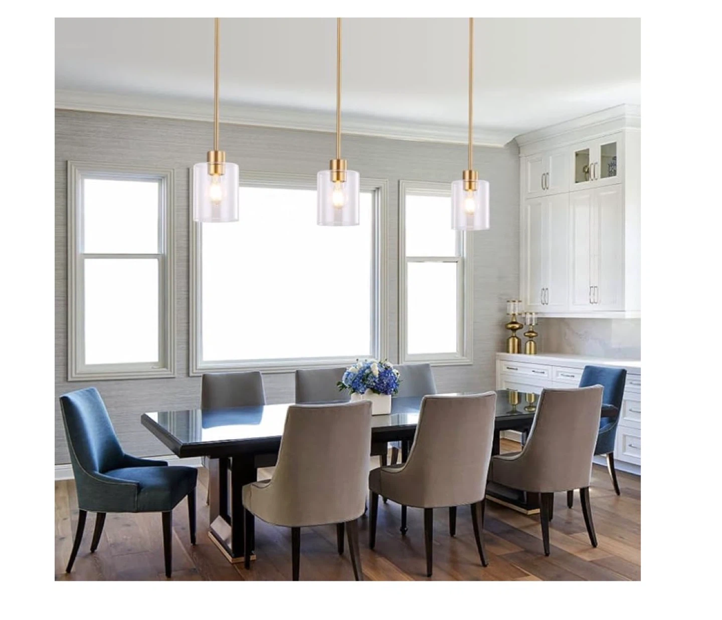 3 pack Selling a set of pendant lights with a brass finish and clear glass. These lights feature: - Thick and solid glass - Straight rods with invisible wiring - Aluminum safety lamp holder - Standard round mounting bracket They're in great condition and would look lovely in any kitchen or dining area
