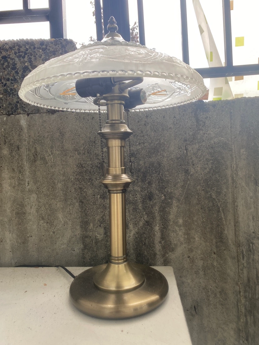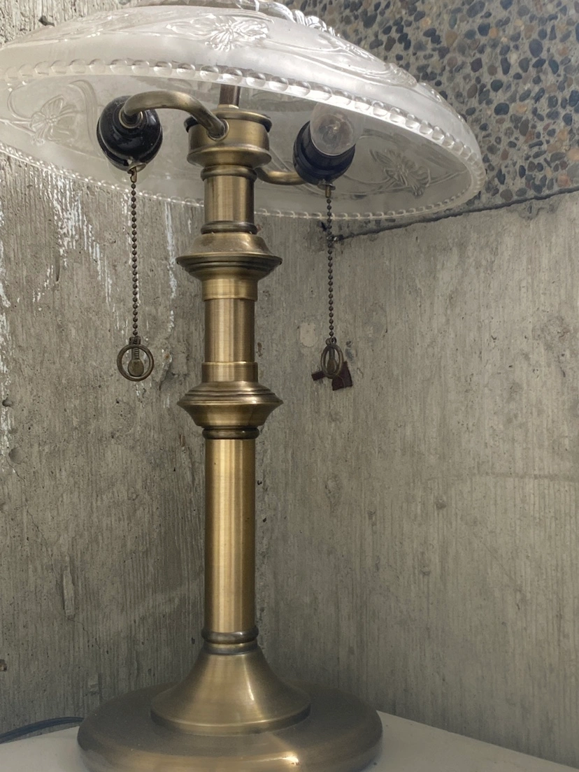 33Table lamp with brass base and frosted glass shade. The shade has an etched floral design. The lamp has two light bulbs. The light fixture comes with a cord and plug. The lamp is in working order.