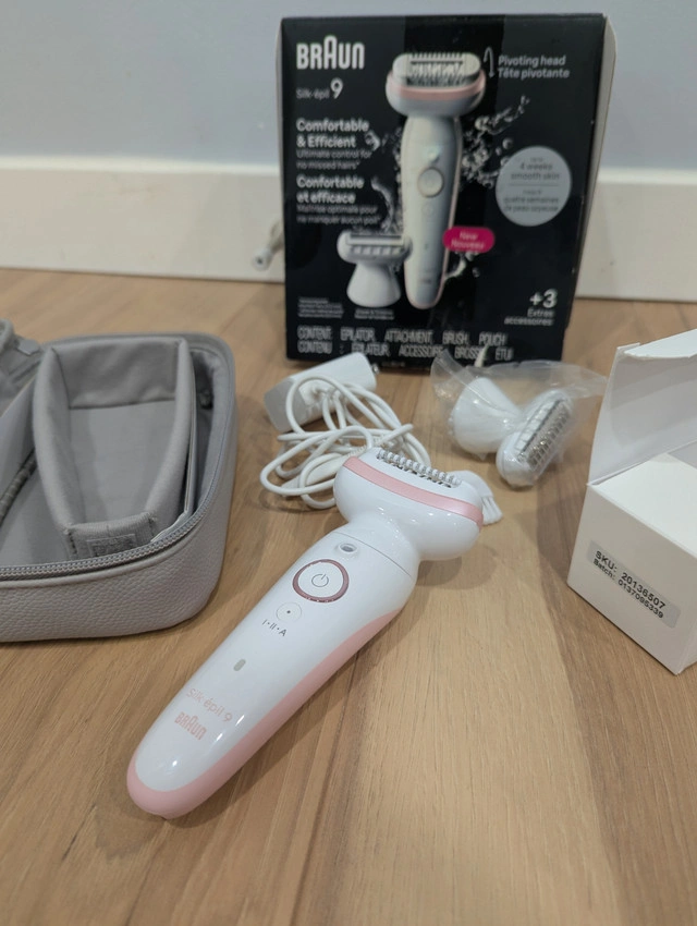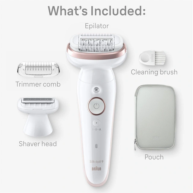 50Braun Silk-epil 9 Epilator SES9-030, brand new in box (BNIB), never used. Includes SE9 Epilator, Trimmer Comb, Shaver Head, Cleaning Brush and Pouch. The wide pivoting head effortlessly follows your body contours for an efficient epilation. The epilator catches the shorter hairs (0.5mm) that wax can't. Wet and Dry usage. Gently epilate in the bath or shower. Precision handle for a controlled grip even when used wet. Epilate on your own terms, our epilators catch hairs that wax can't, are free of chemicals, and require no waiting for hair regrowth.