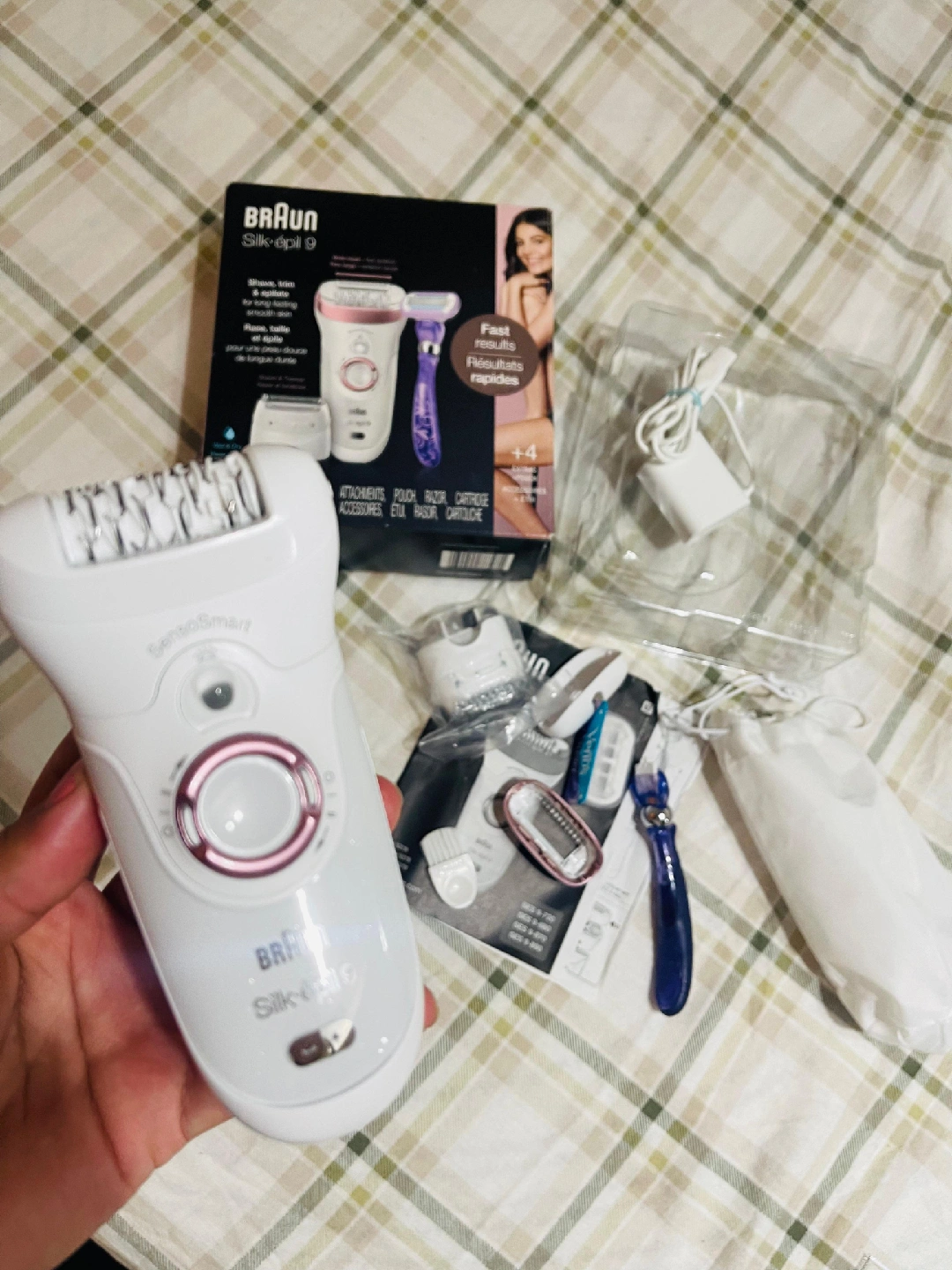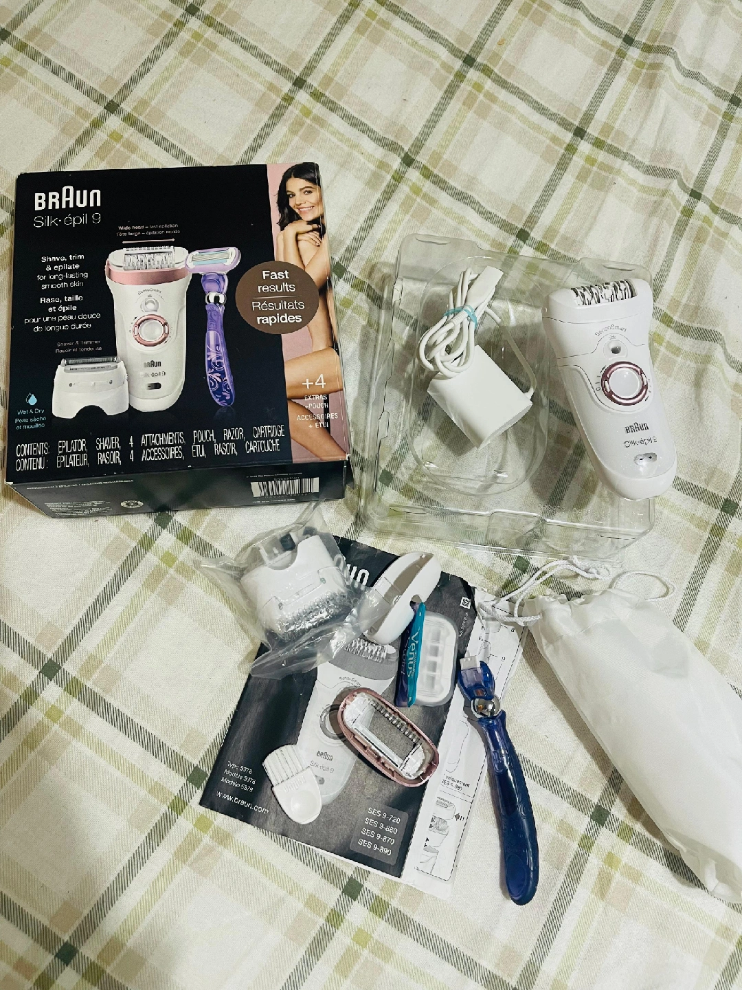 10Selling a Braun Silk-épil 9 epilator in great condition! It comes with all the attachments, including the shaver, razor, pouch, and charger. This set provides fast results for long-lasting smoothness. The box is included!