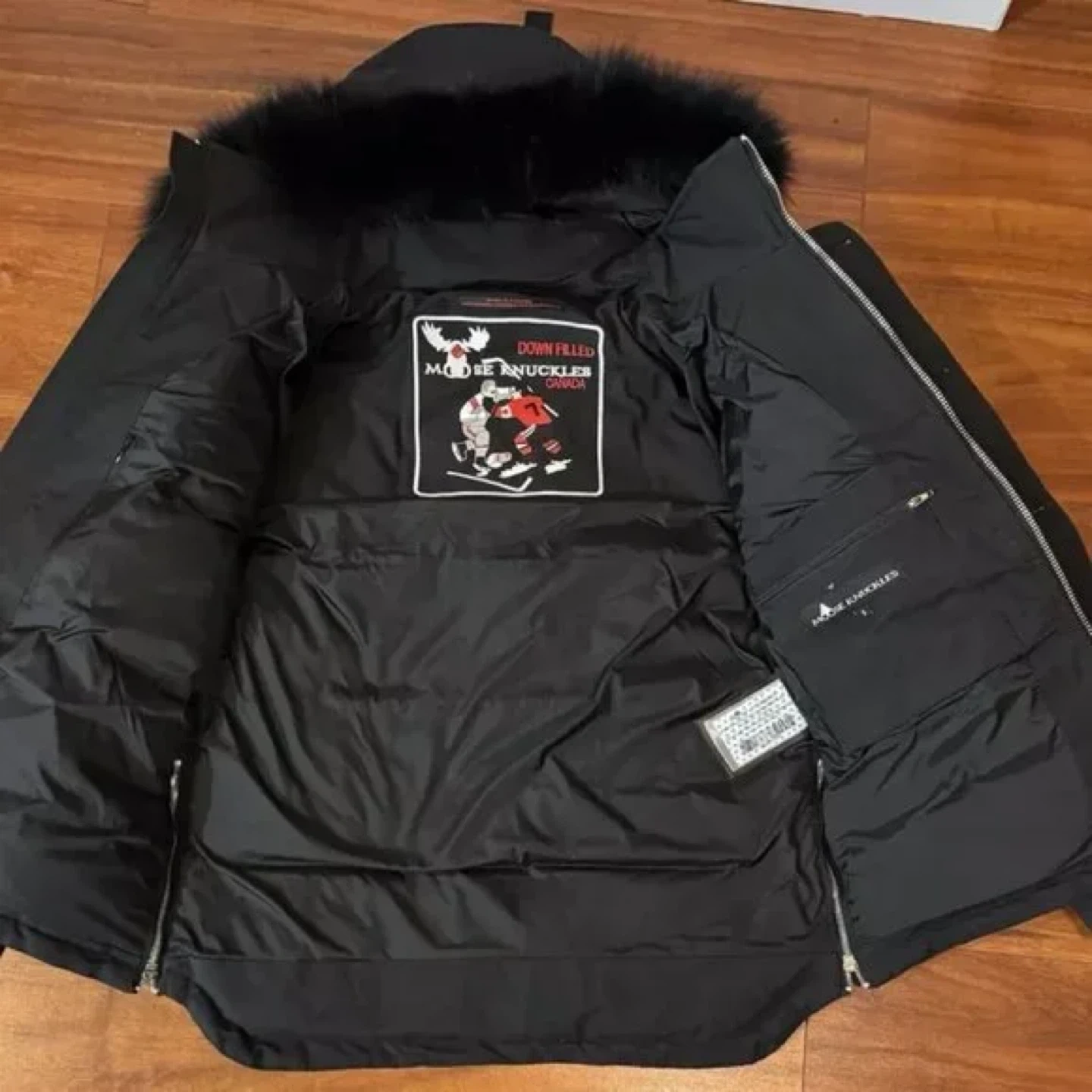 Selling a Moose Knuckles down-filled bomber jacket! It's in brand new condition and ready for the cold weather. The jacket features a fur-trimmed hood and the iconic Moose Knuckles logo on the sleeve. It's a stylish and warm choice for winter