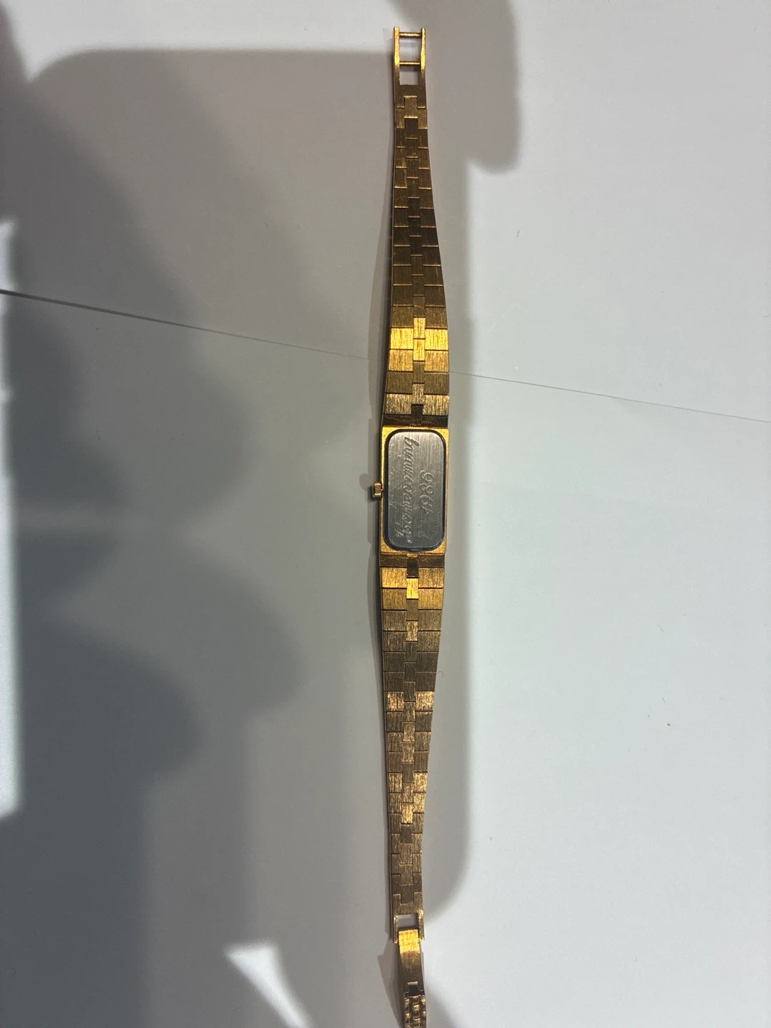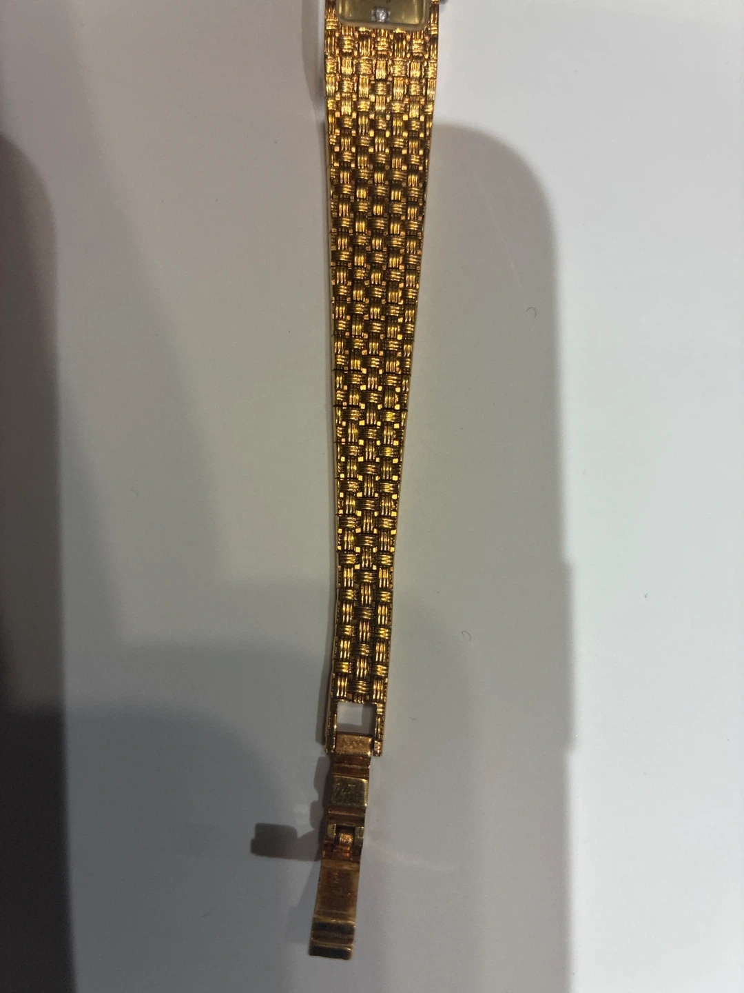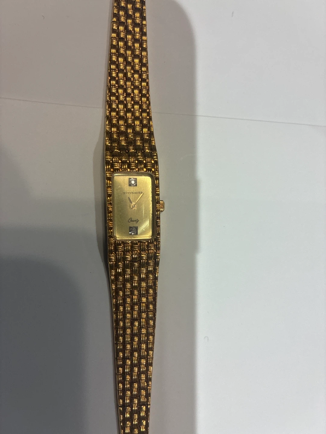 Vintage.This is a Wittnauer quartz watch with a gold tone finish. It features a rectangular face and a woven band. The watch is in good condition.