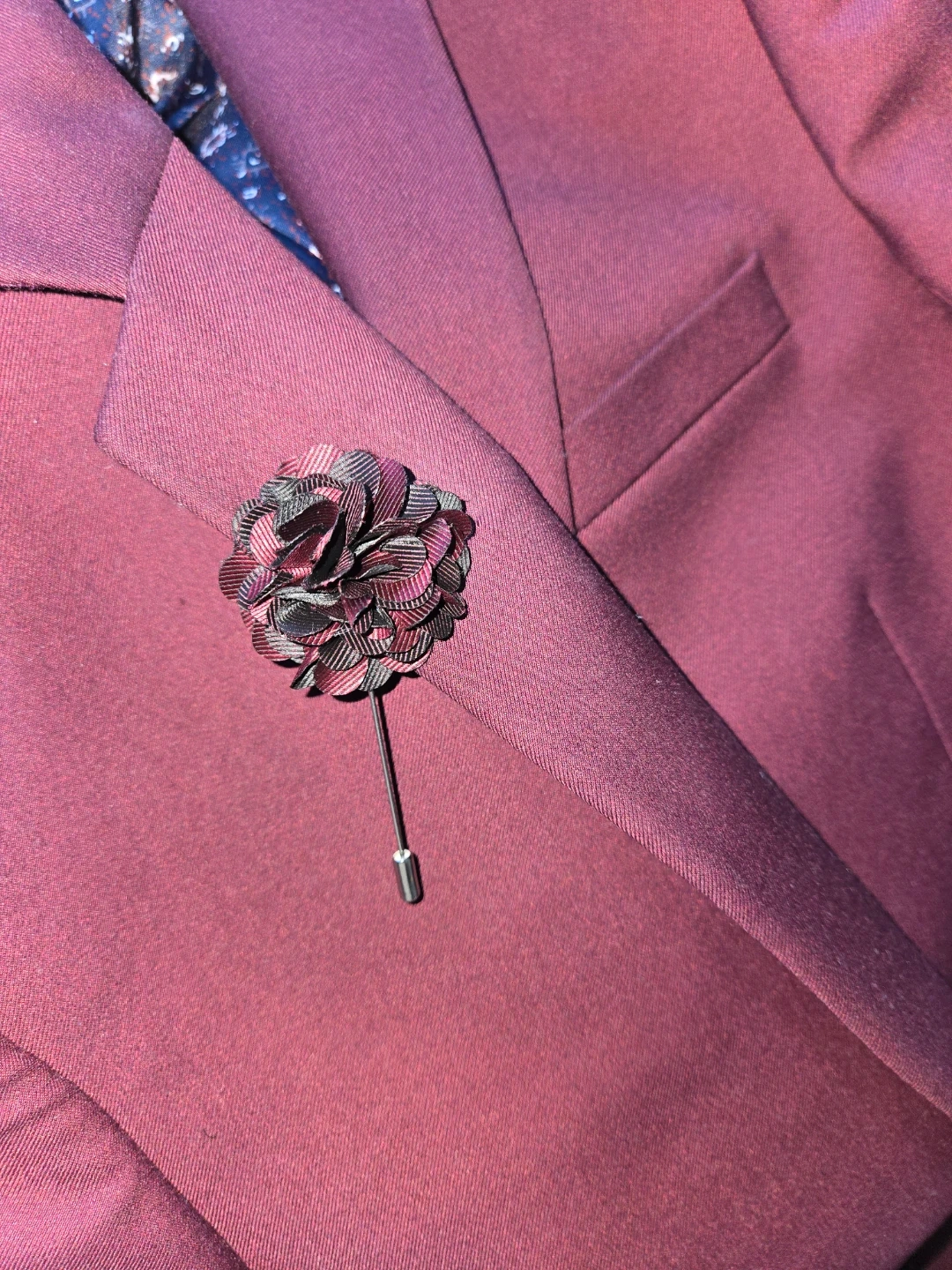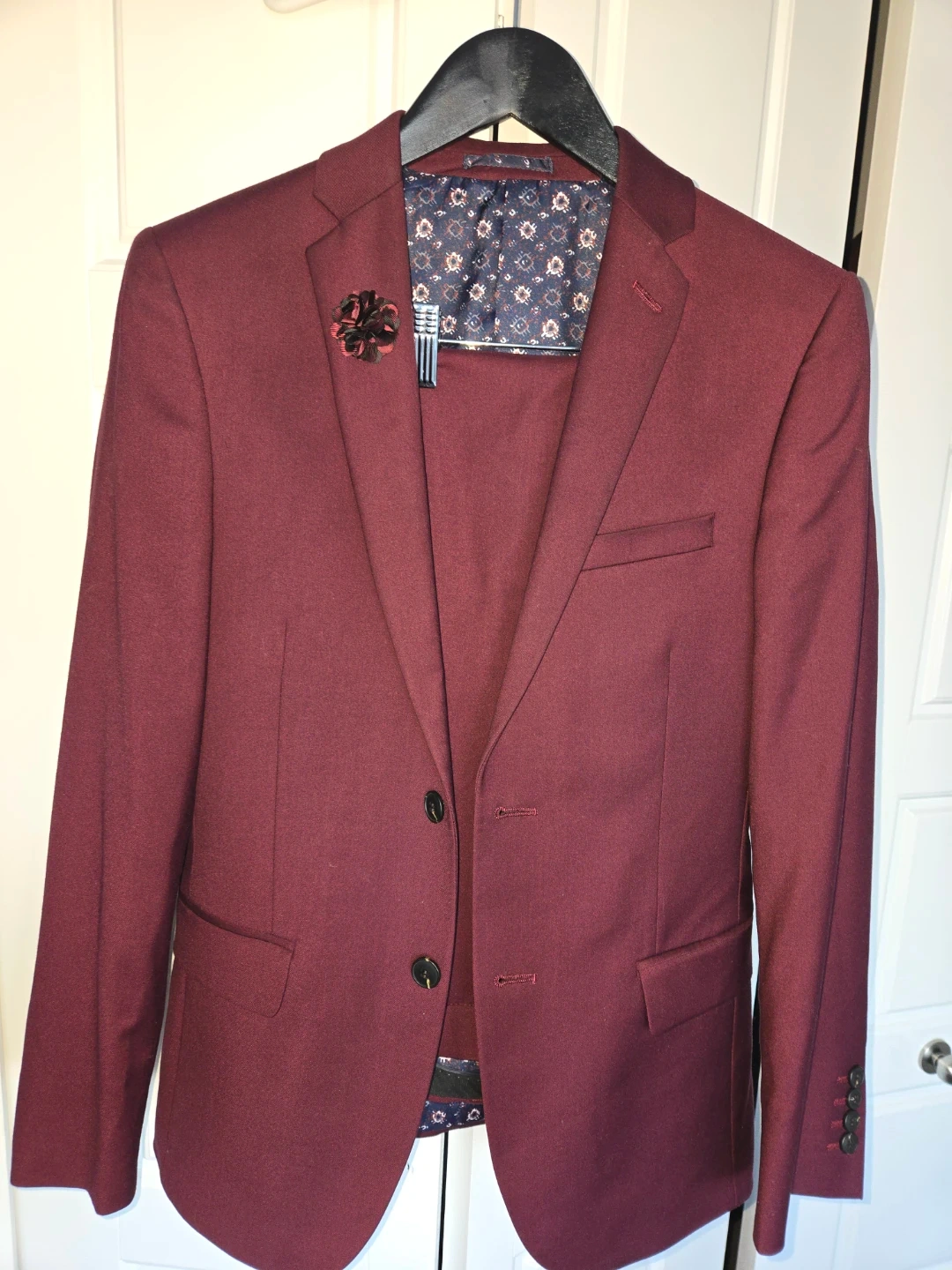 Selling a stylish men’s slim fit formal suit set that includes a blazer, matching pants and pin. Perfect for weddings, formal events, prom, or business occasions.