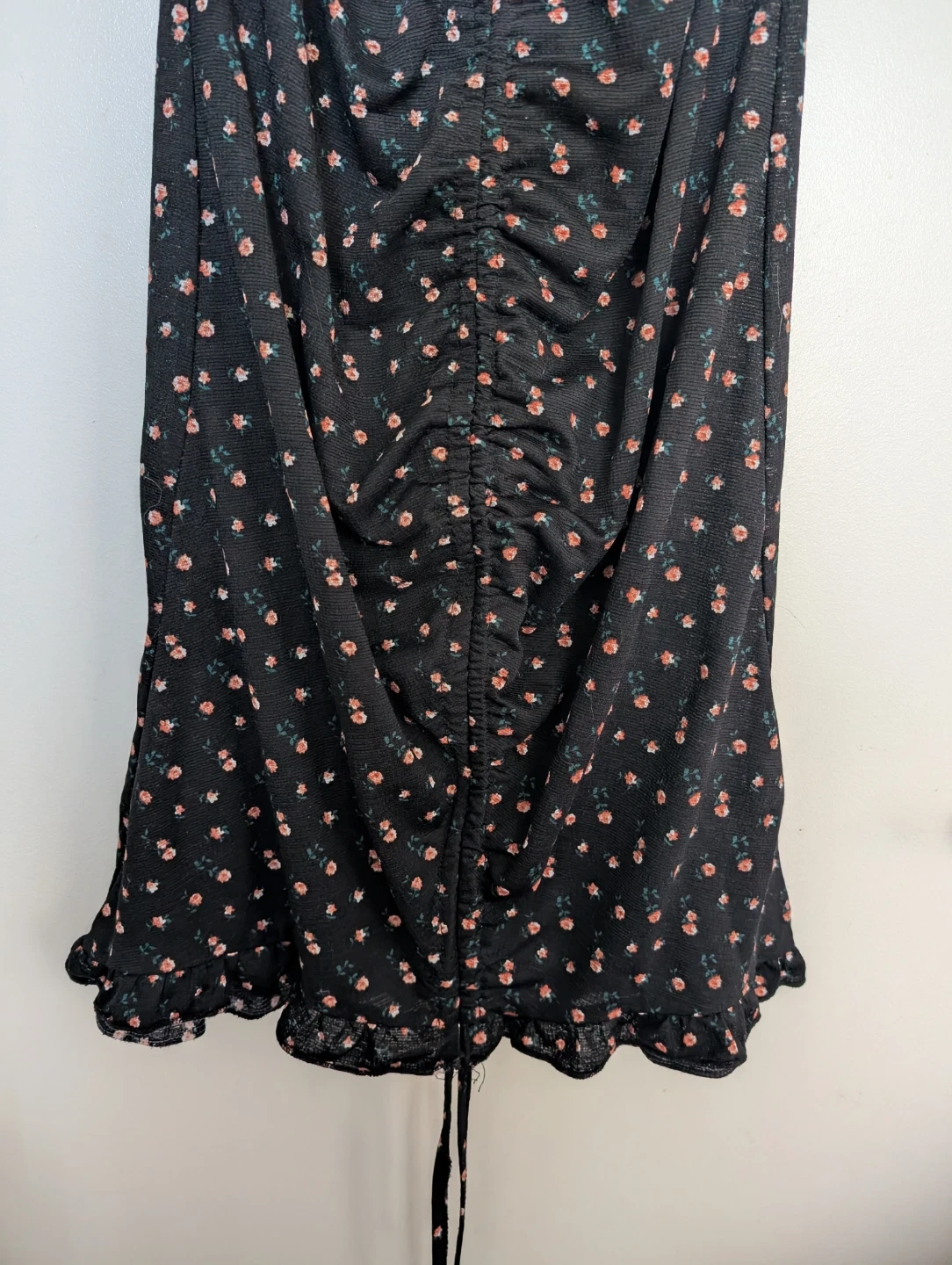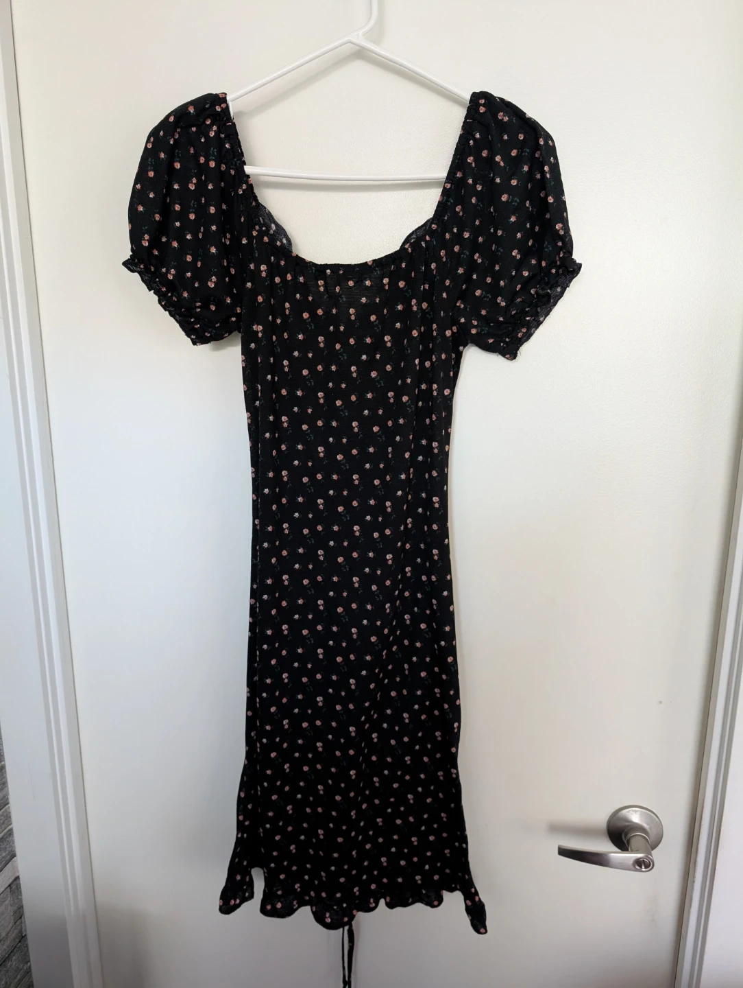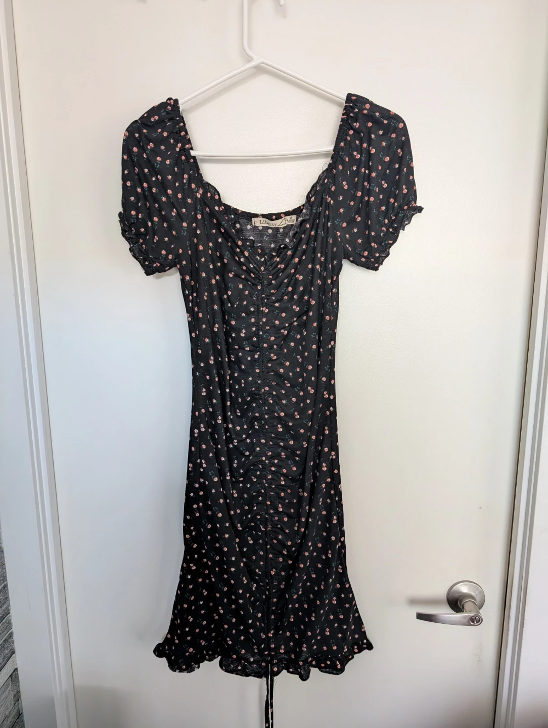This Liberty Love midi dress features a black base with a delicate floral print. It has short puff sleeves and a ruched front detail with a tie at the hem. The square neckline gives it a flattering silhouette. Size medium.