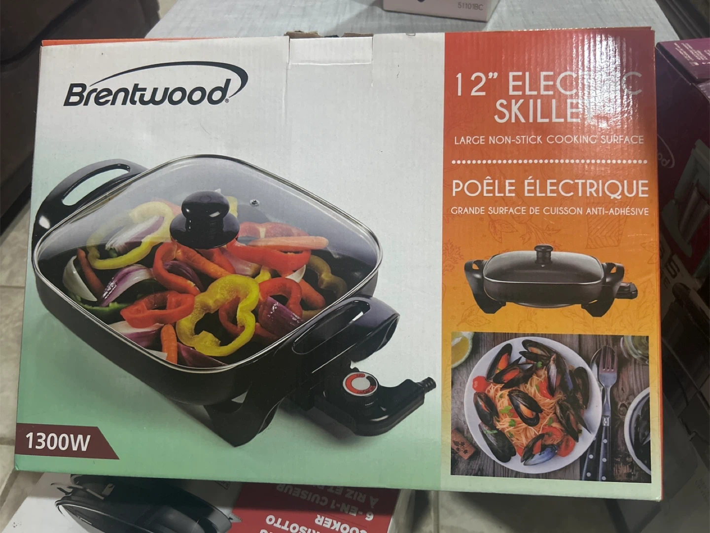 Selling a brand new Brentwood 12" electric skillet. It features a large non-stick cooking surface and is 1300W. The box includes the skillet and lid. For more details call or DM at 437-734-1321