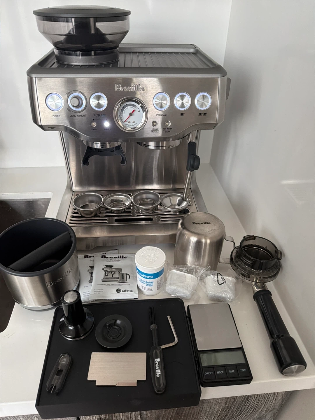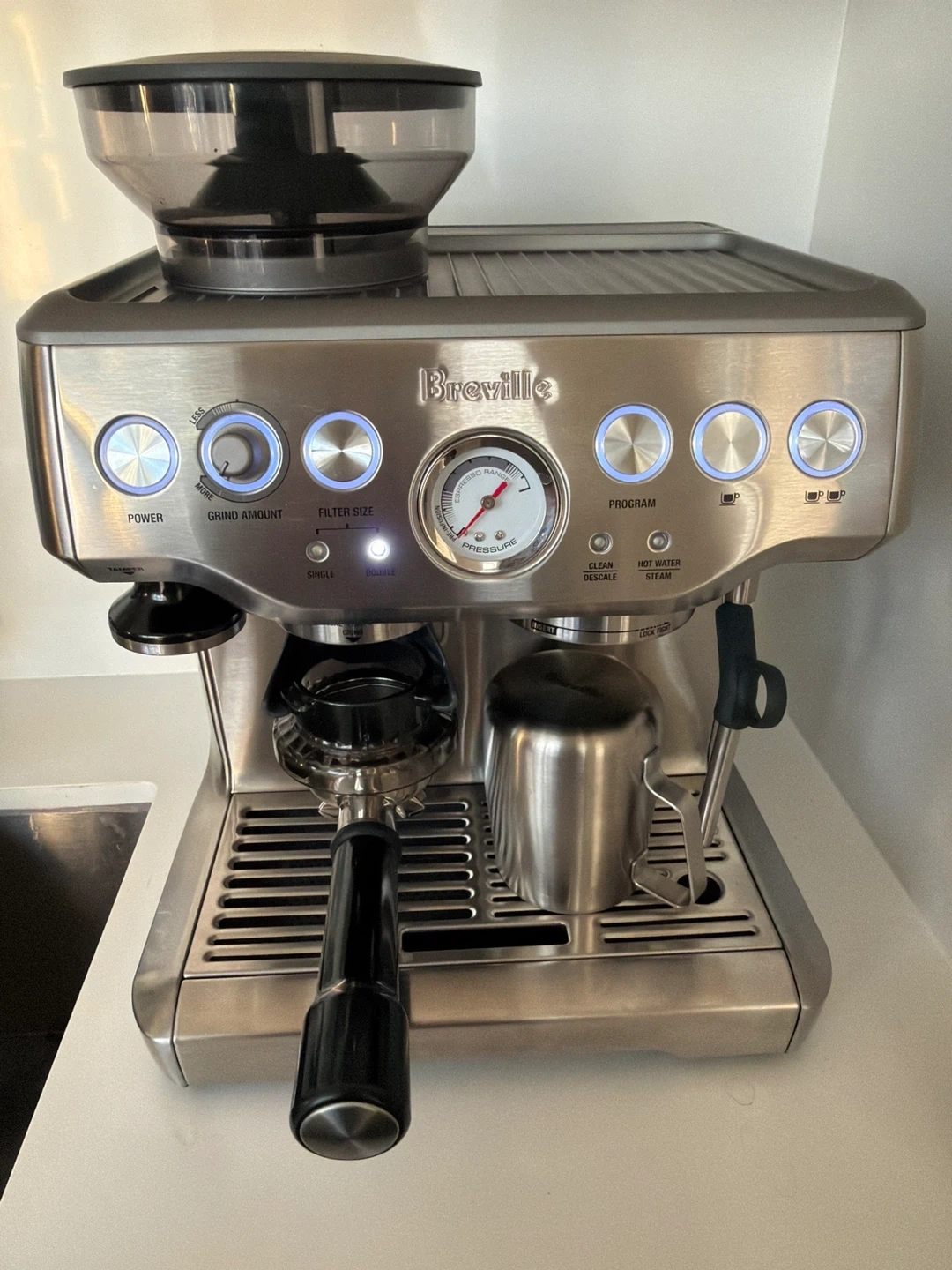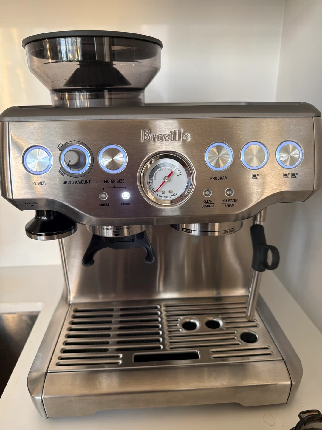 277Selling a Breville Barista Express Espresso machine. It's in great condition and ready to make delicious coffee! Comes with all the accessories shown in the photos, including the tamper, milk jug, knock box, weighing scale, matt, descaled, extra filters, cleaning tablets and portafilter. It is still under warranty so will give you the invoice with the purchase in case you need it!