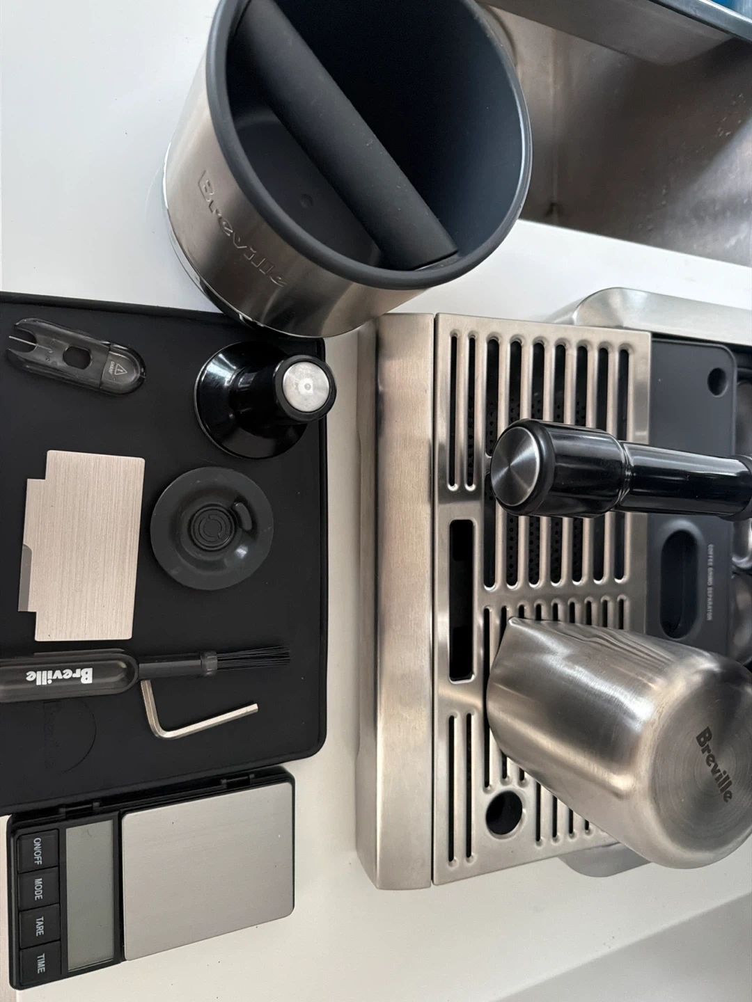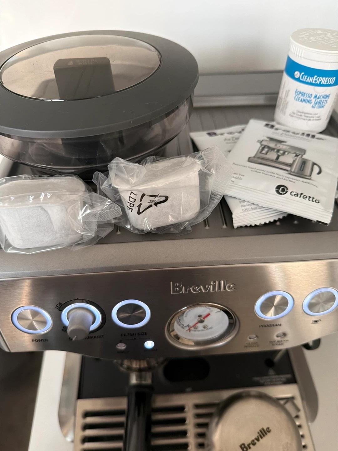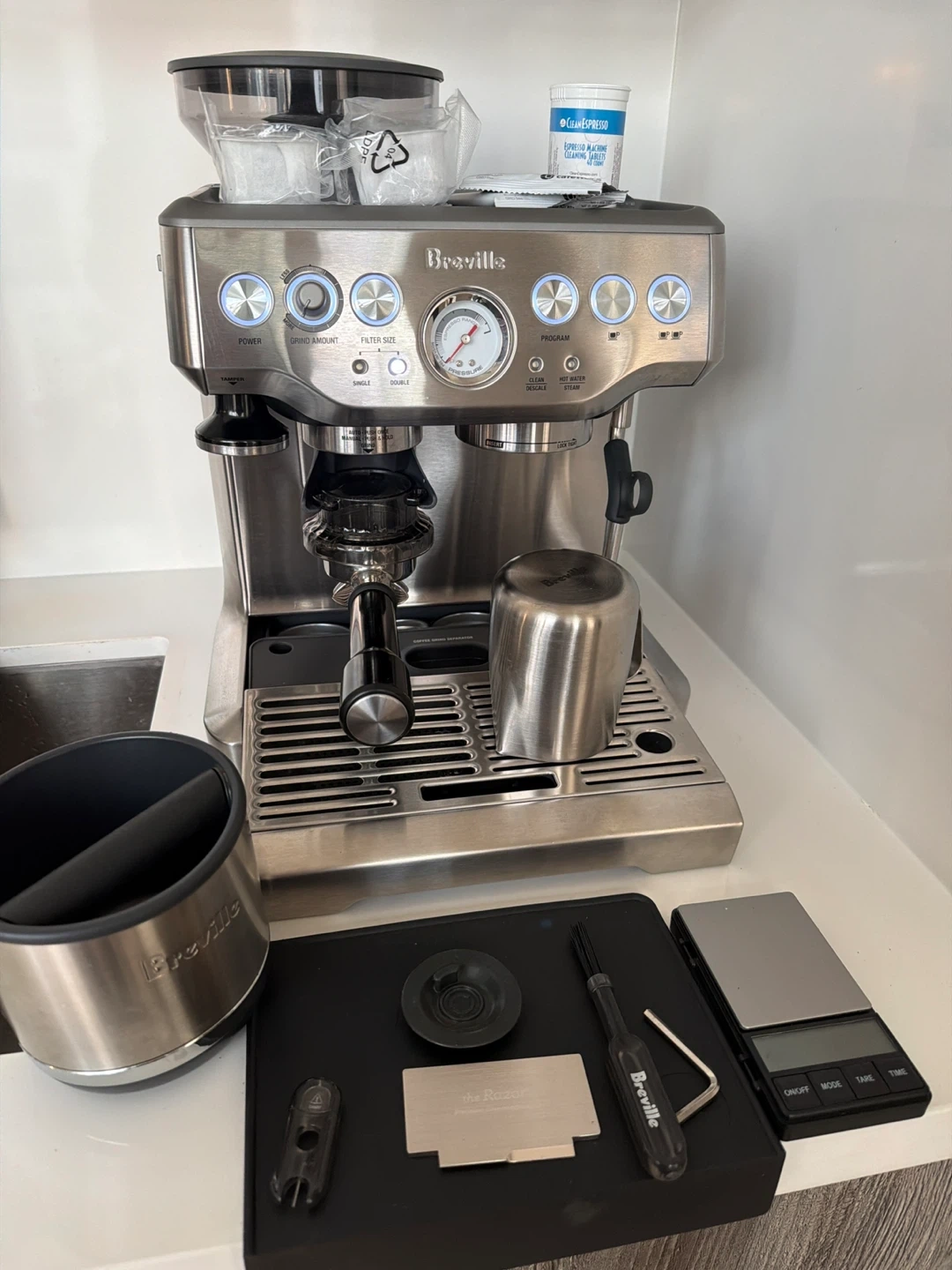 277Selling a Breville Barista Express Espresso machine. It's in great condition and ready to make delicious coffee! Comes with all the accessories shown in the photos, including the tamper, milk jug, knock box, weighing scale, matt, descaled, extra filters, cleaning tablets and portafilter. It is still under warranty so will give you the invoice with the purchase in case you need it!