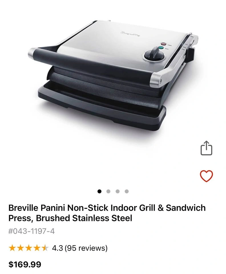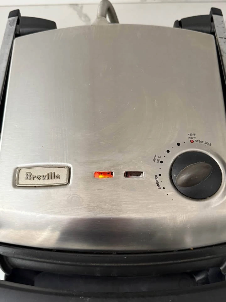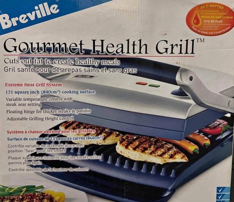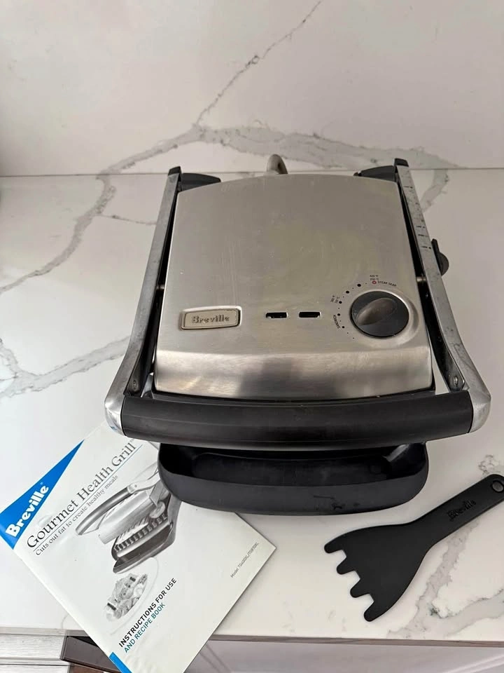 Breville Gourmet Health Grill. Panini press function allows you to set the height of the top grill. Adjustable temperatures. For indoor use: plugs in. Lightly used works perfectly. Includes detachable drip tray, plastic flipper, and owners manual (box not included but I found a picture online so you can see the features). Retails for $170 at Canadian Tire