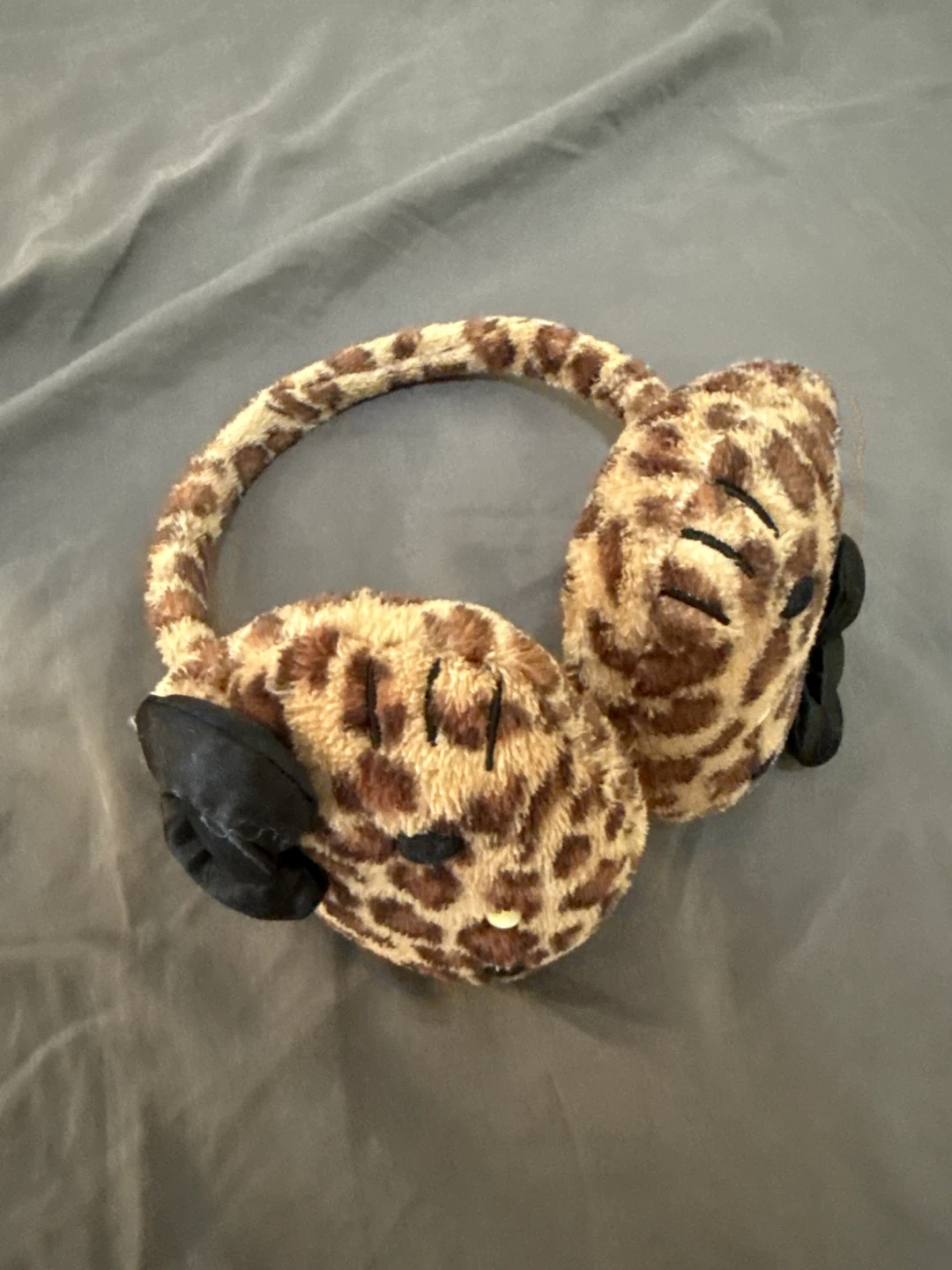 Cute leopard print earmuffs designed for warmth and style. They're soft and plush, perfect for keeping ears cozy on chilly days. The ear coverings have stitched facial details.