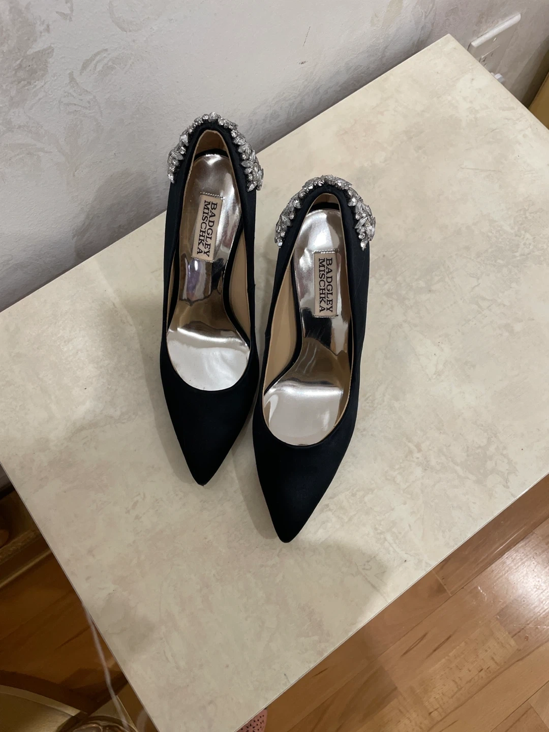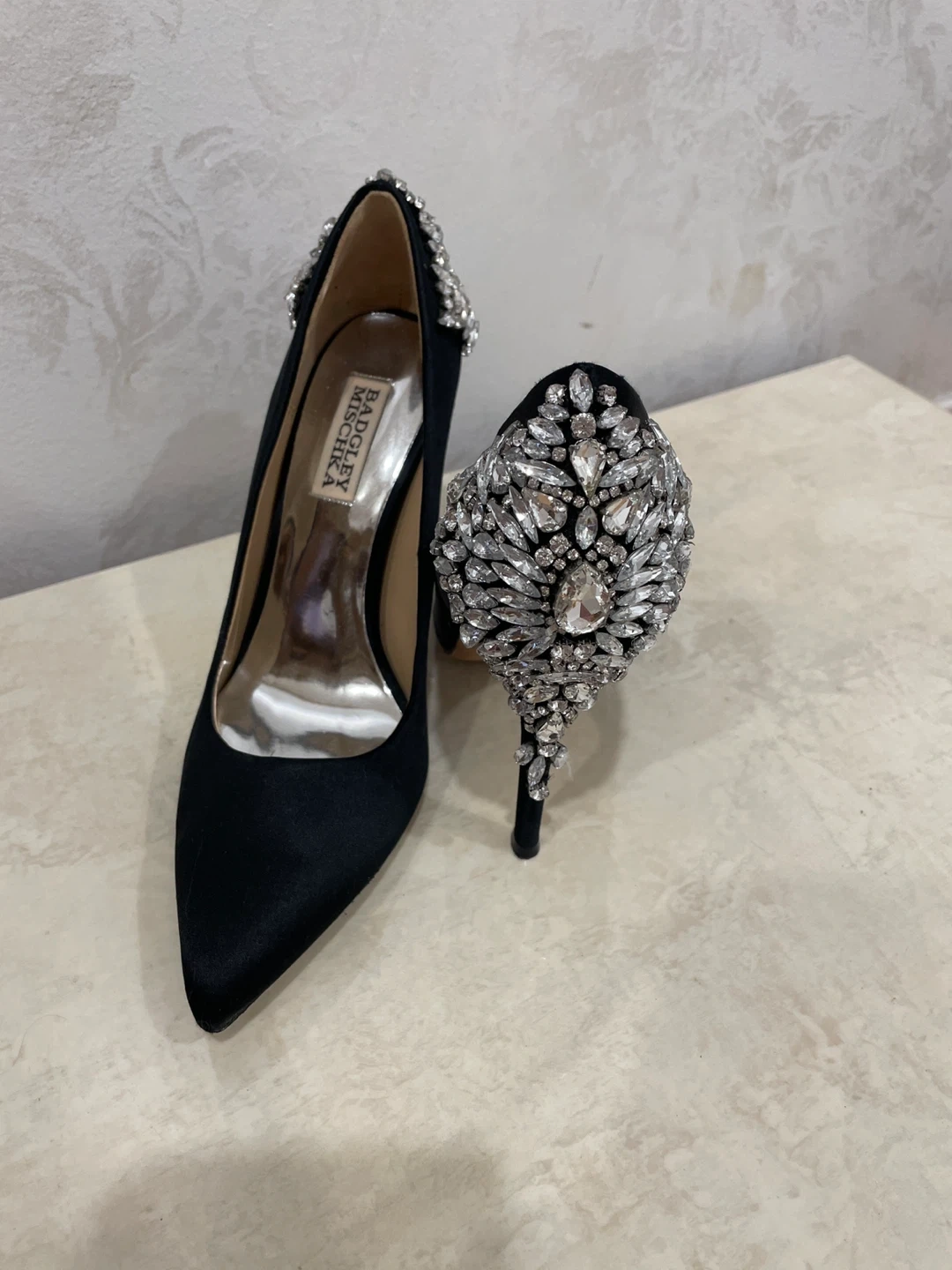 These are Badgley Mischka black satin pointed-toe heels. They feature dazzling crystal embellishments on the heel and collar. A stunning pair for any special occasion!