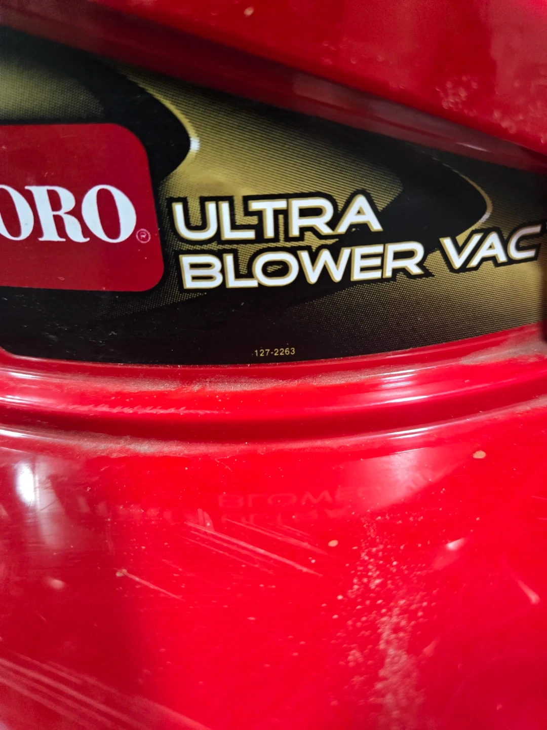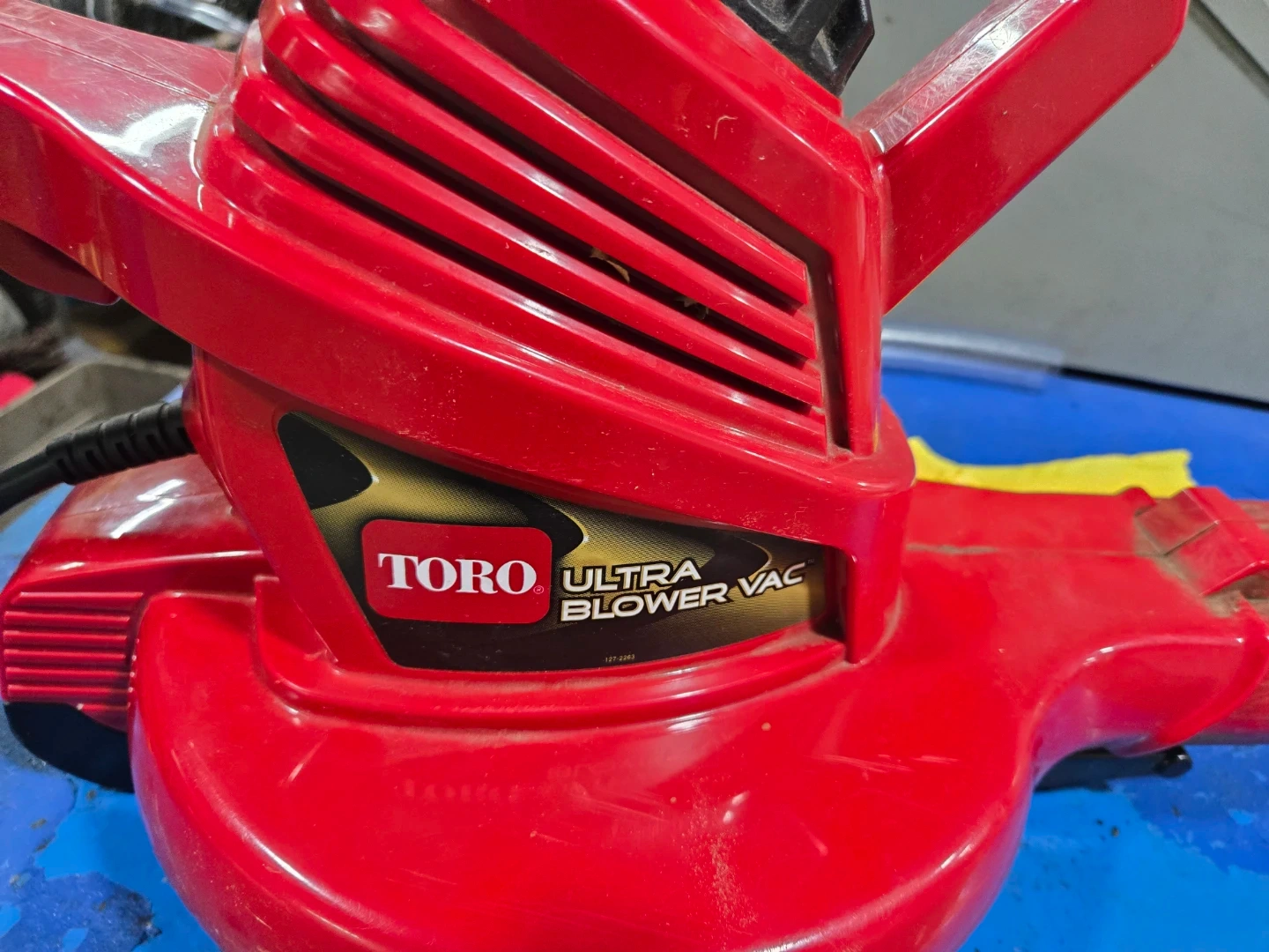 This is a red Toro Ultra Blower Vac. It's a corded electric model. This tool is useful for clearing leaves and debris from your yard.