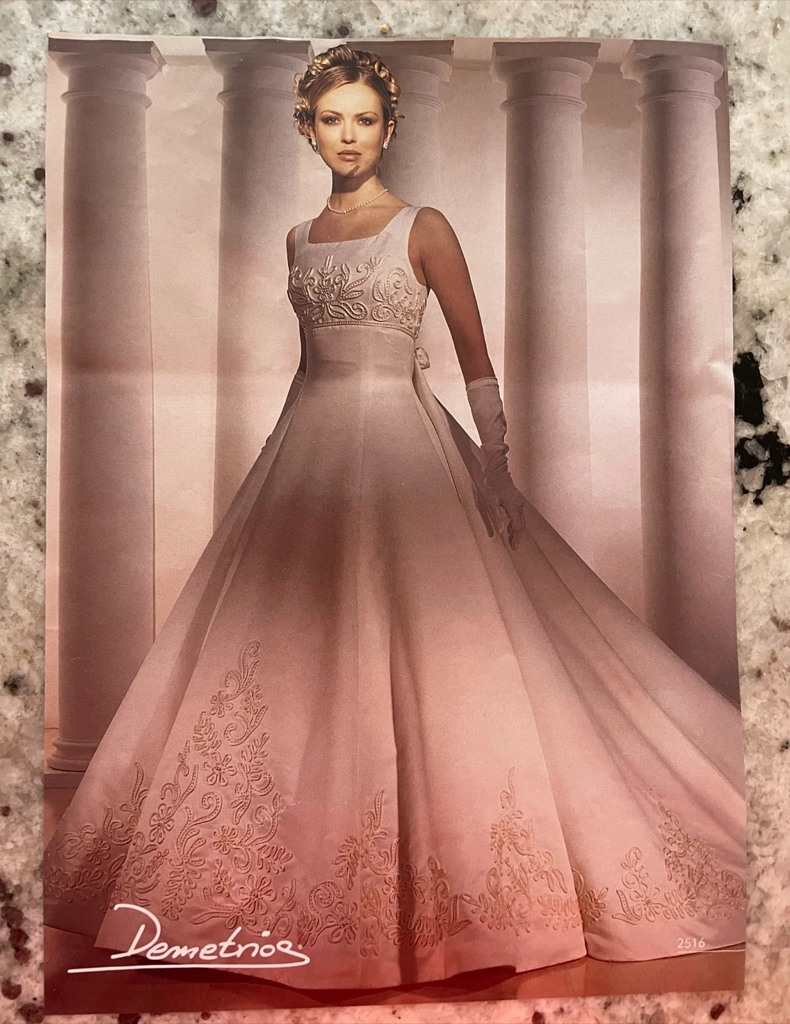 Original Demetrios Gown - preserved in box - unboxed for sake of photos. Detachable train, intricate details, wrist holder for ease of carrying train or removal. Satin , no stains. Pickup in Burlington.