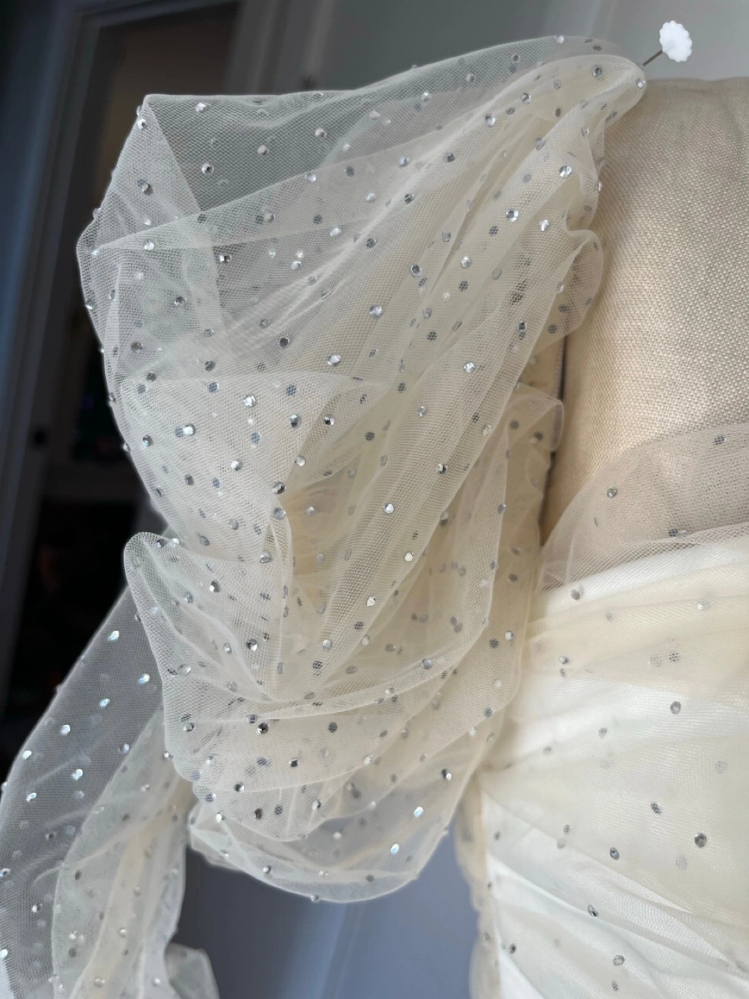 This is a rare and completely sold out, and discontinued House of CB mini dress called Milana. It is a beautiful off-white colour with a deep V neck and sheer sleeves. It has a ruched bodycon fit and is a perfect bridal dress.